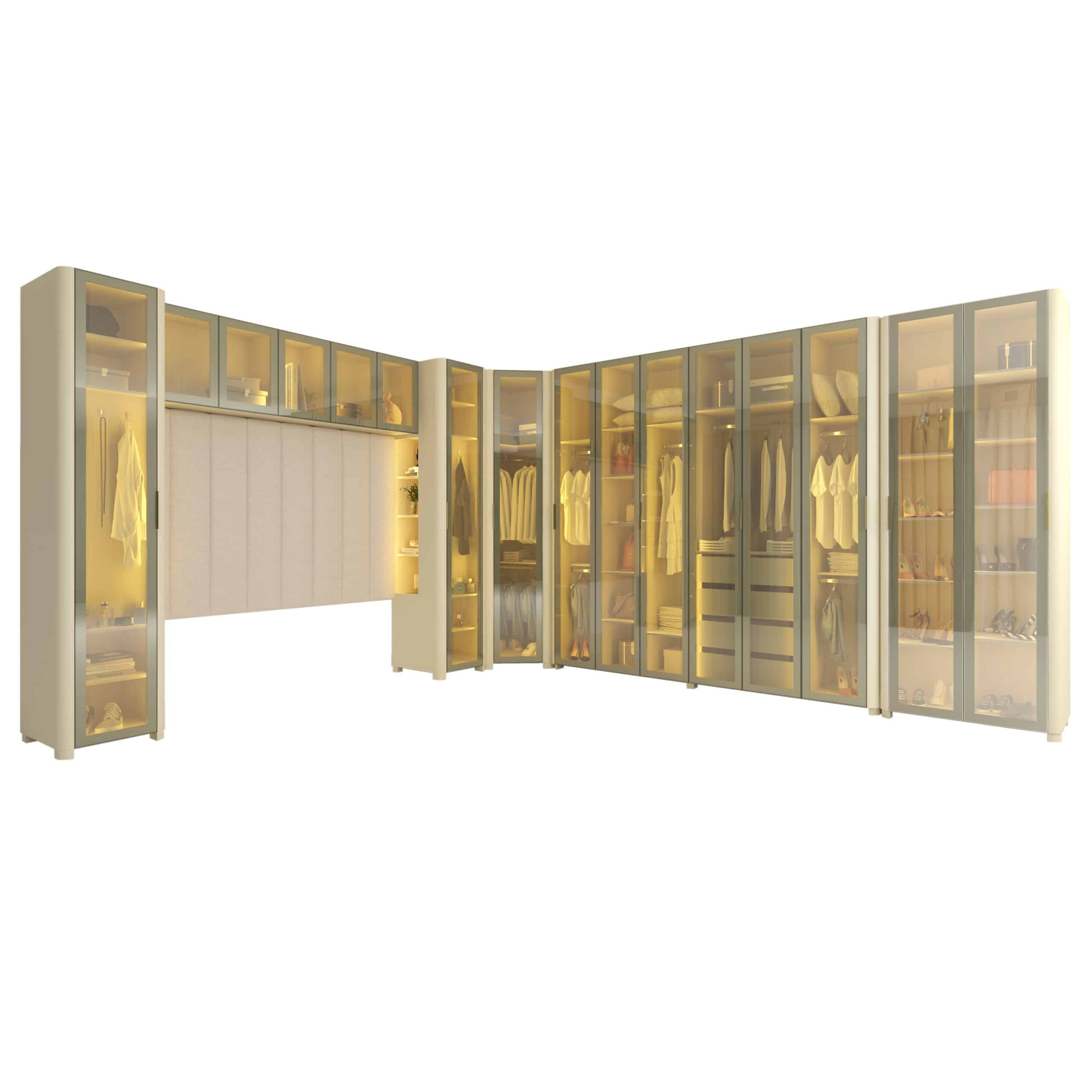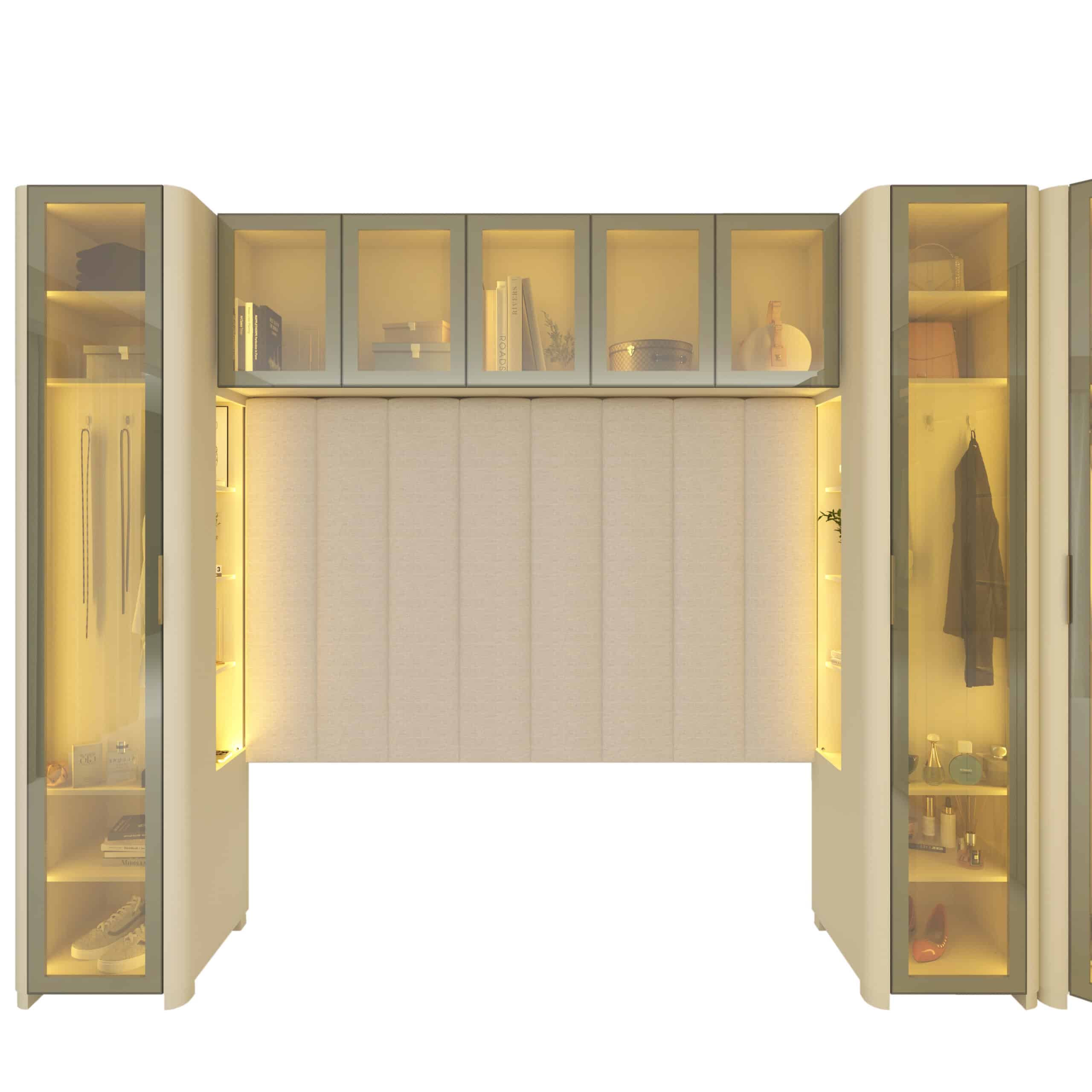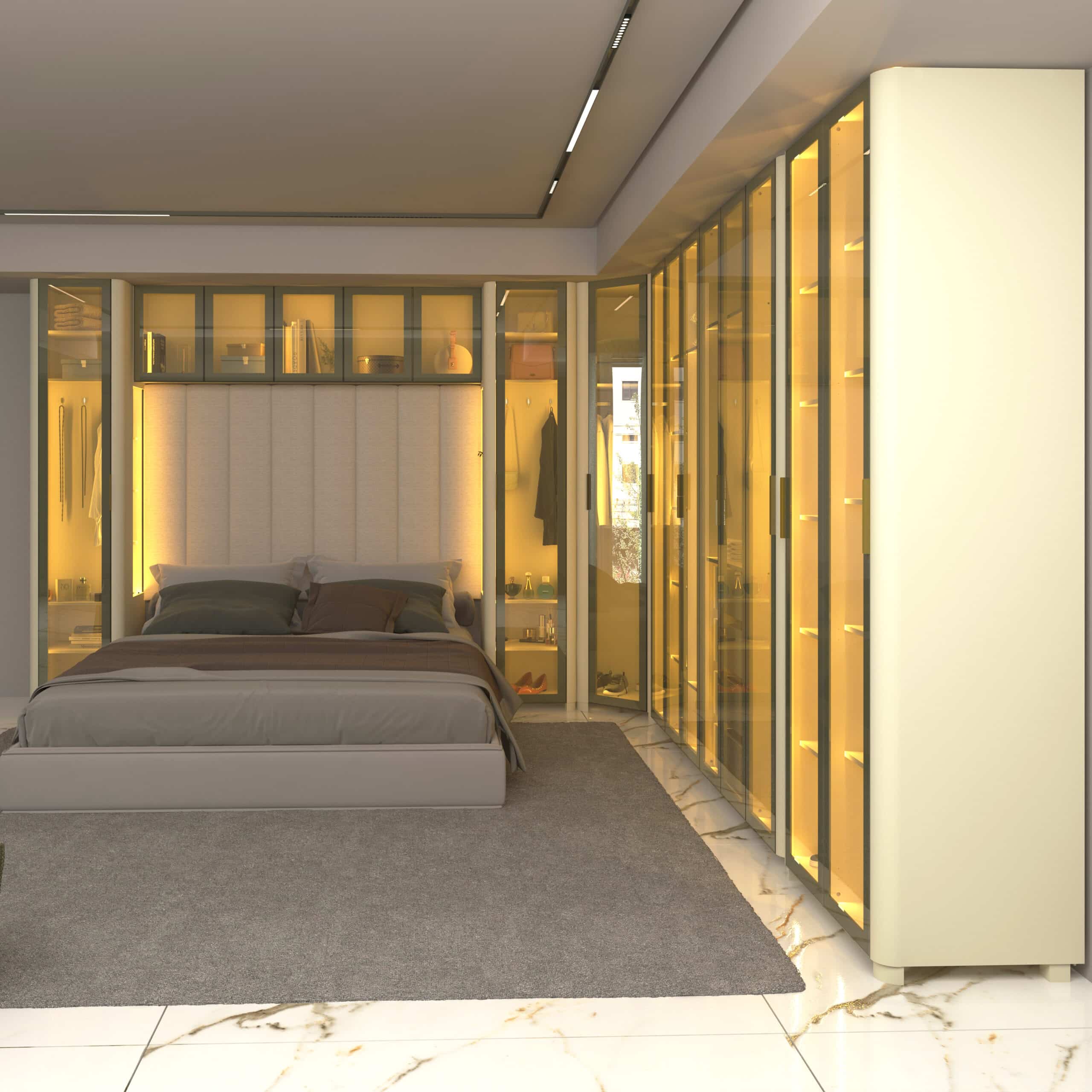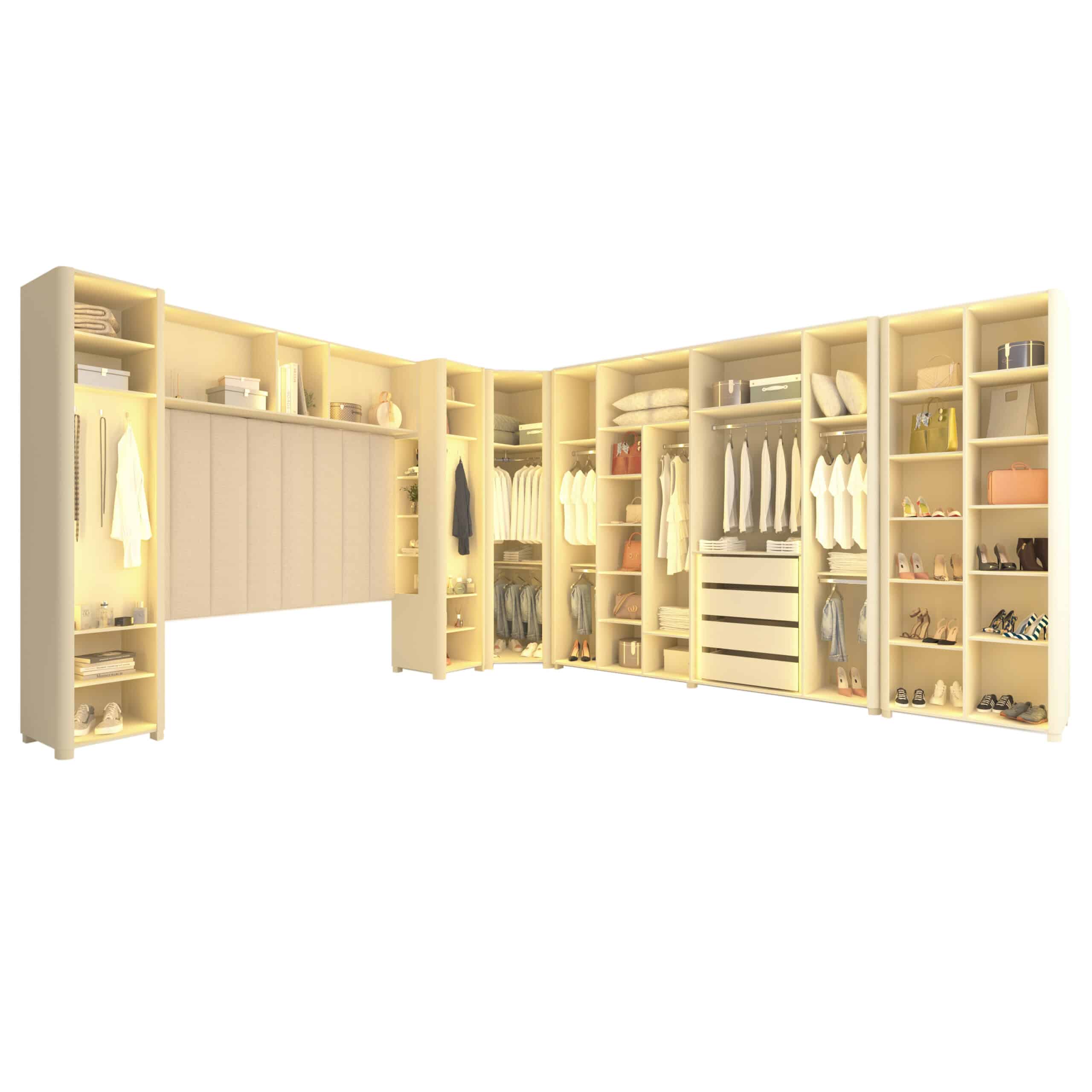 Composto pelo Roupeiro INNOVA 6 Portas, Canto INNOVA,Roupeiro INNOVA 1 porta com Nicho, Aéreo Concept e Cabeceira Concept, o conjunto se destaca pela integração fluida entre funcionalidade e estética.