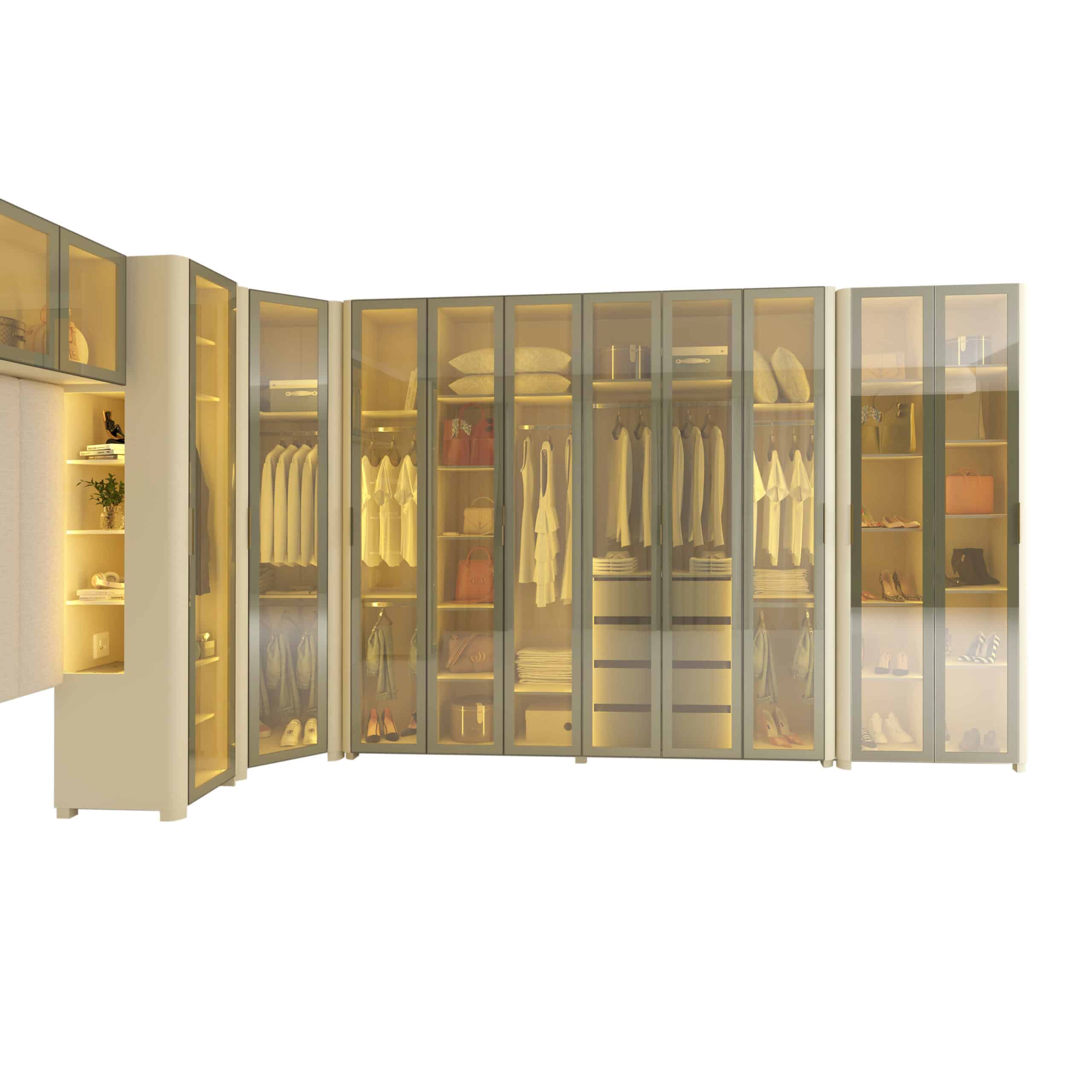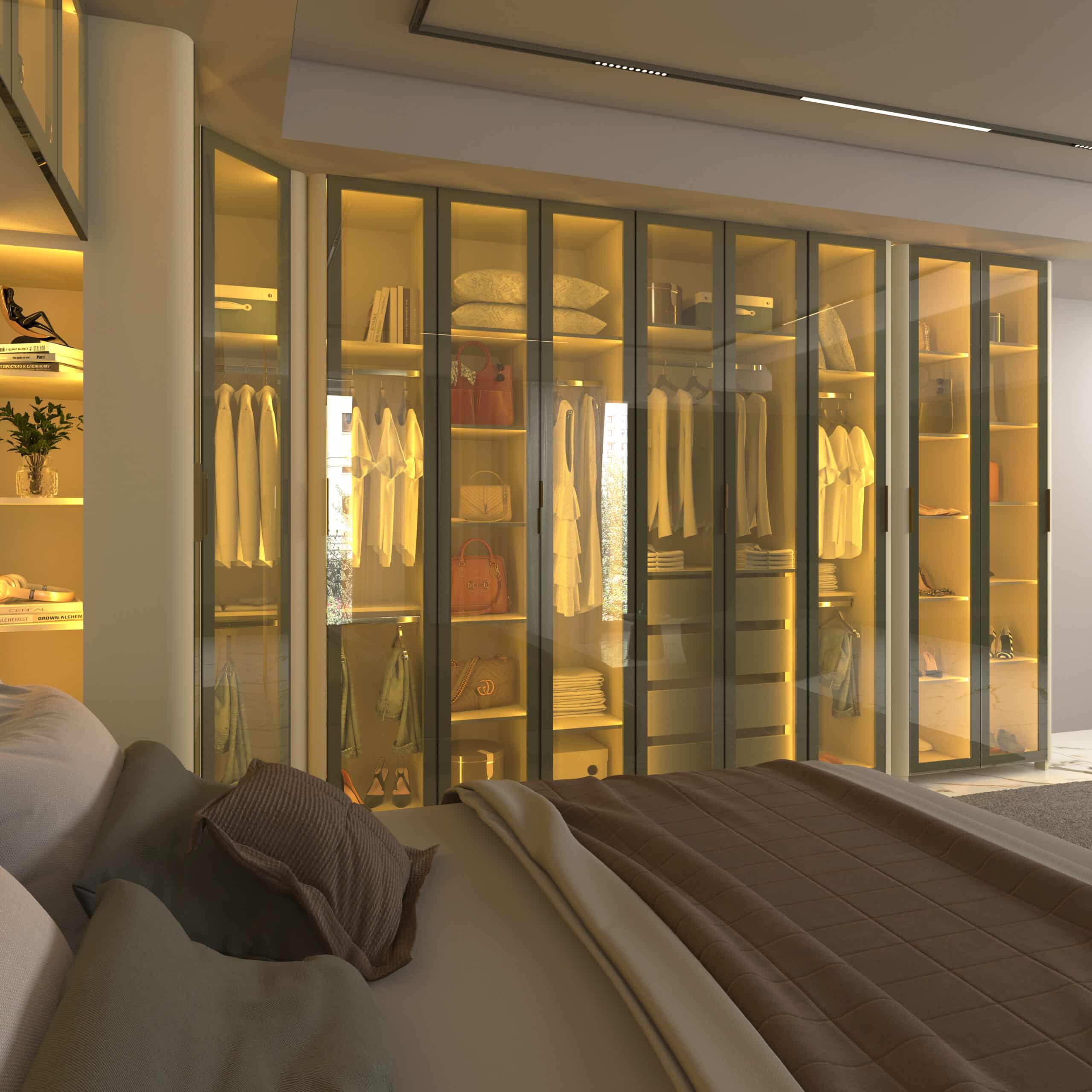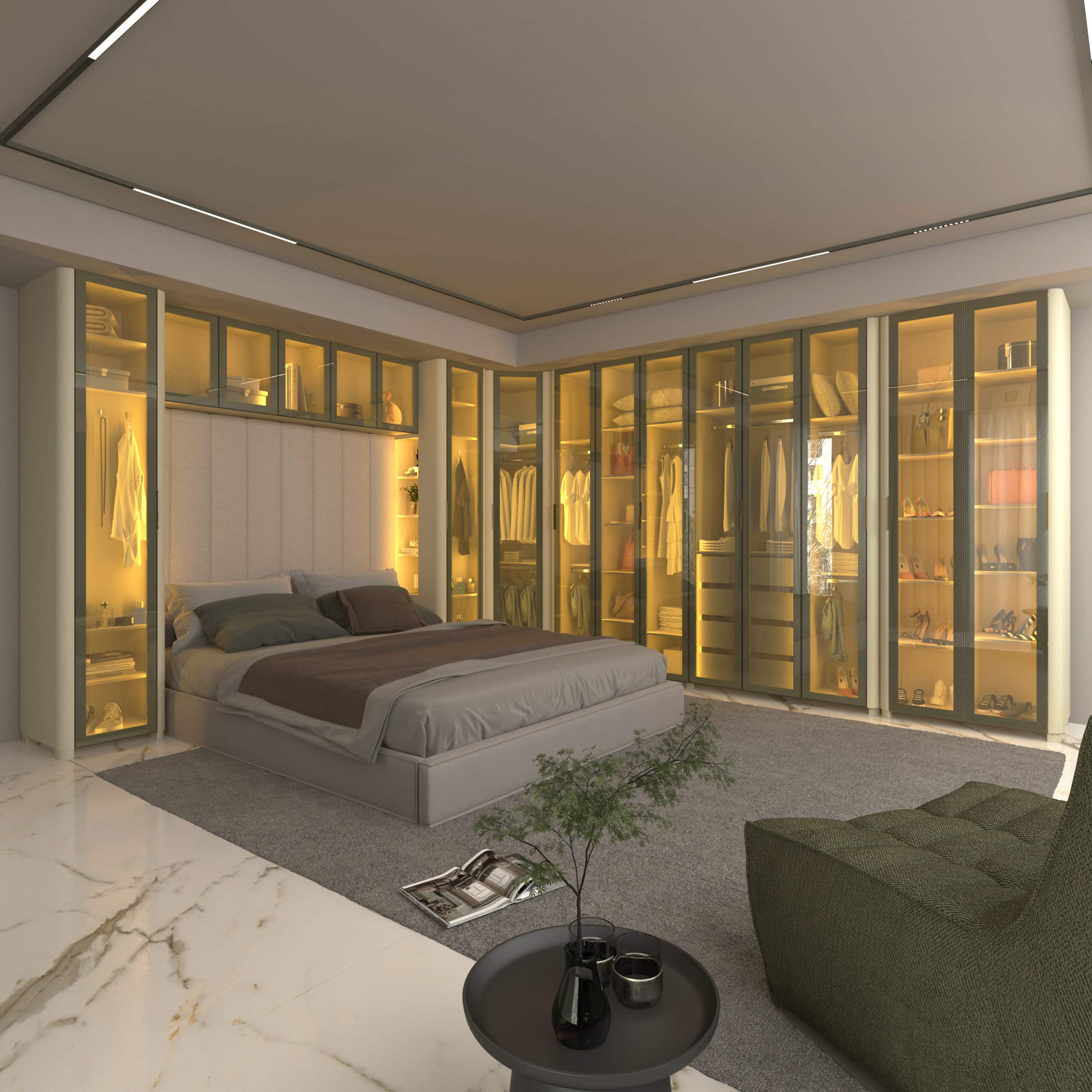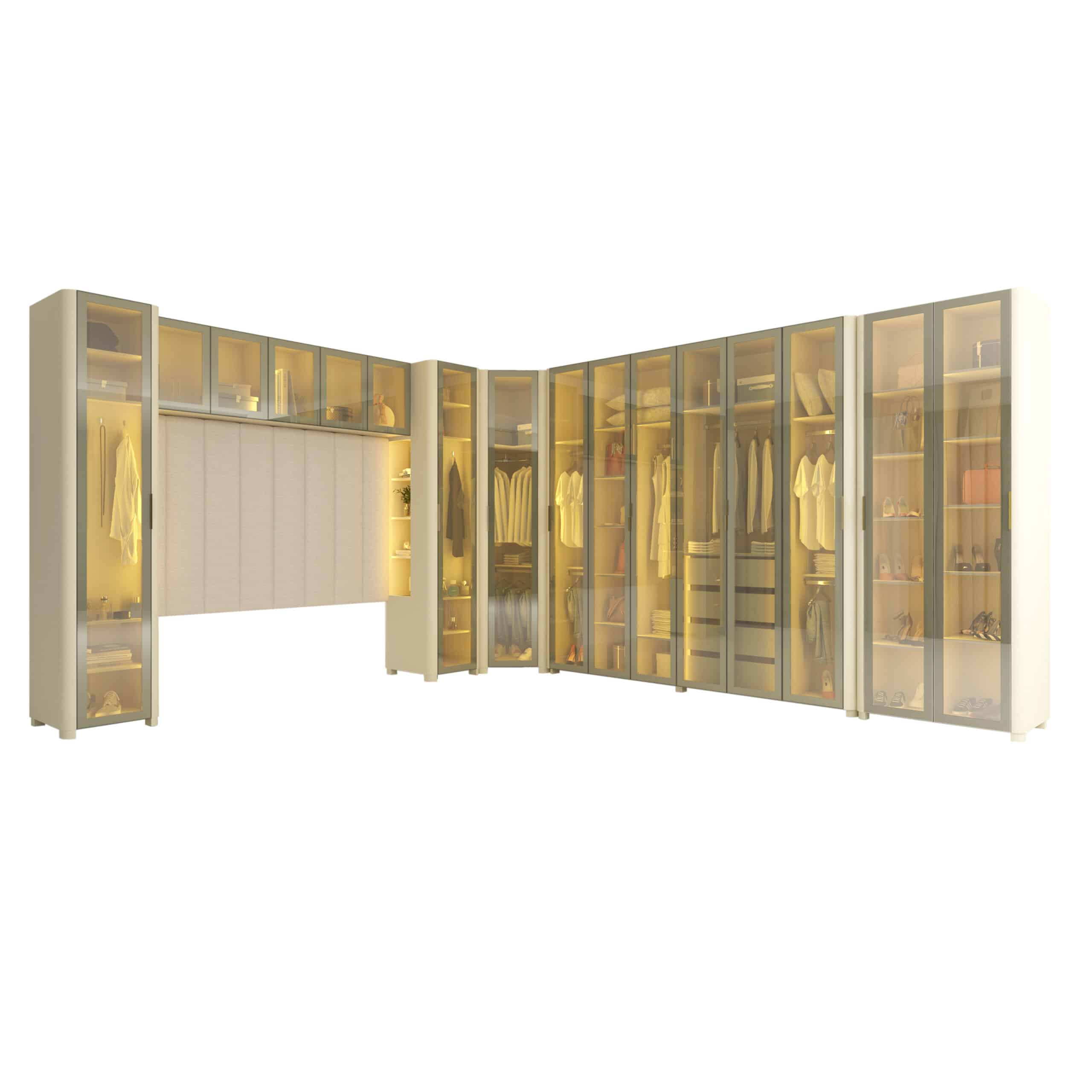 Composto pelo Roupeiro INNOVA 6 Portas, Canto INNOVA,Roupeiro INNOVA 1 porta com Nicho, Aéreo Concept e Cabeceira Concept, o conjunto se destaca pela integração fluida entre funcionalidade e estética.
