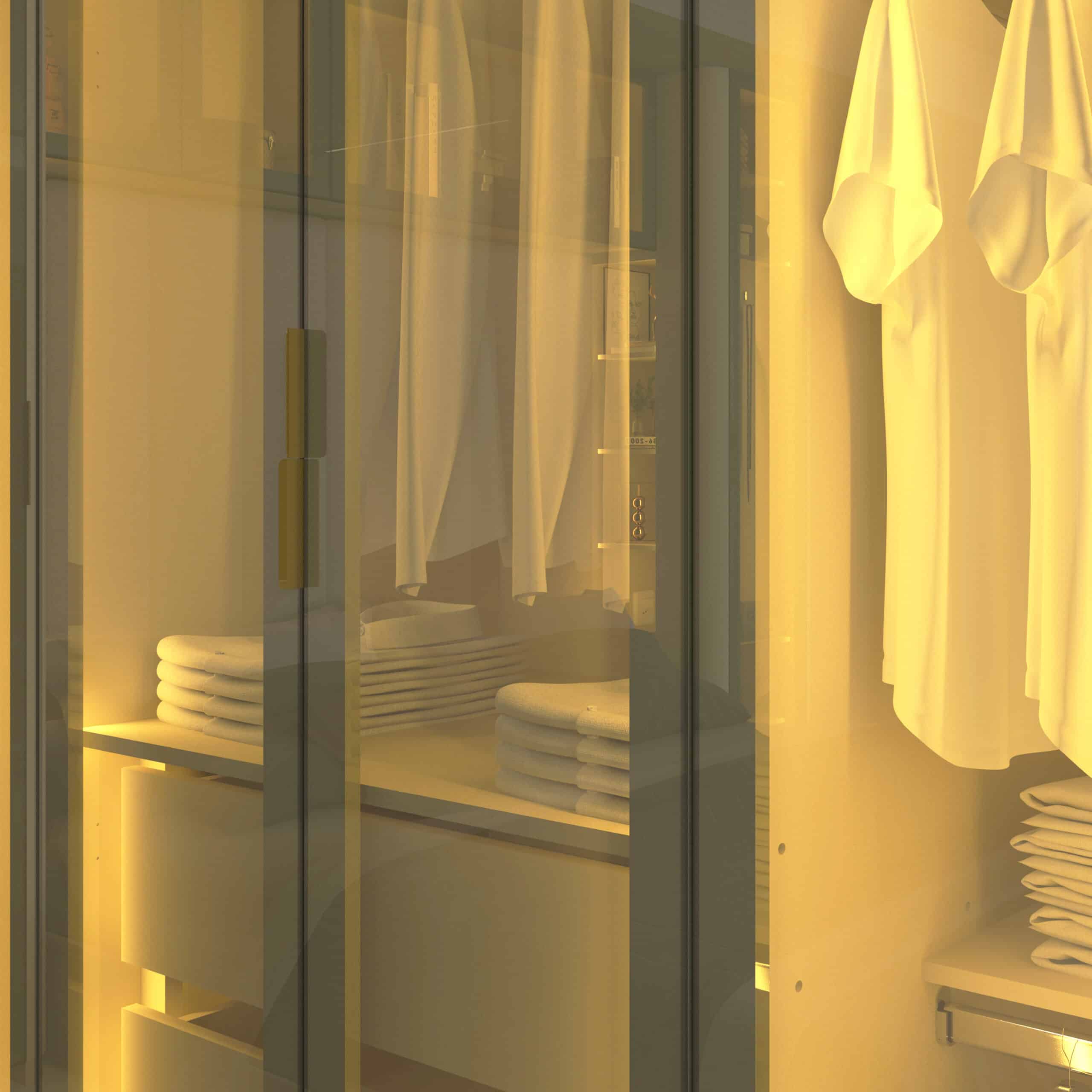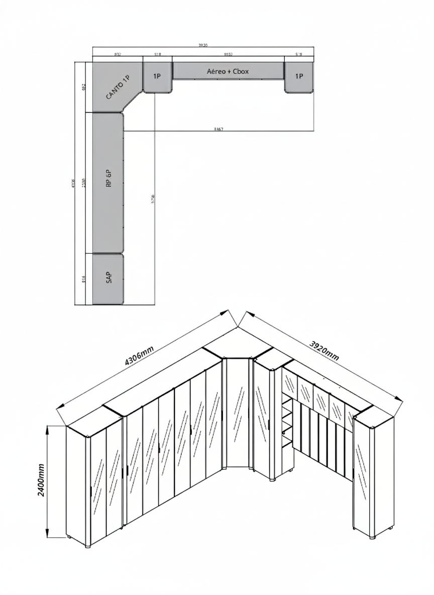 Produzido em 100% MDF, apresenta portas em vidro reflecta com moldura em alumínio, iluminação LED quente, puxadores metálicos e acabamento curvo, que conferem leveza e modernidade ao ambiente.