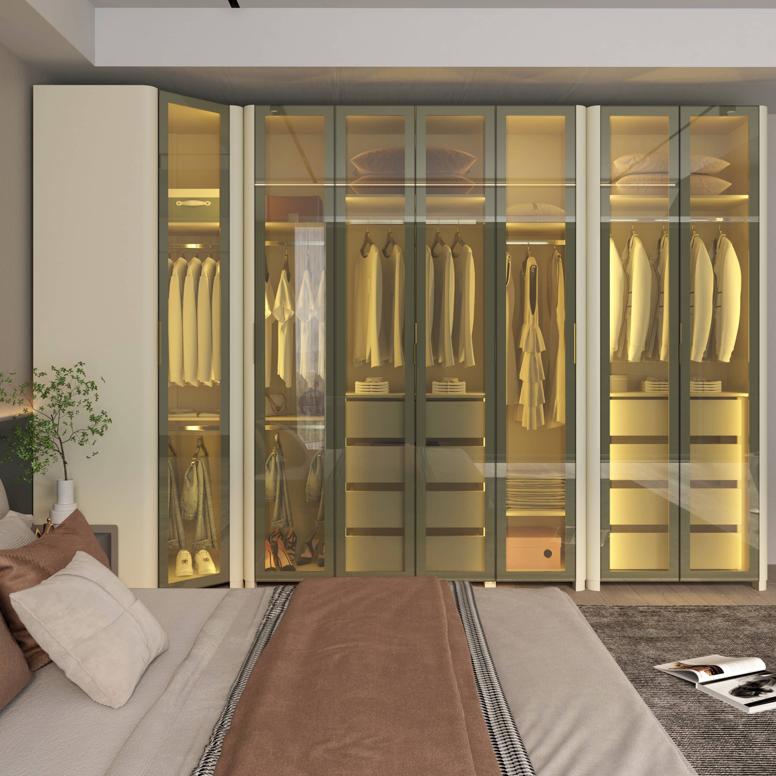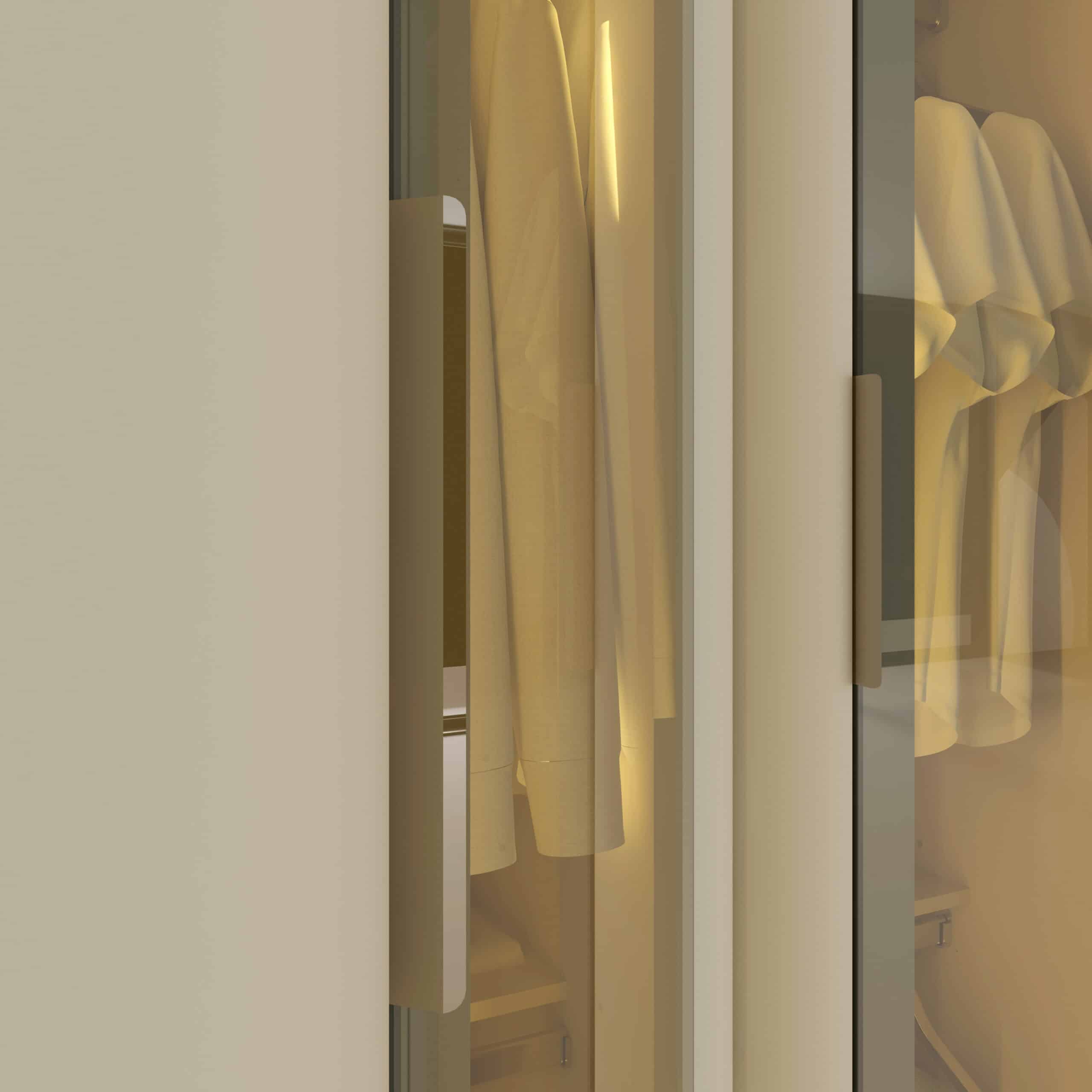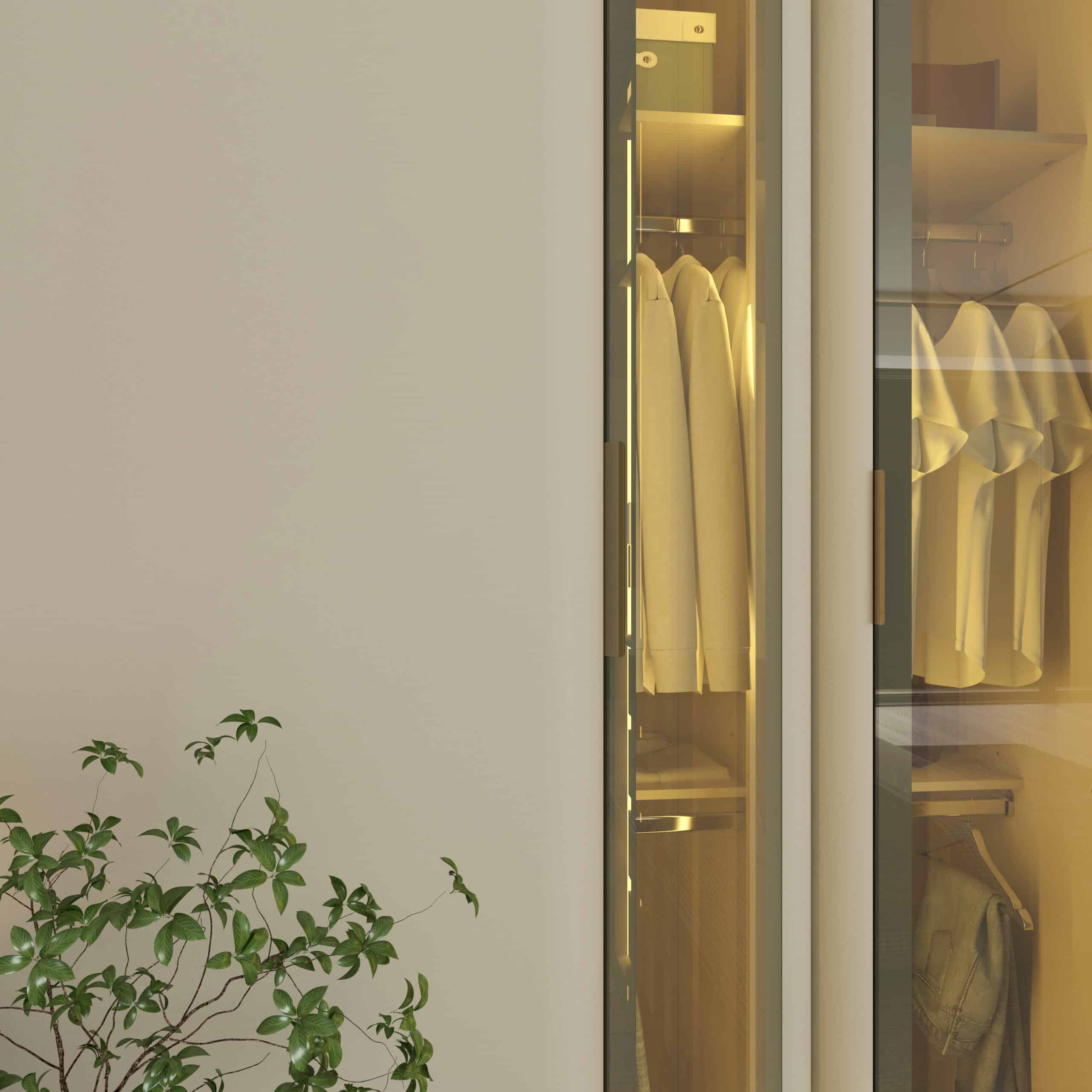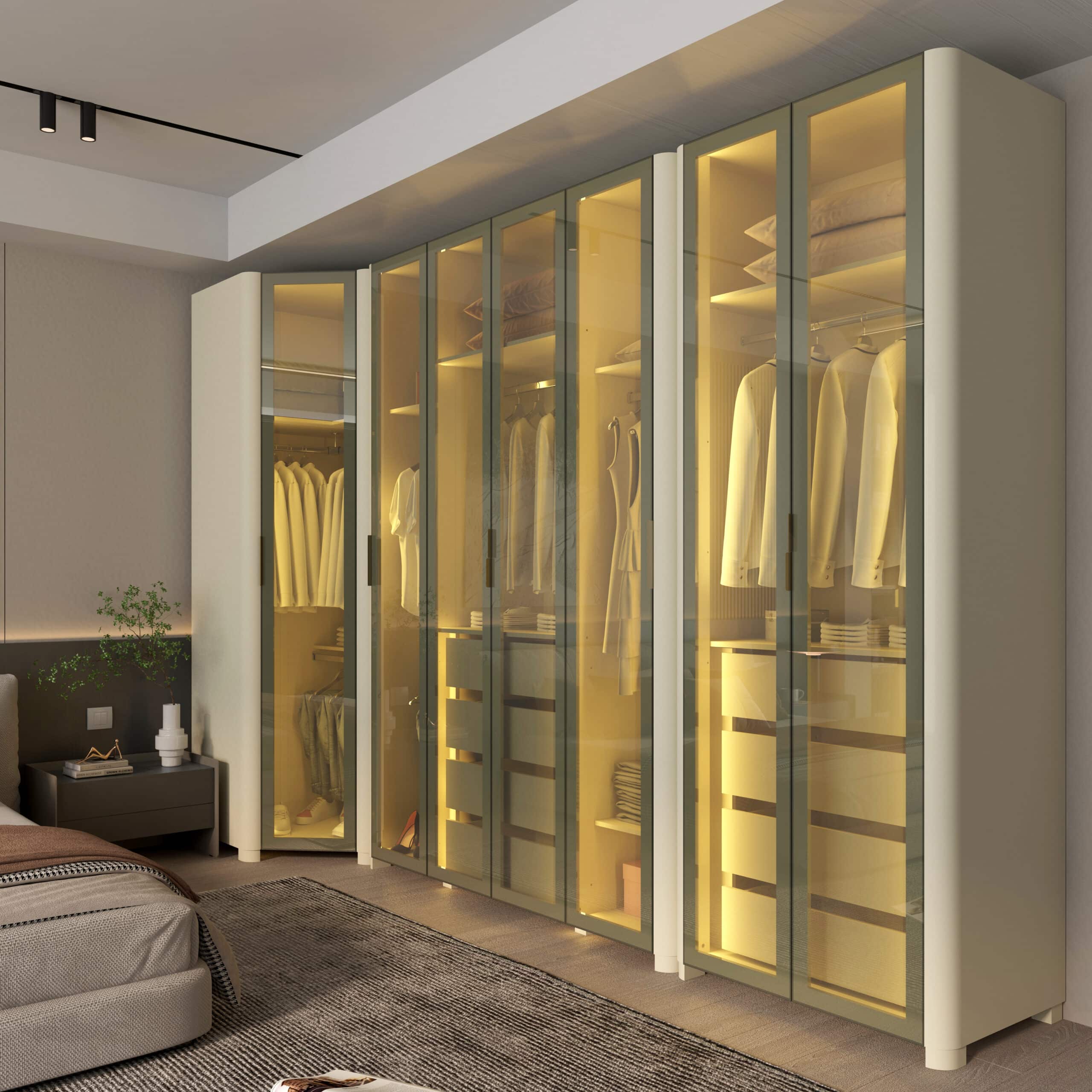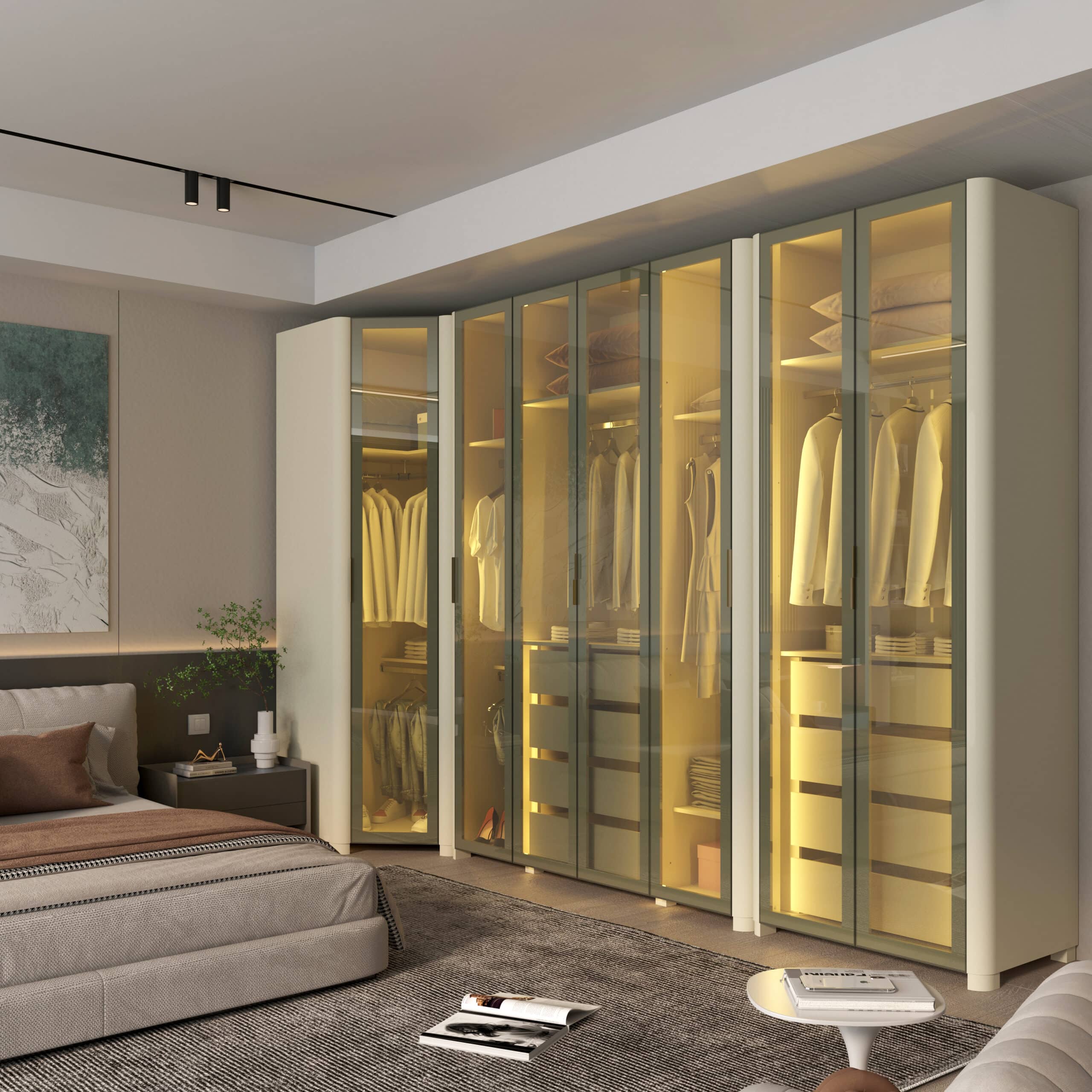 Seu design moderno, aliado ao brilho sutil do vidro reflecta e à iluminação LED quente, transforma o quarto em um refúgio de sofisticação e conforto.