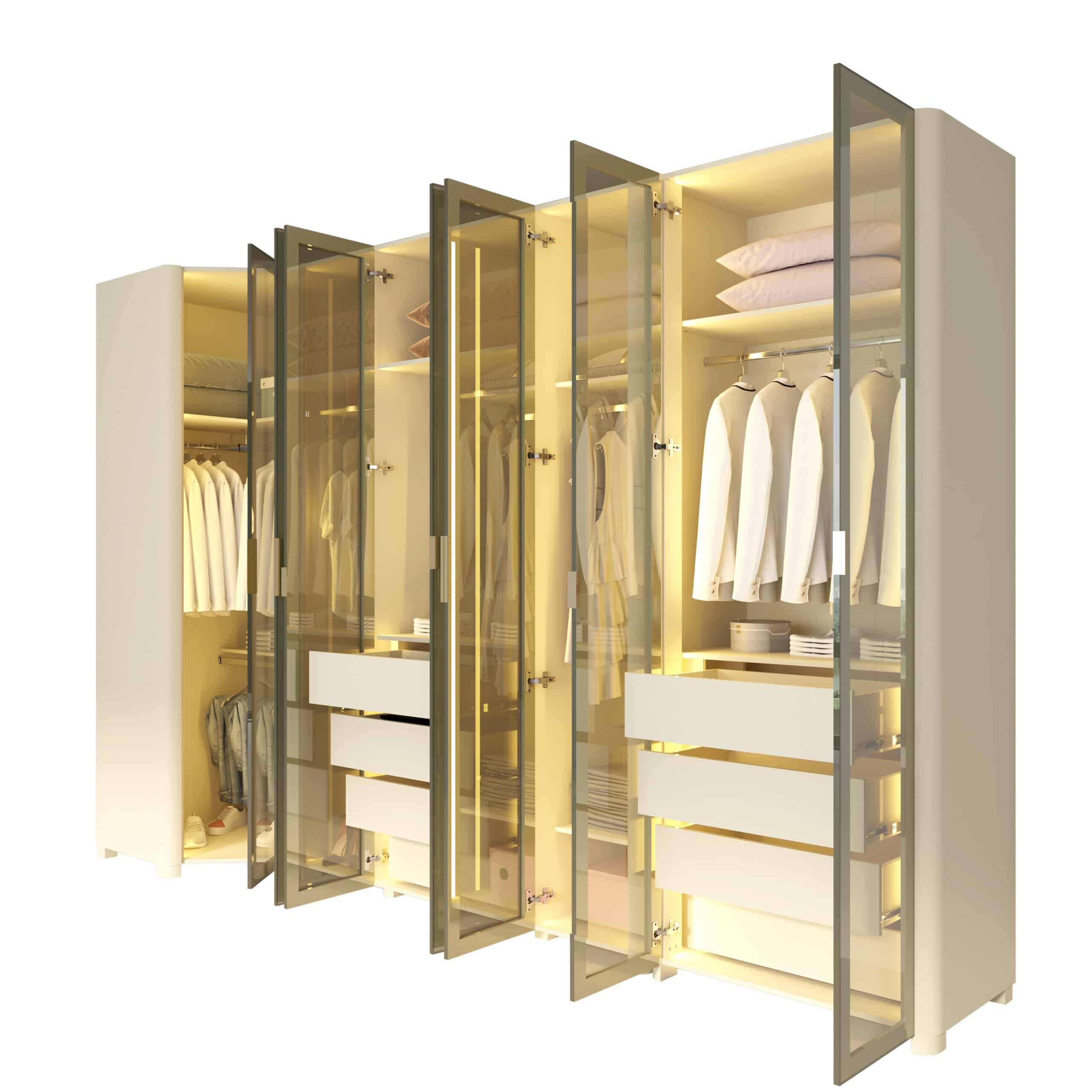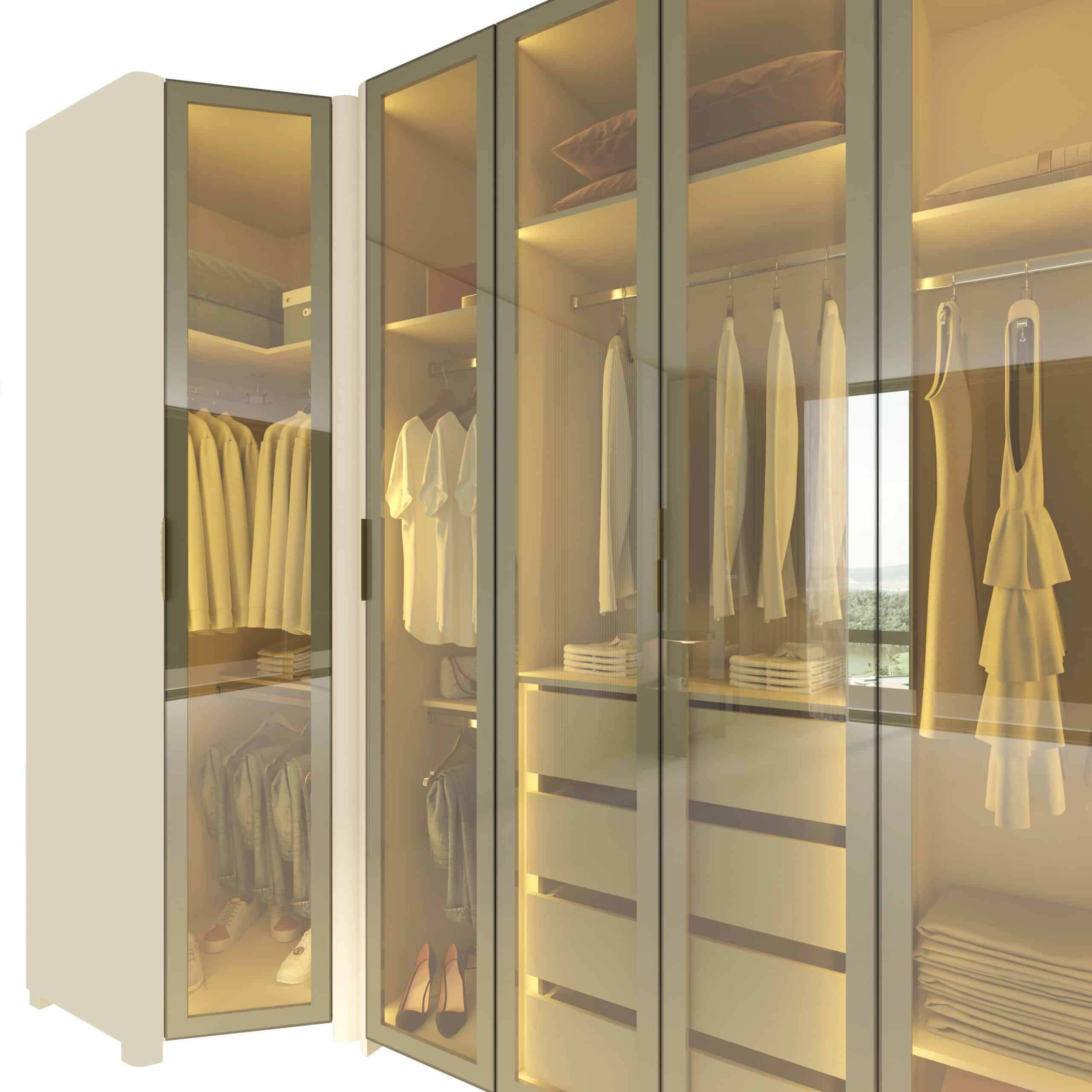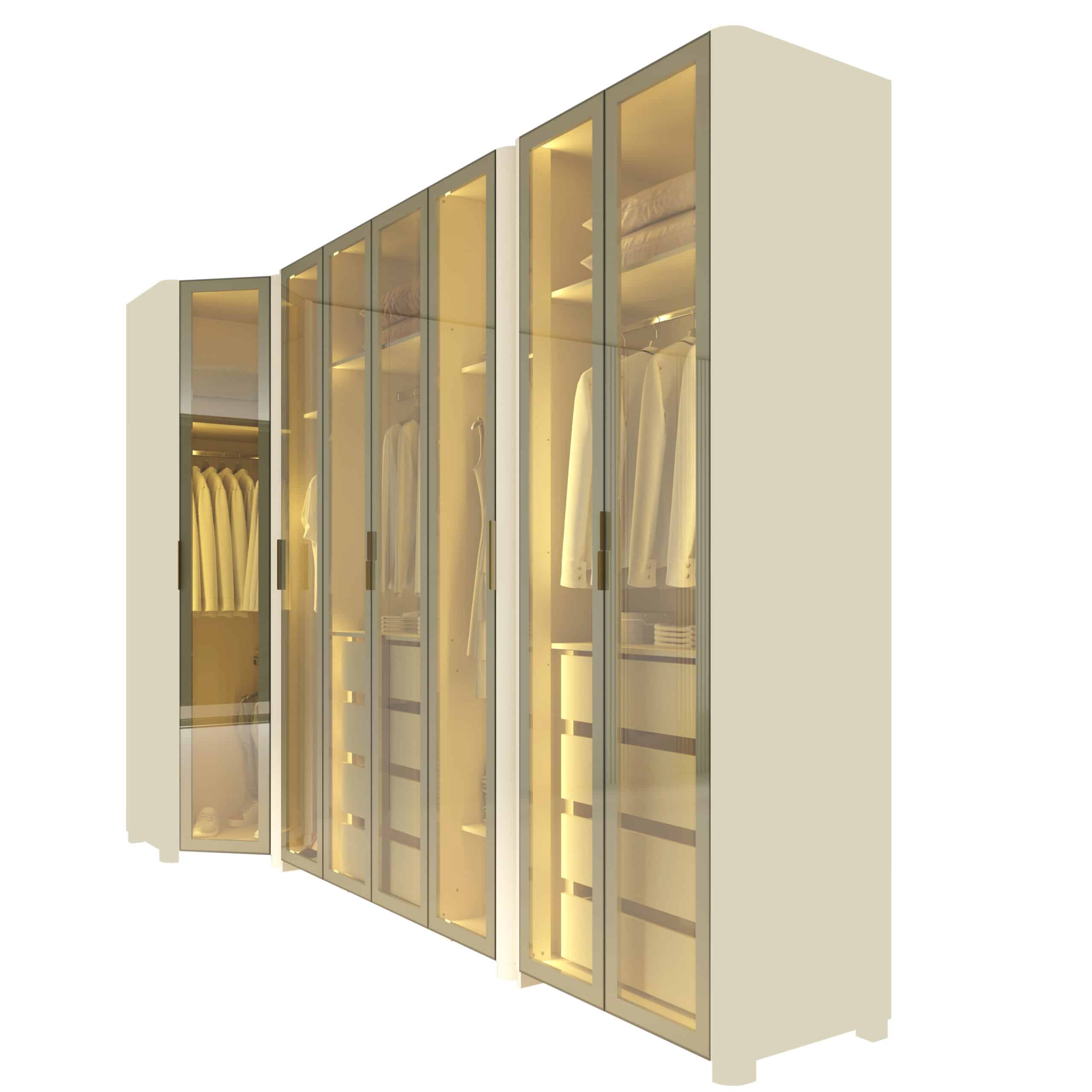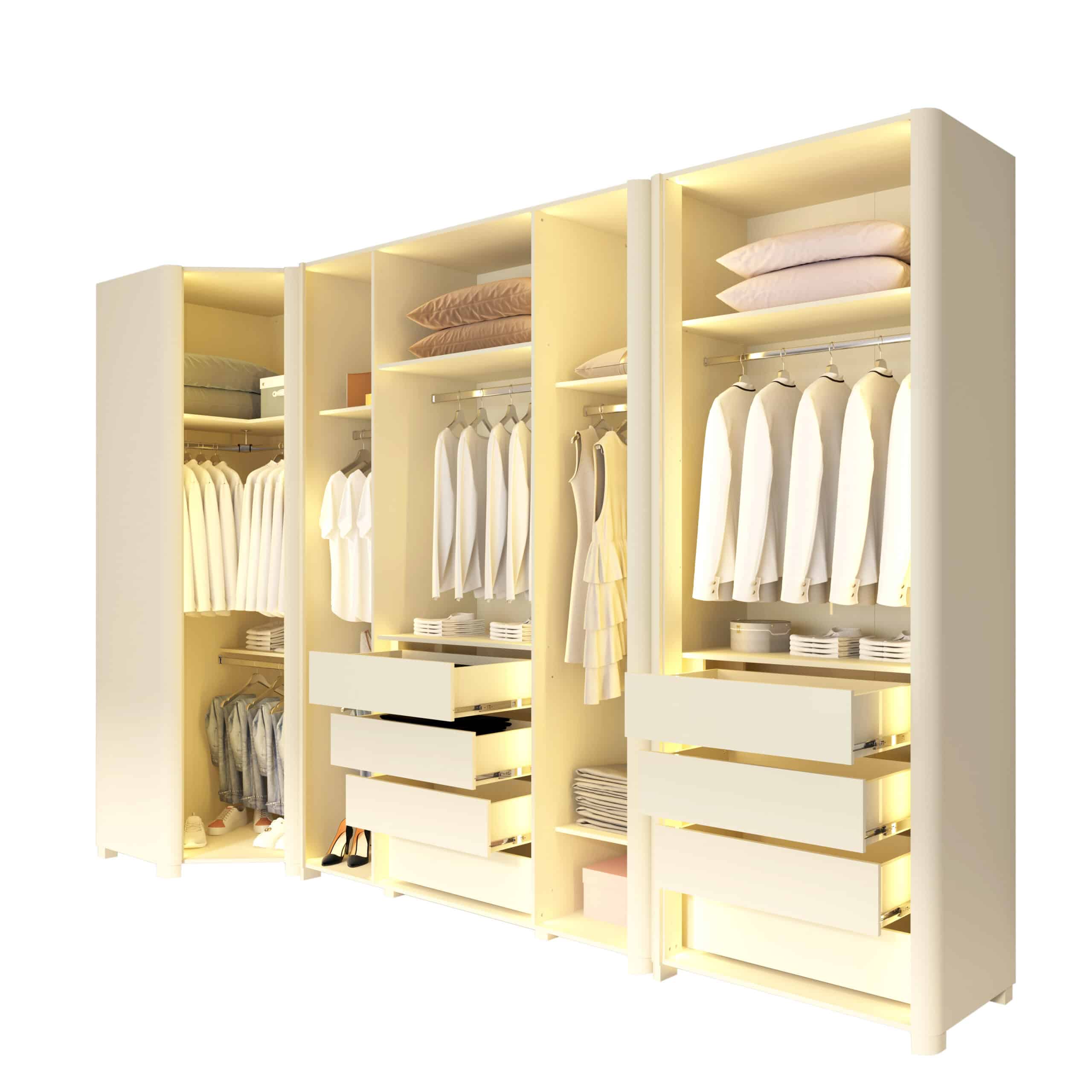 Composto por Roupeiro INNOVA 4 portas, Canto INNOVA e Roupeiro INNOVA 2 portas, o conjunto cria uma composição contínua e harmoniosa, que valoriza o espaço e a organização do ambiente.