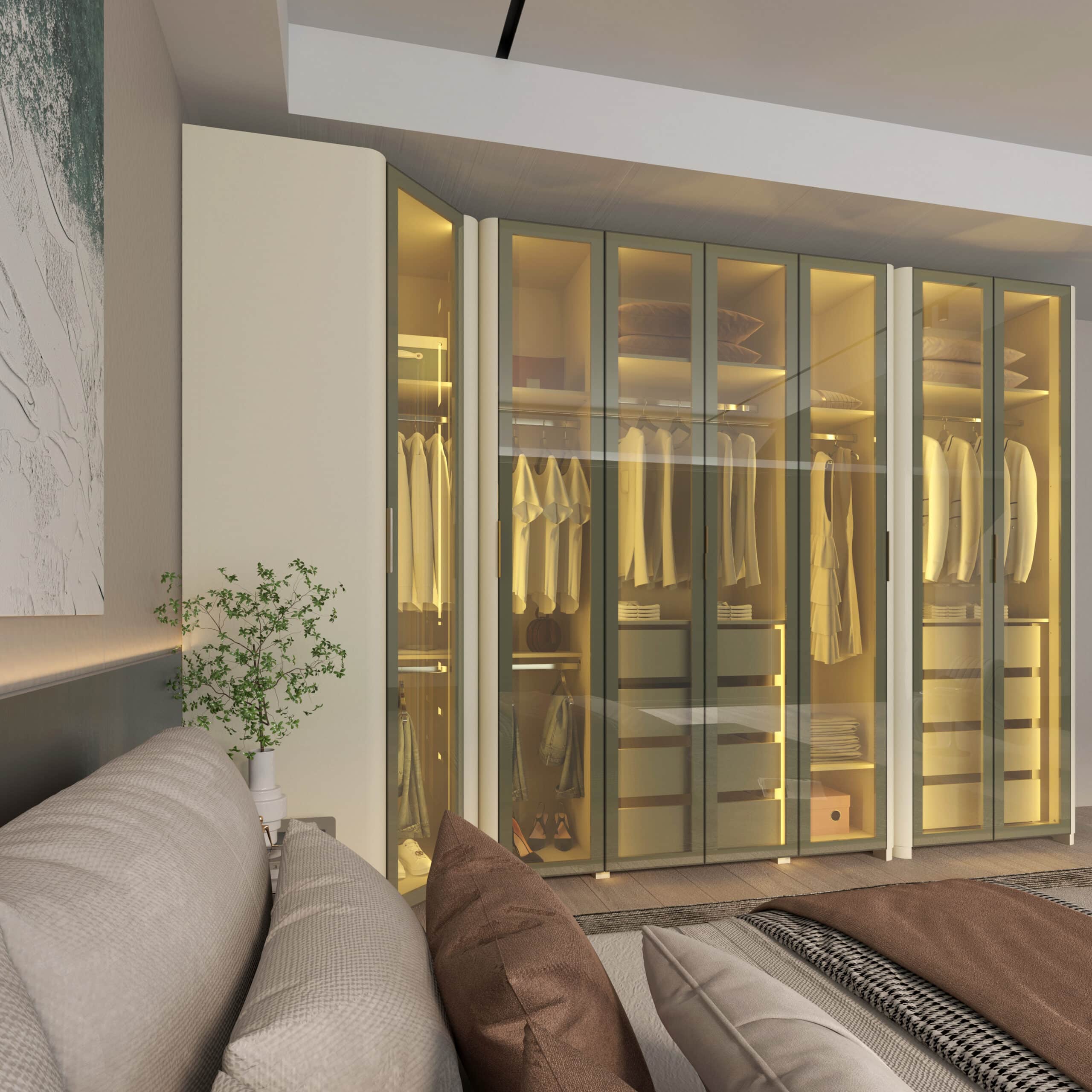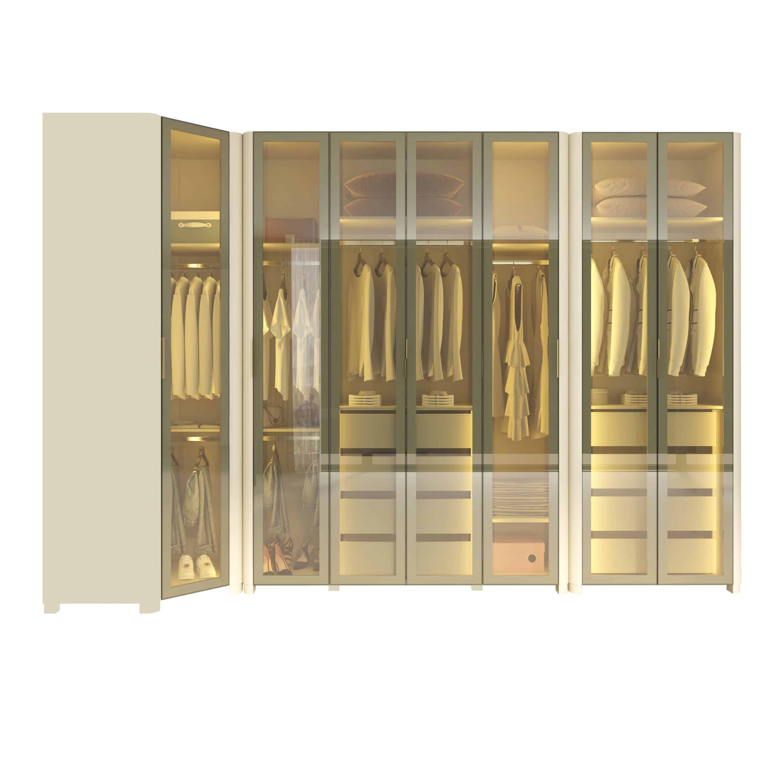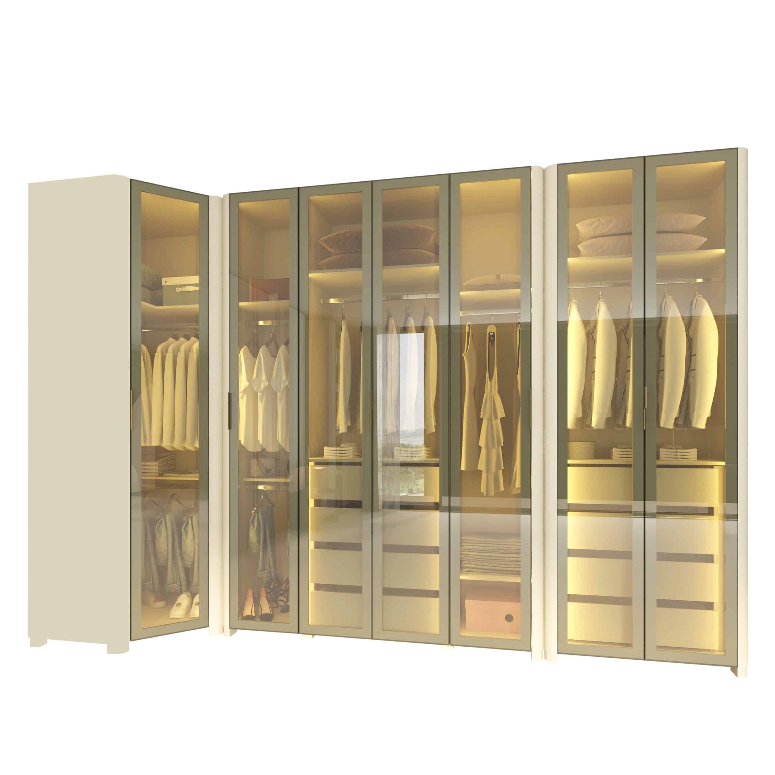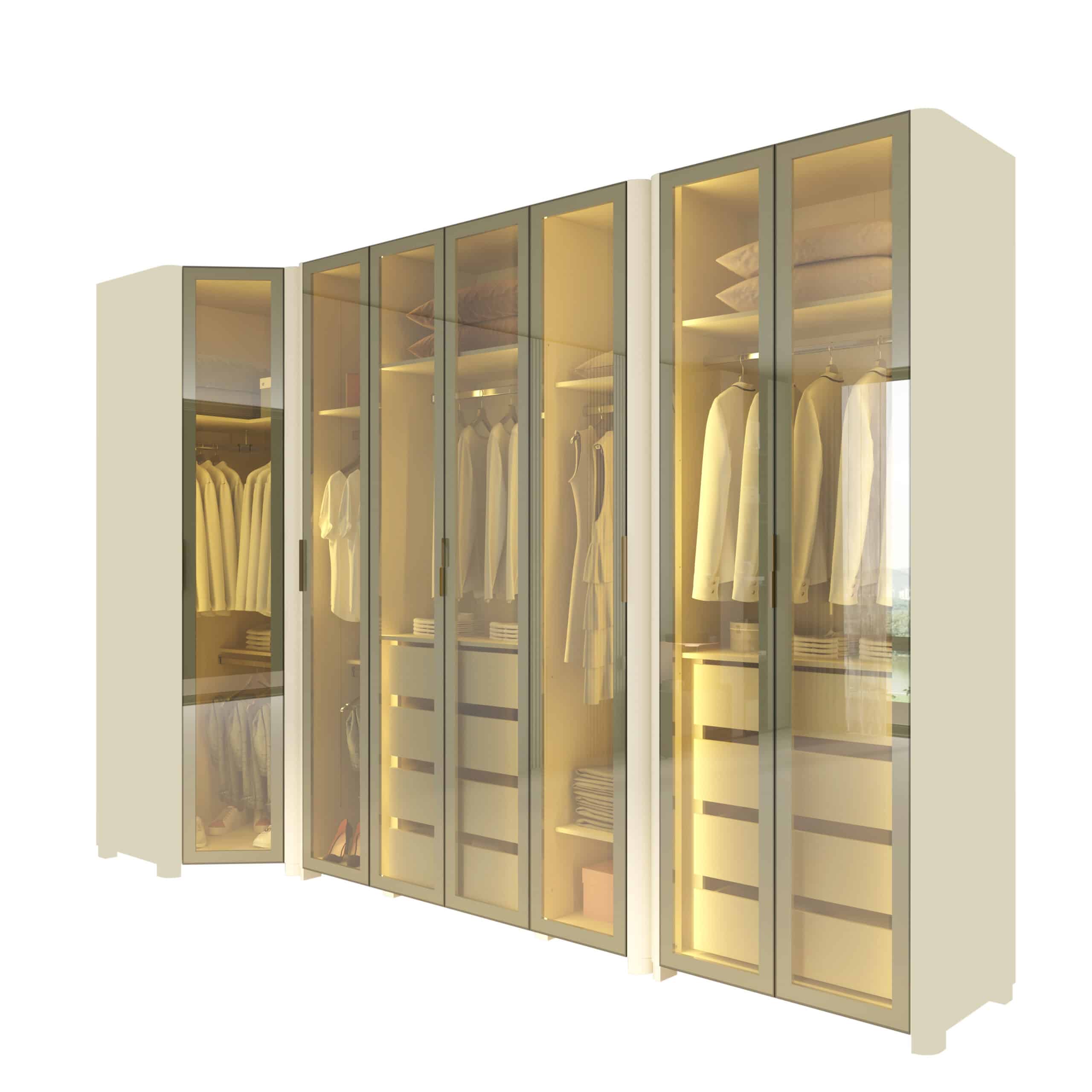 Composto por Roupeiro INNOVA 4 portas, Canto INNOVA e Roupeiro INNOVA 2 portas, o conjunto cria uma composição contínua e harmoniosa, que valoriza o espaço e a organização do ambiente.