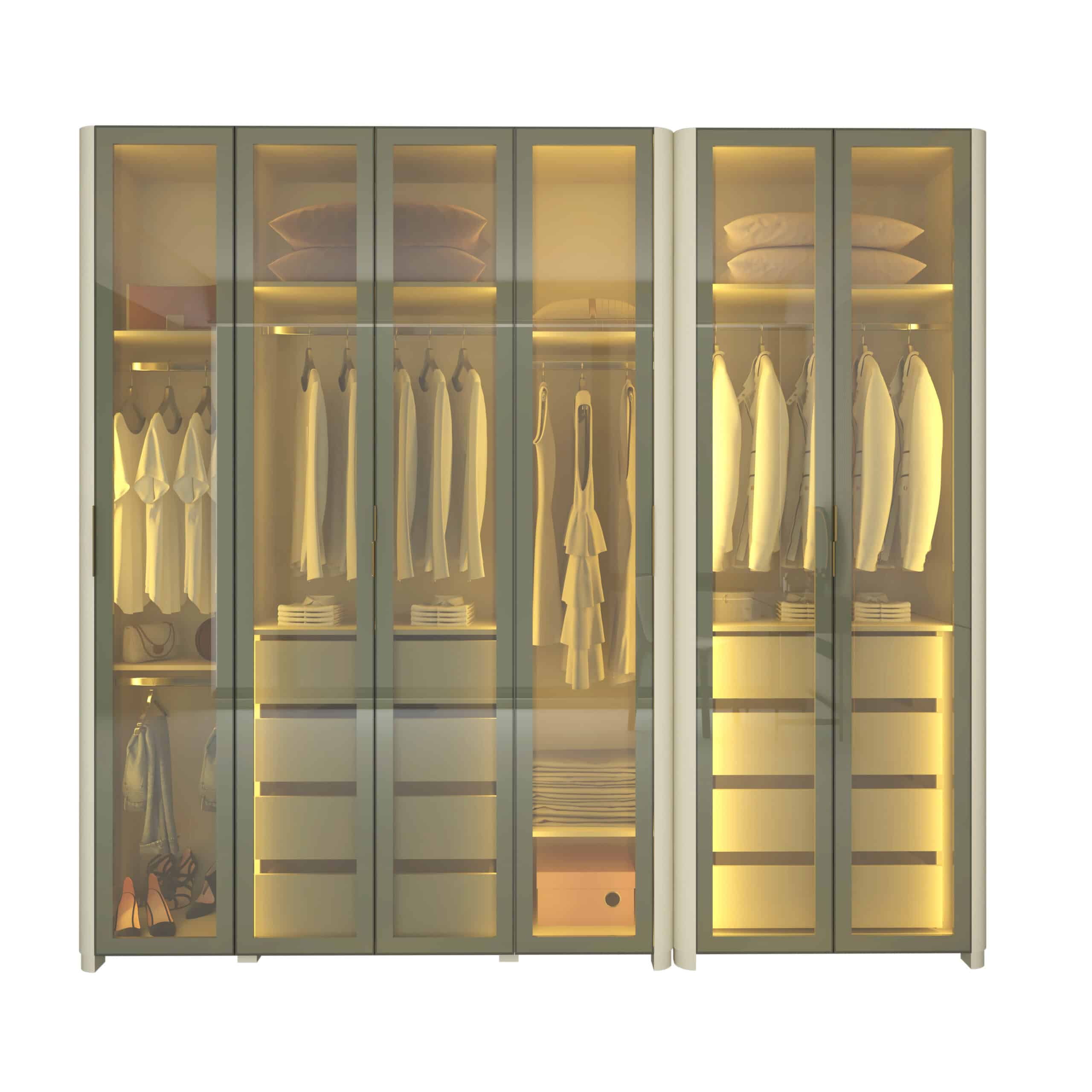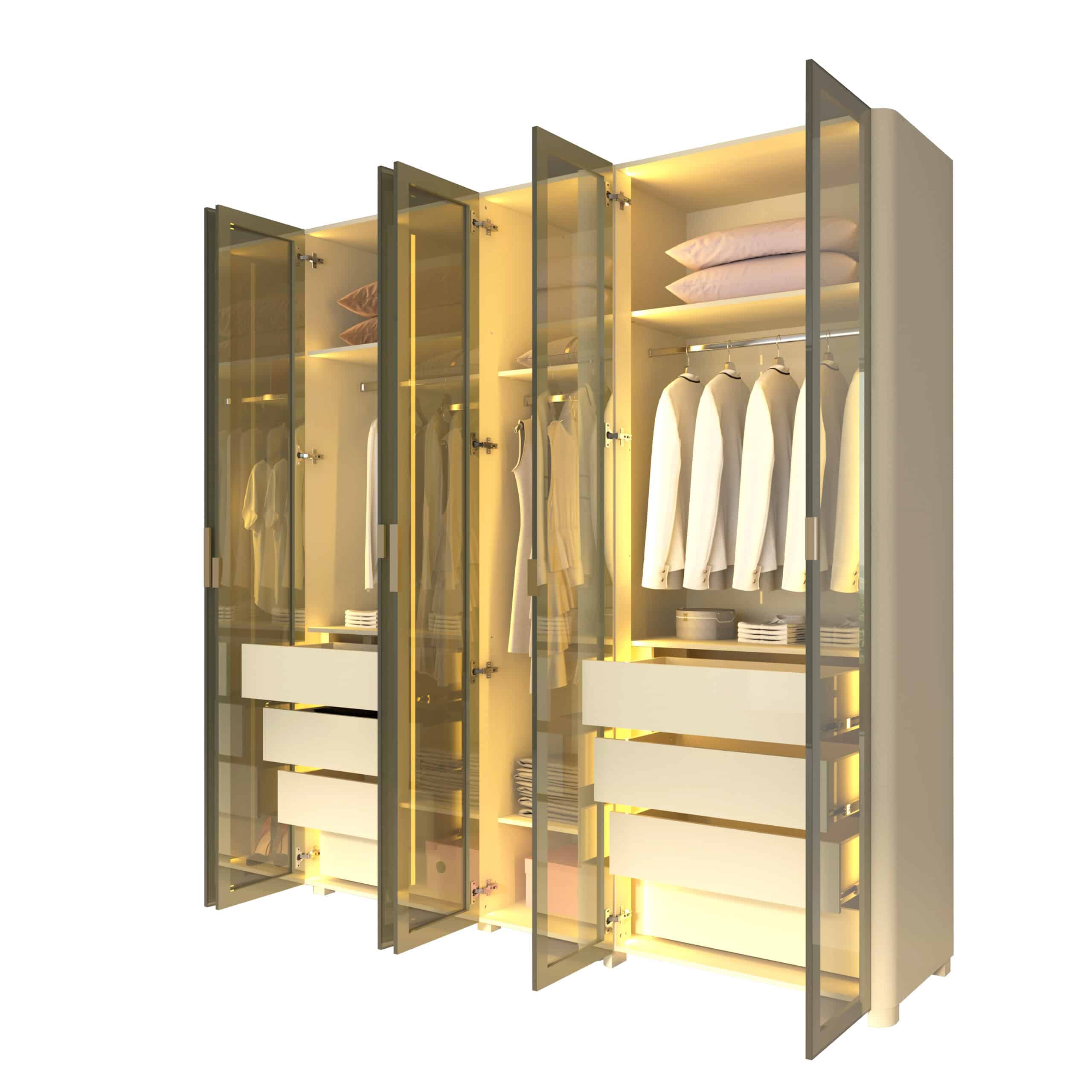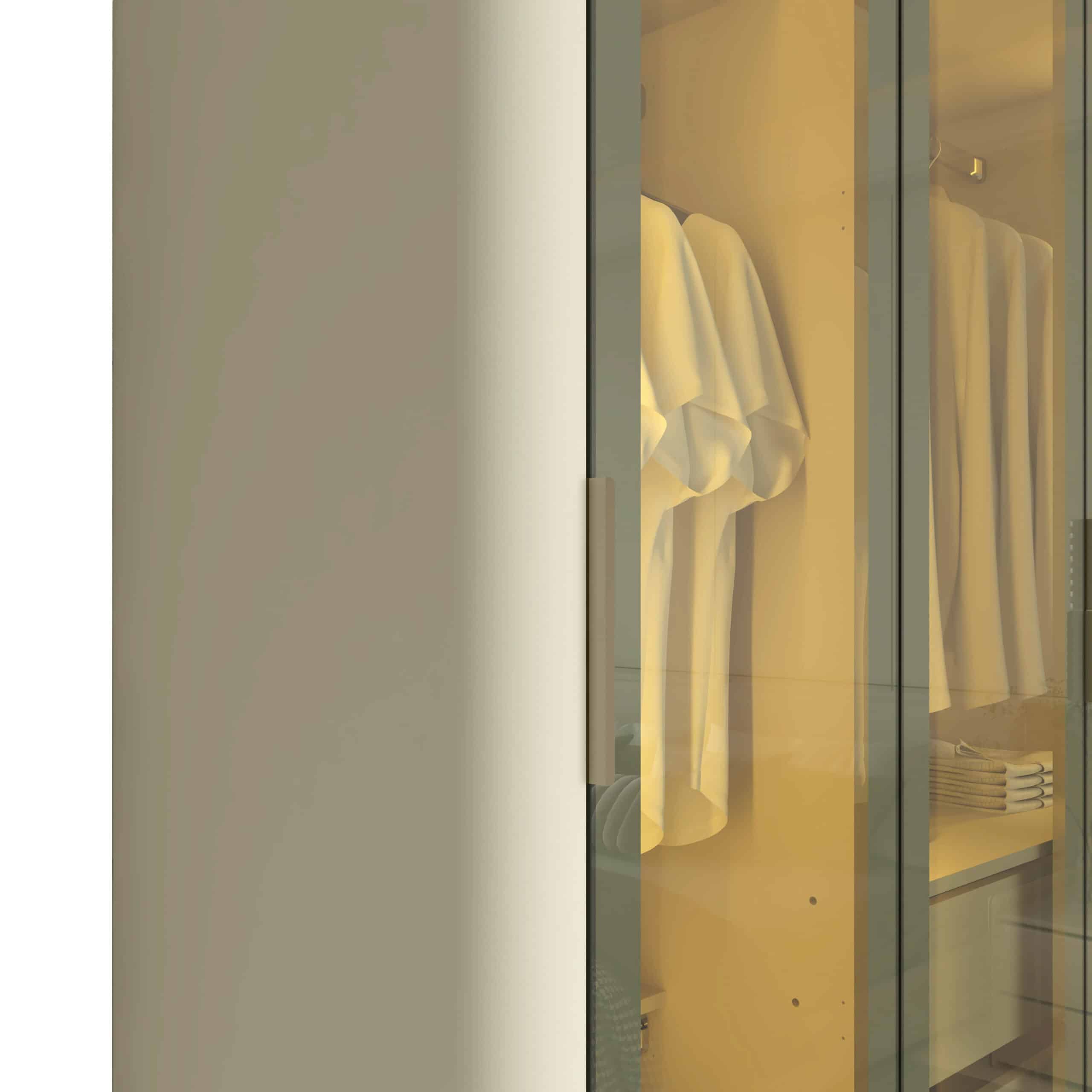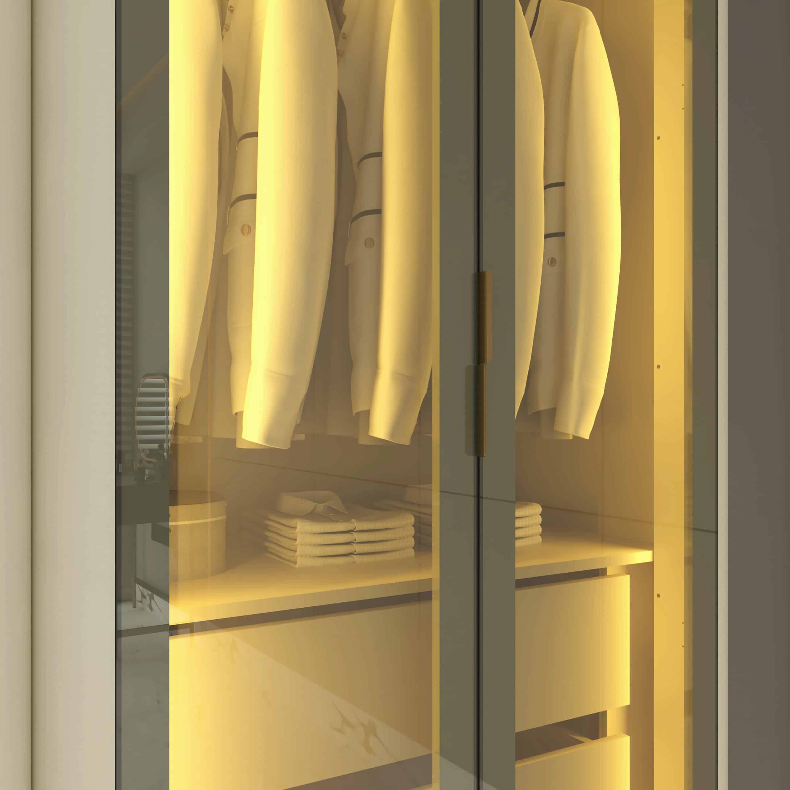 A iluminação interna em LED realça a beleza do vidro reflecta e o acabamento impecável do MDF, enquanto o design contínuo e os cantos curvos trazem fluidez e leveza ao dormitório.