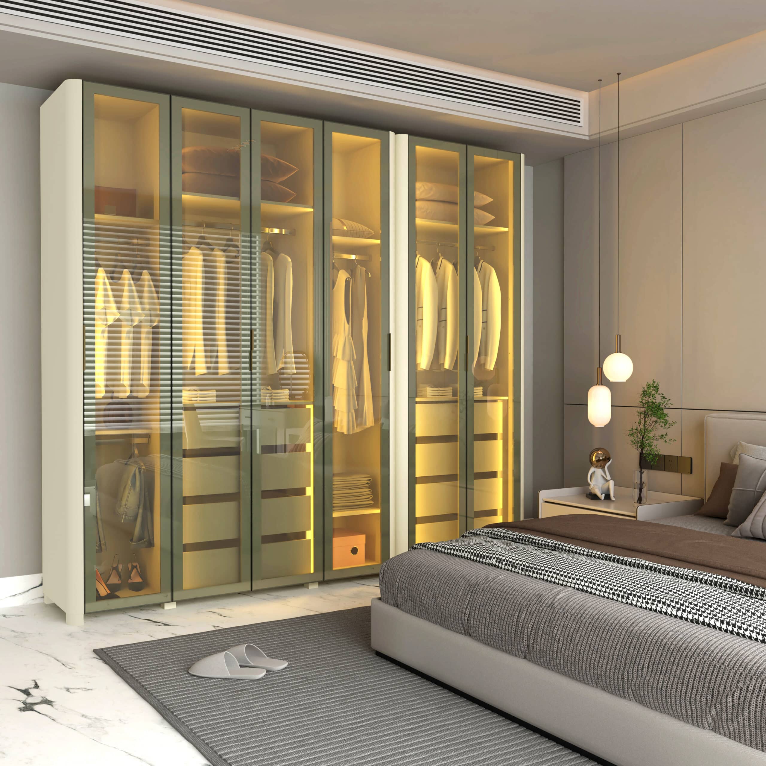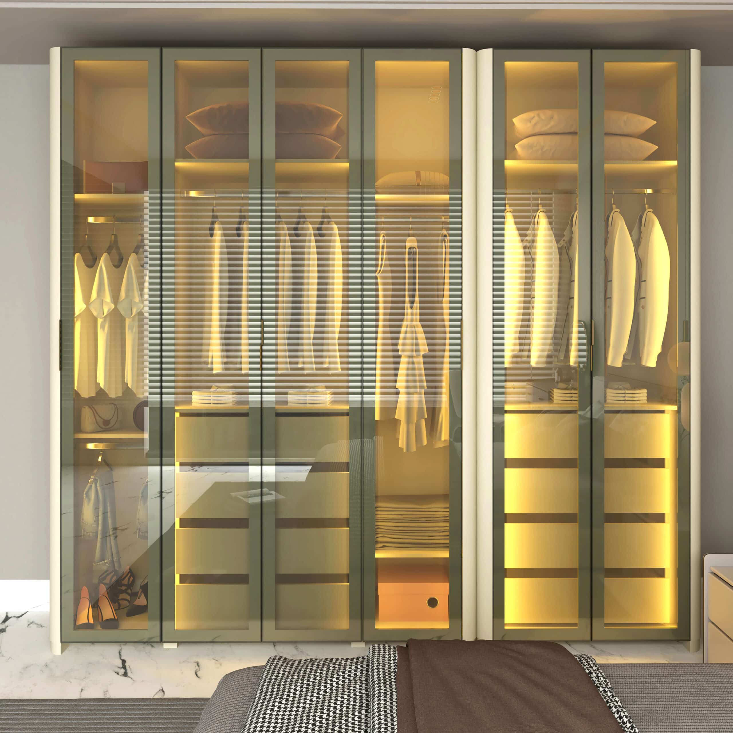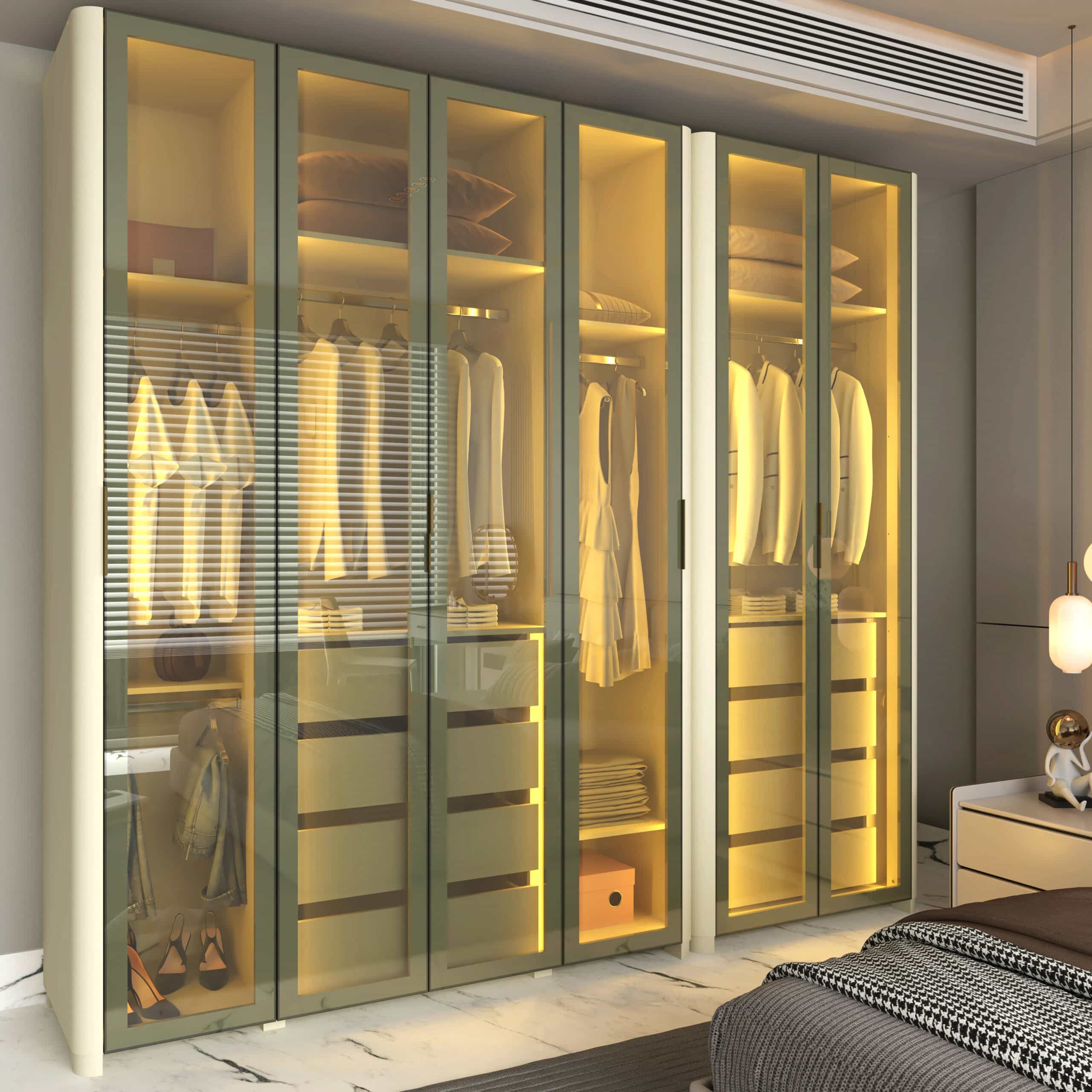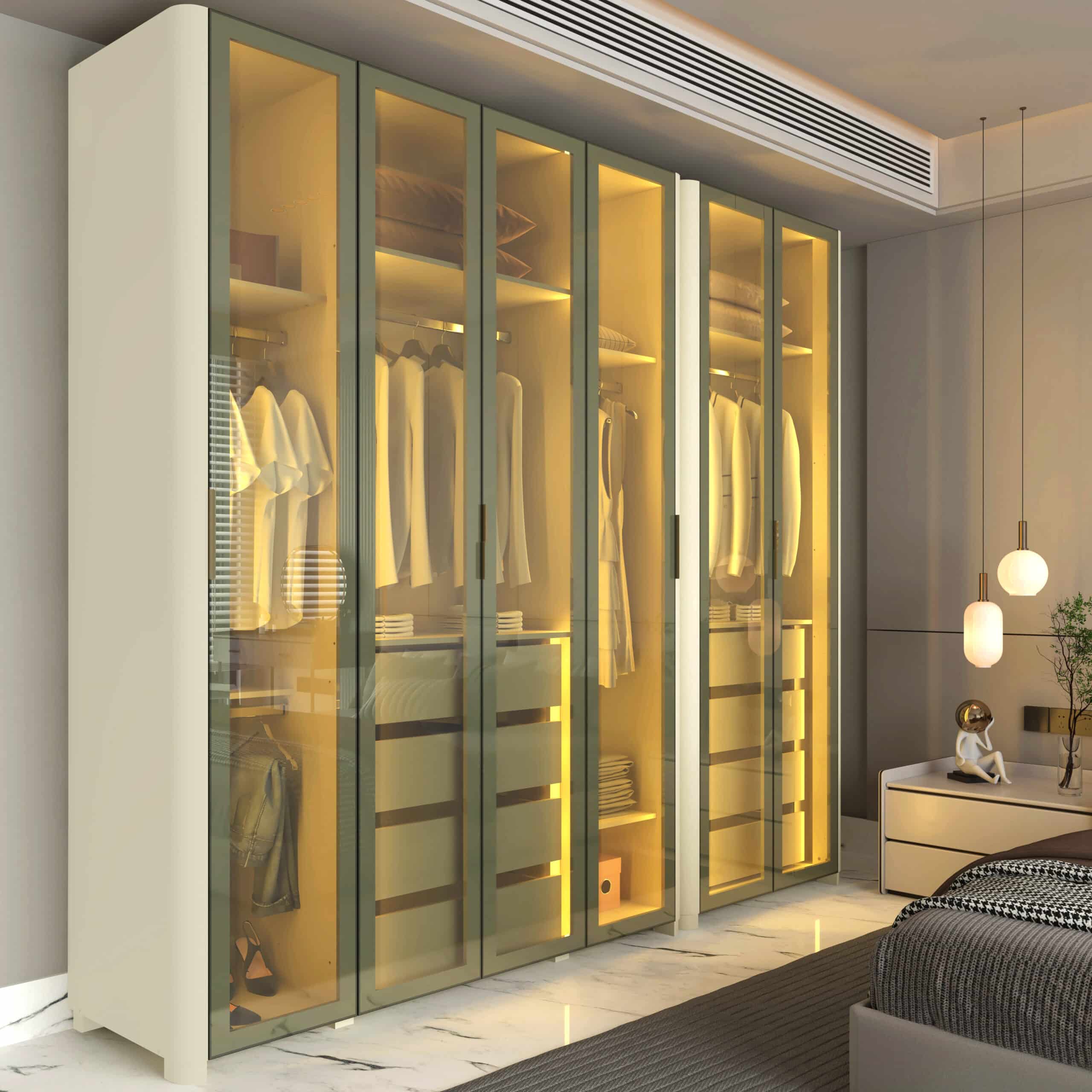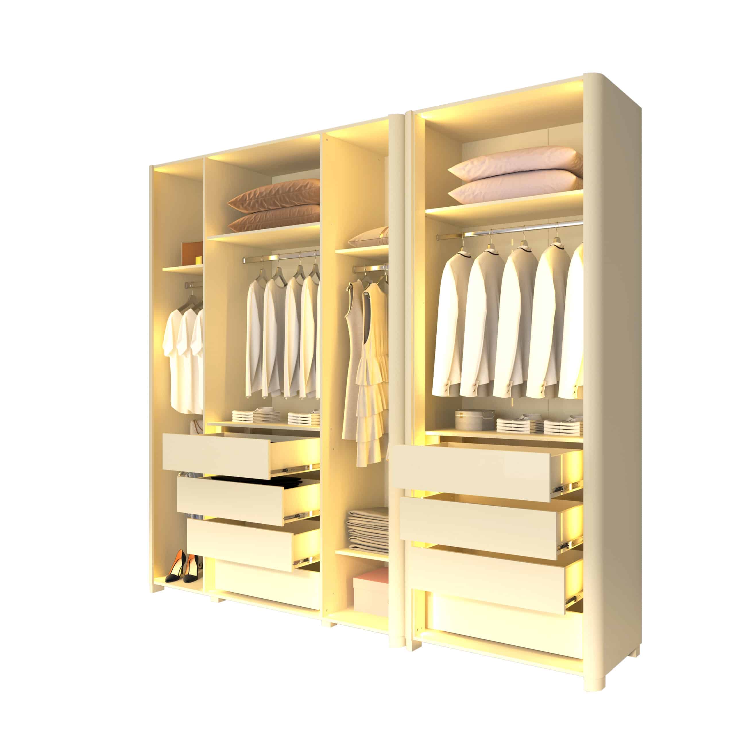 A iluminação interna em LED realça a beleza do vidro reflecta e o acabamento impecável do MDF, enquanto o design contínuo e os cantos curvos trazem fluidez e leveza ao dormitório.
