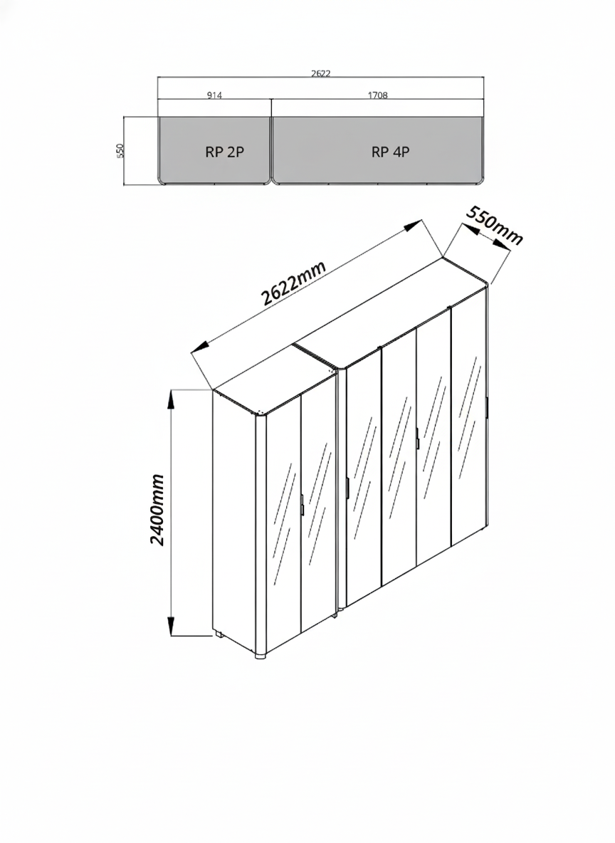 Composto por Roupeiro INNOVA 2 portas e Roupeiro INNOVA 4 portas, o conjunto cria uma composição moderna e funcional, perfeita para quem busca um ambiente elegante e organizado.