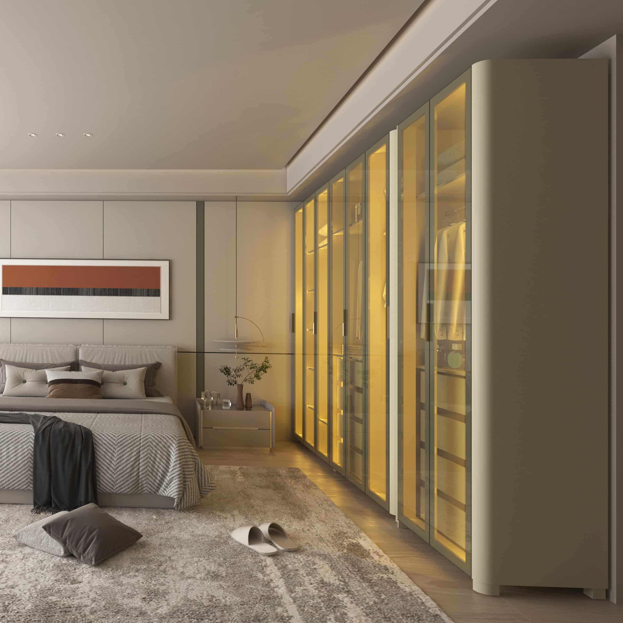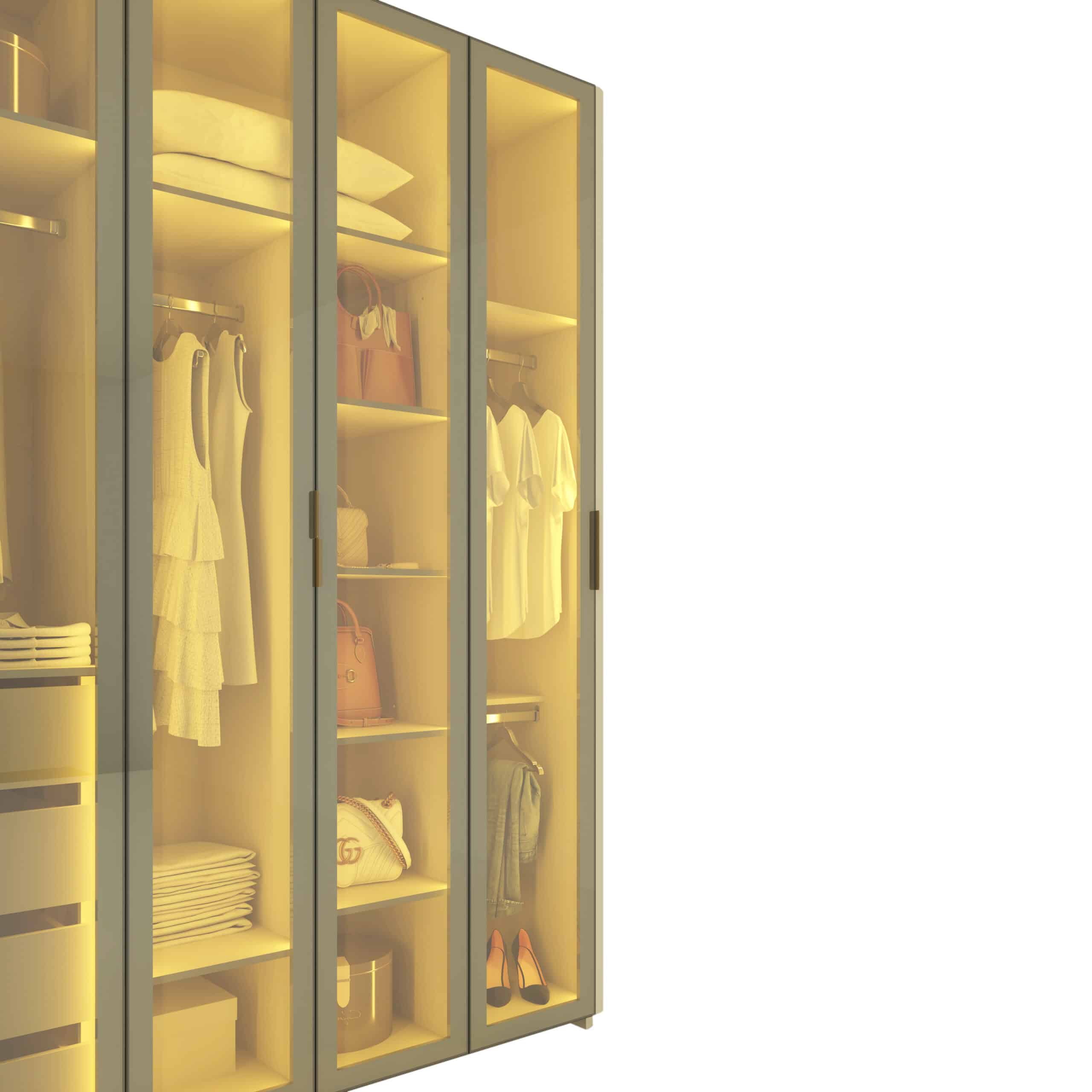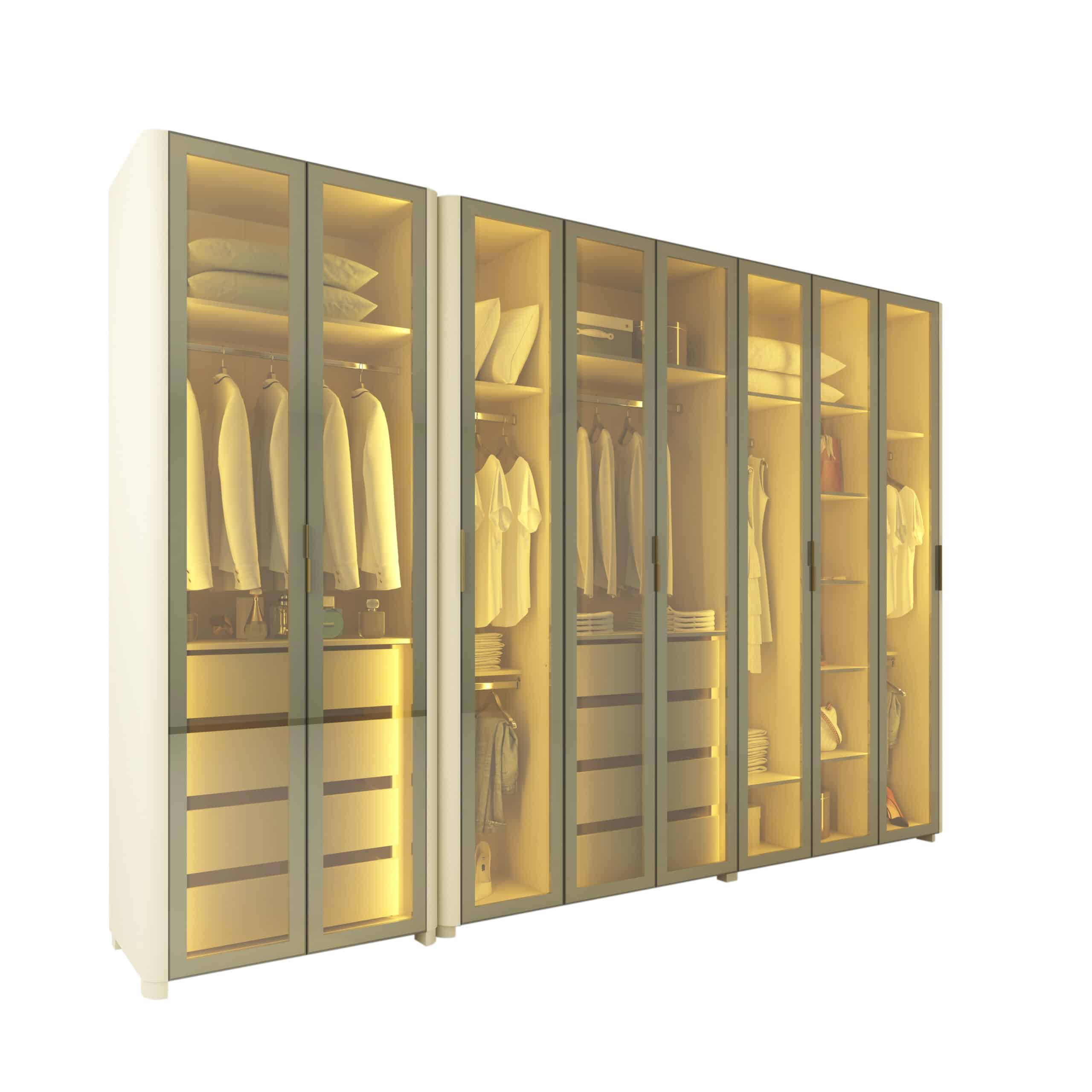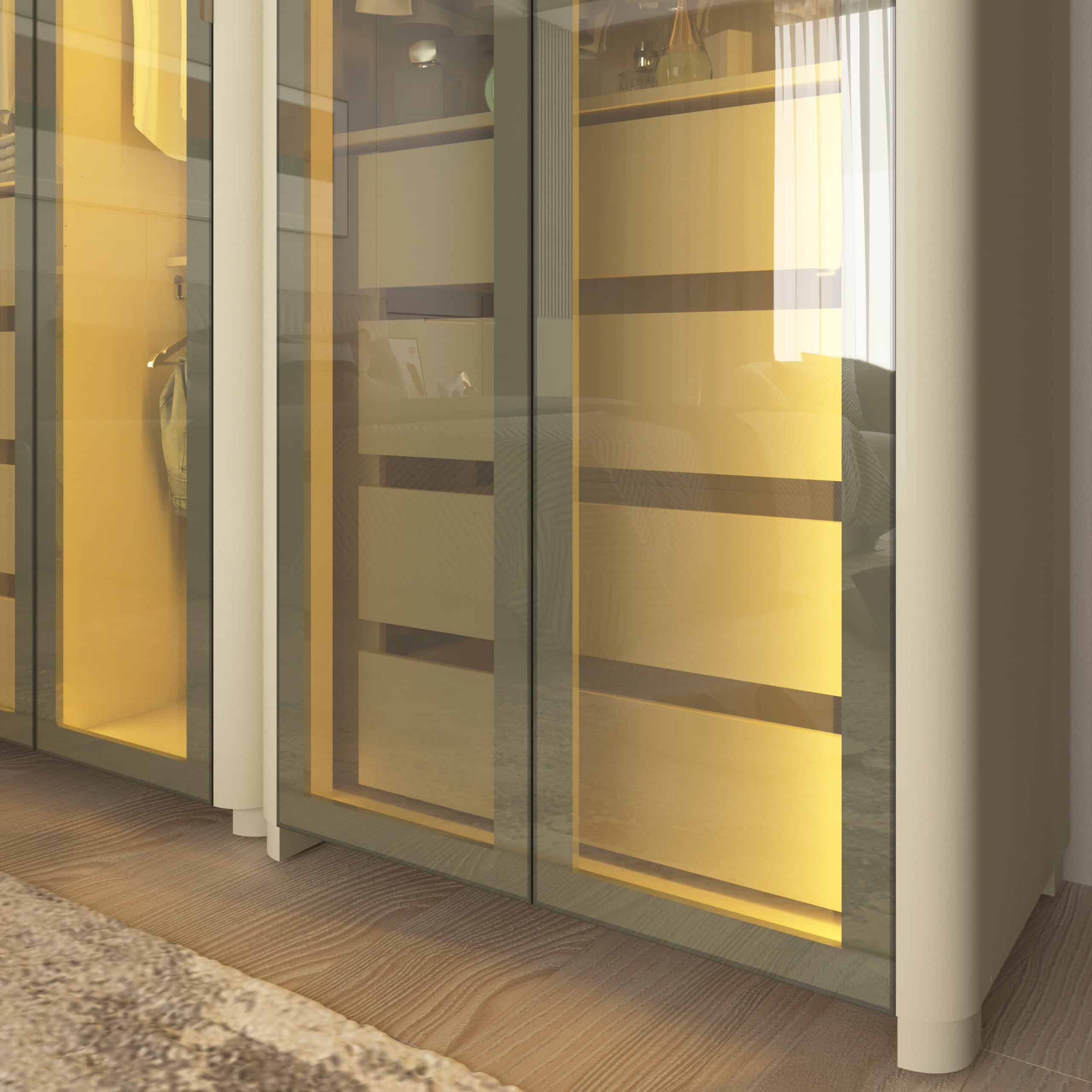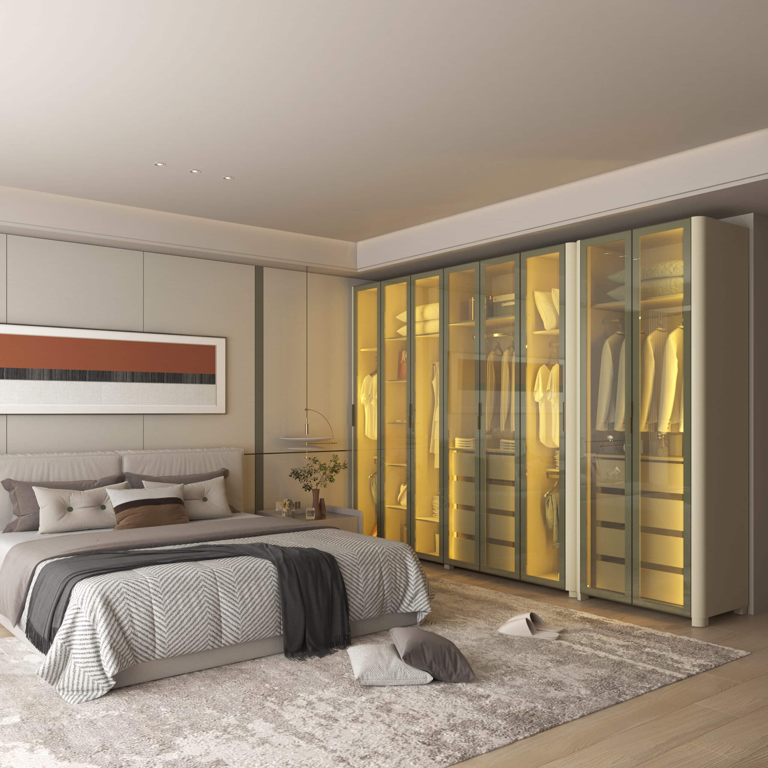 Com design elegante, iluminação envolvente e portas em vidro reflecta, o MODULADO INNOVA transforma o dormitório em um espaço moderno e acolhedor.