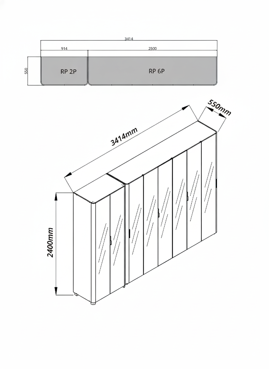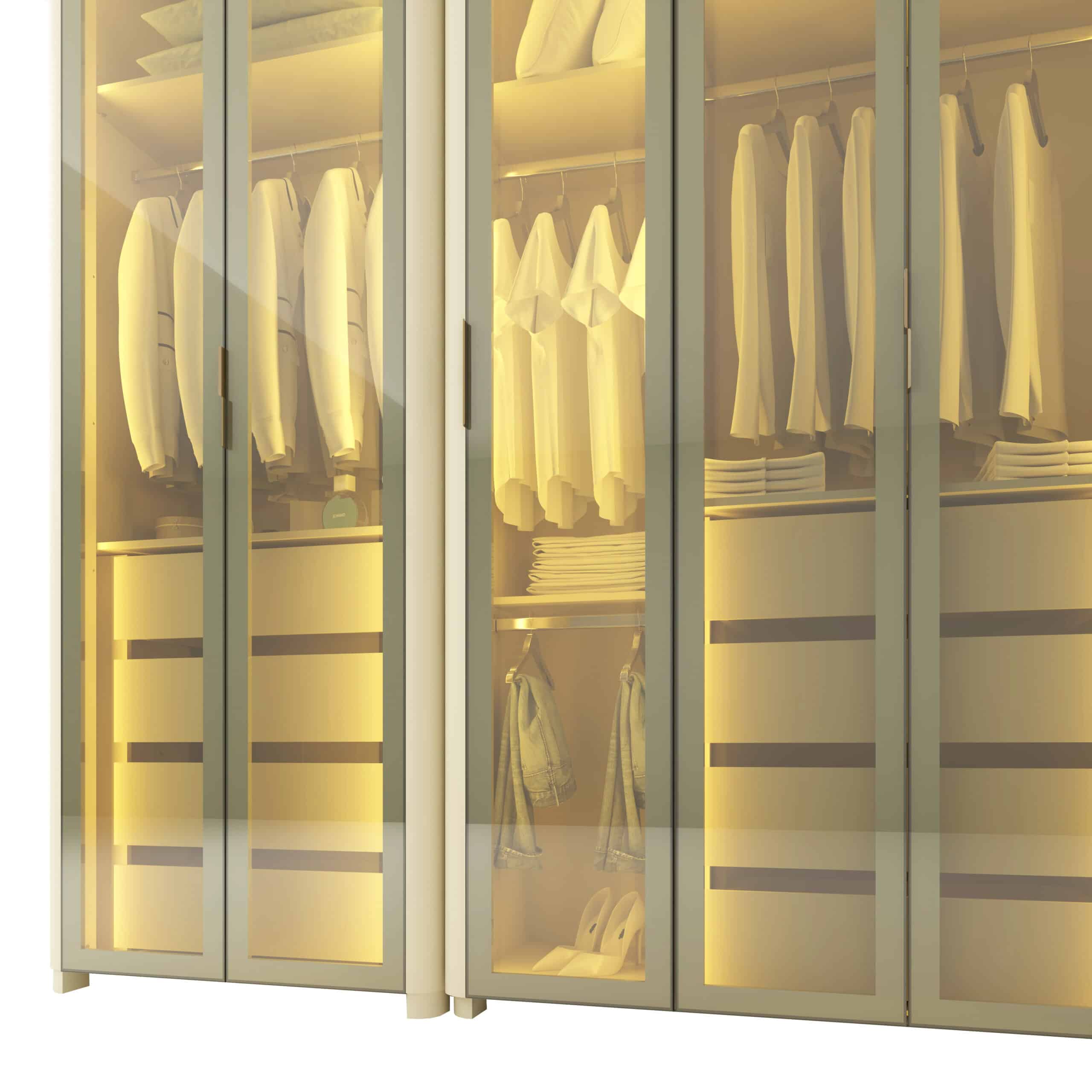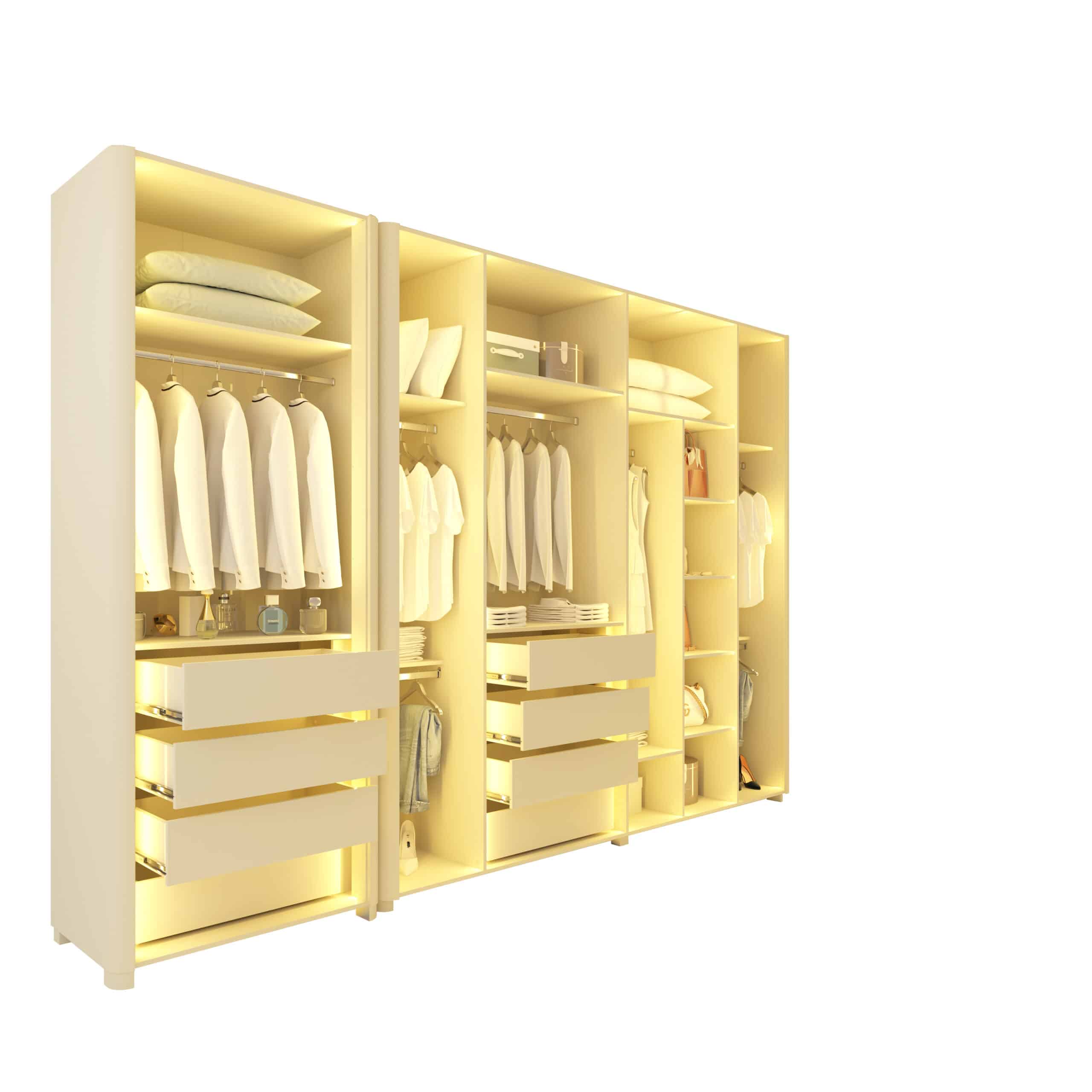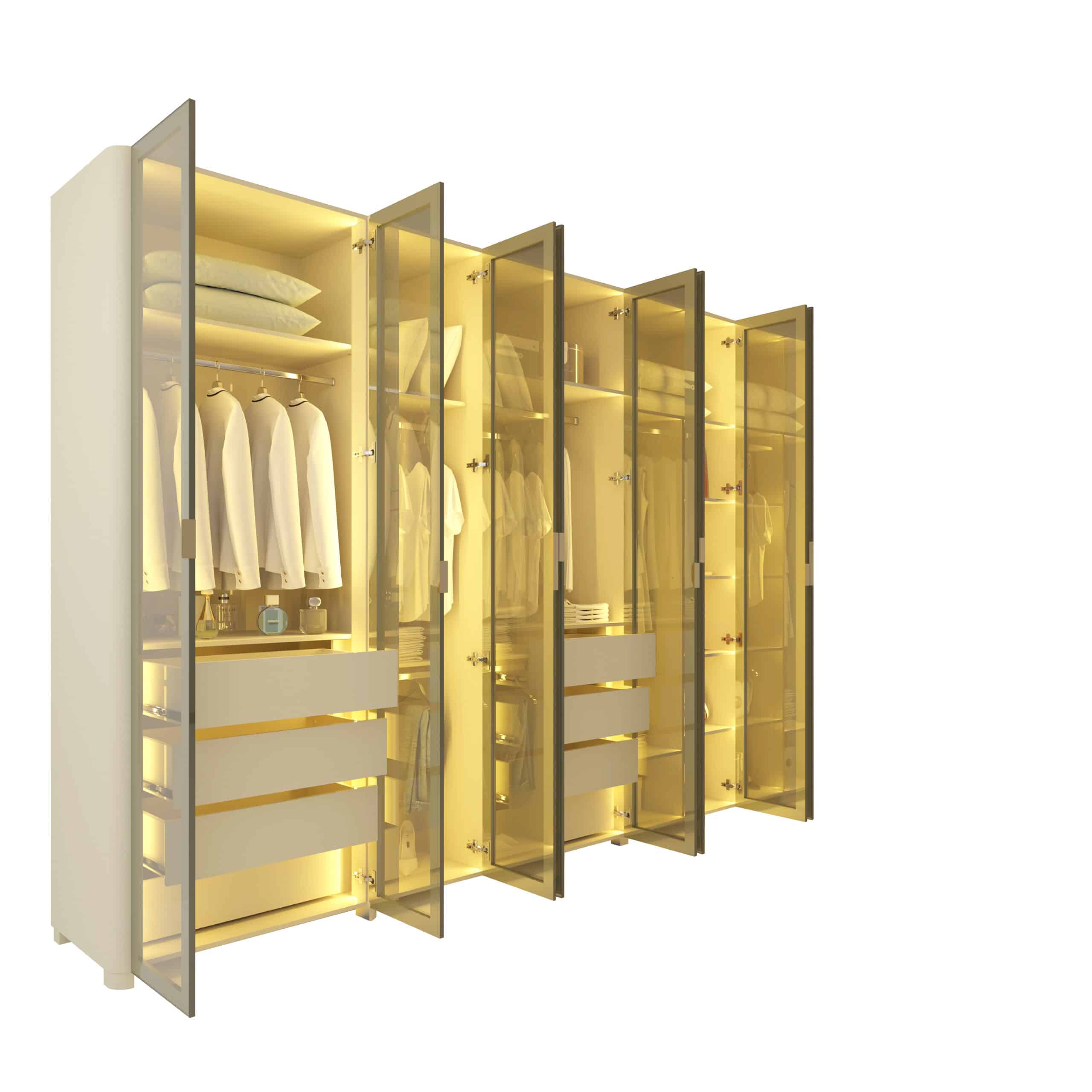 Sua composição, formada pelo Roupeiro INNOVA 6 portas e Roupeiro INNOVA 2 portas, oferece um visual contínuo e imponente, com amplo espaço interno e acabamento de alto padrão.