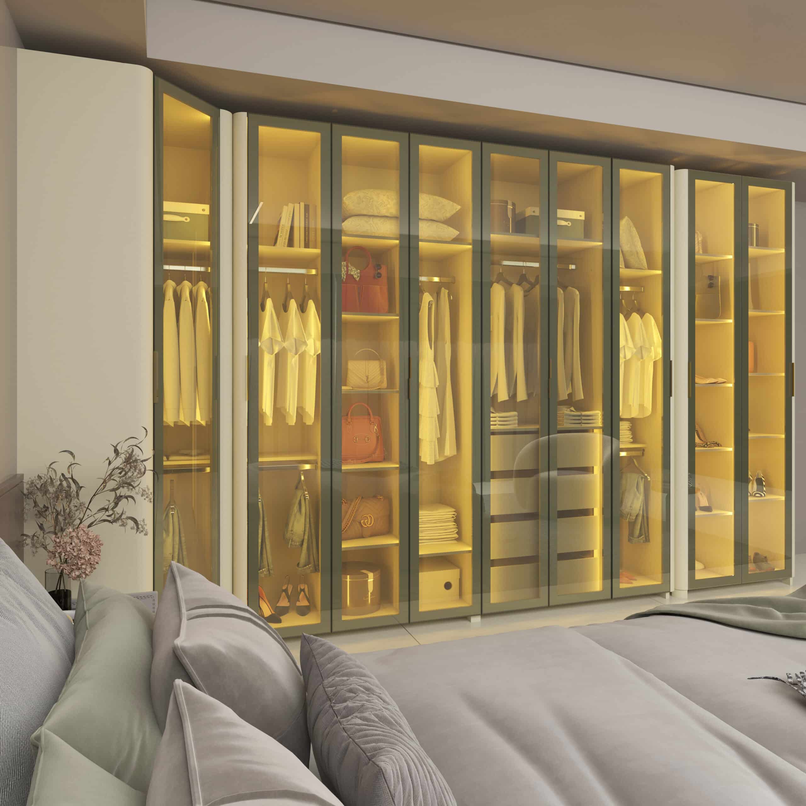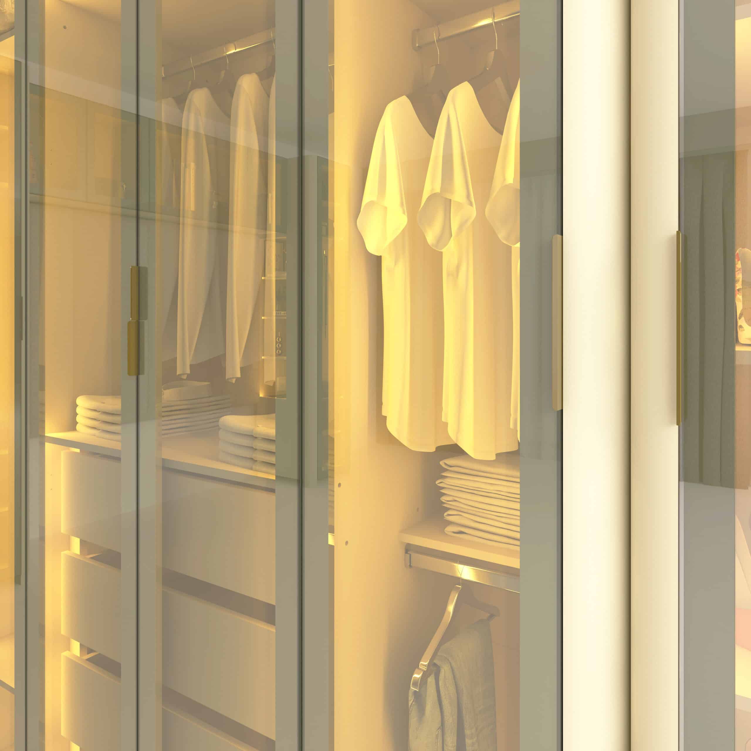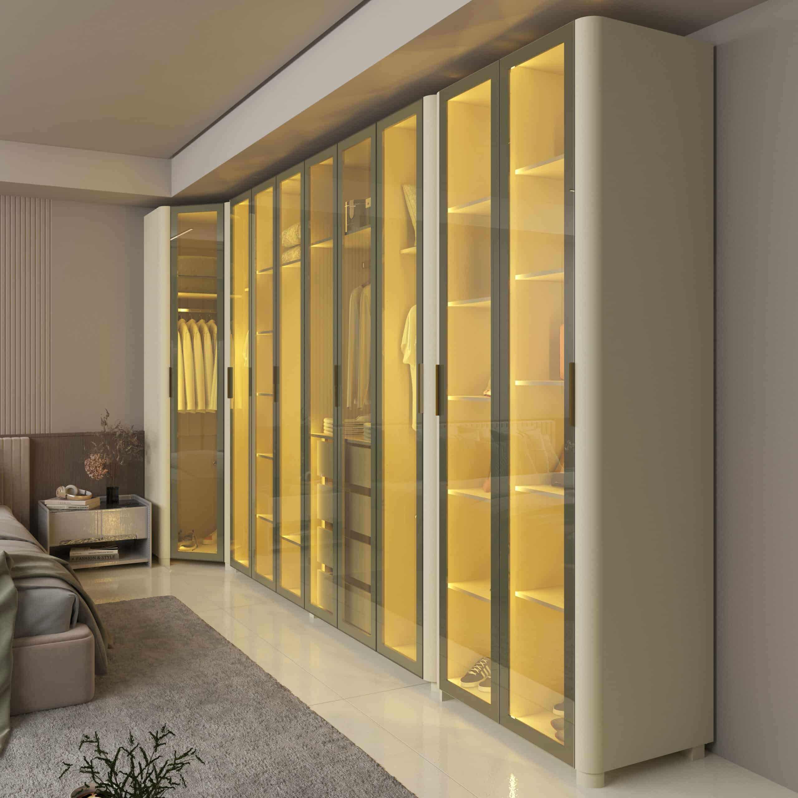 As portas em vidro reflecta com moldura em alumínio e a iluminação LED quente embutida criam um visual moderno e acolhedor, destacando o interior e realçando o acabamento premium do MDF.