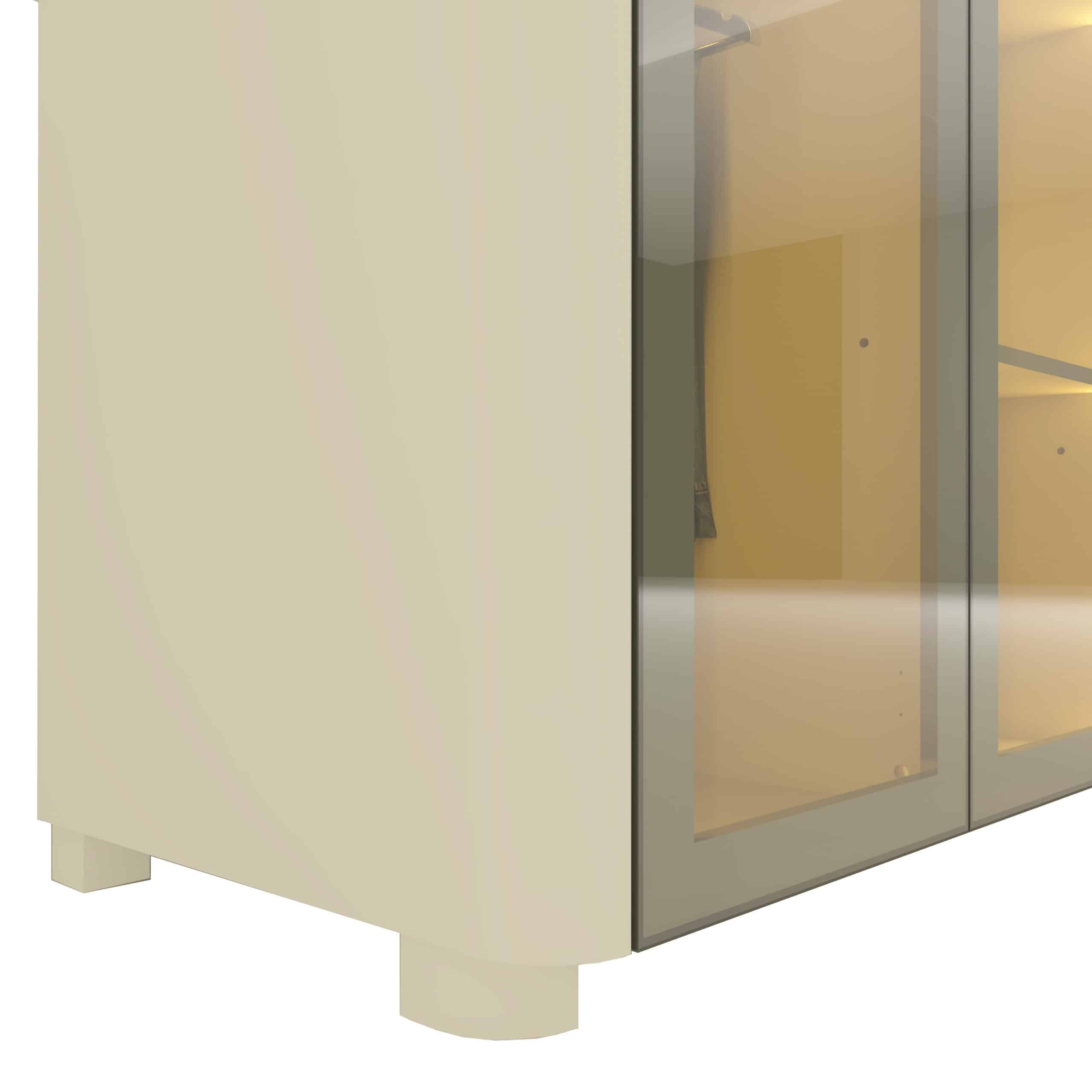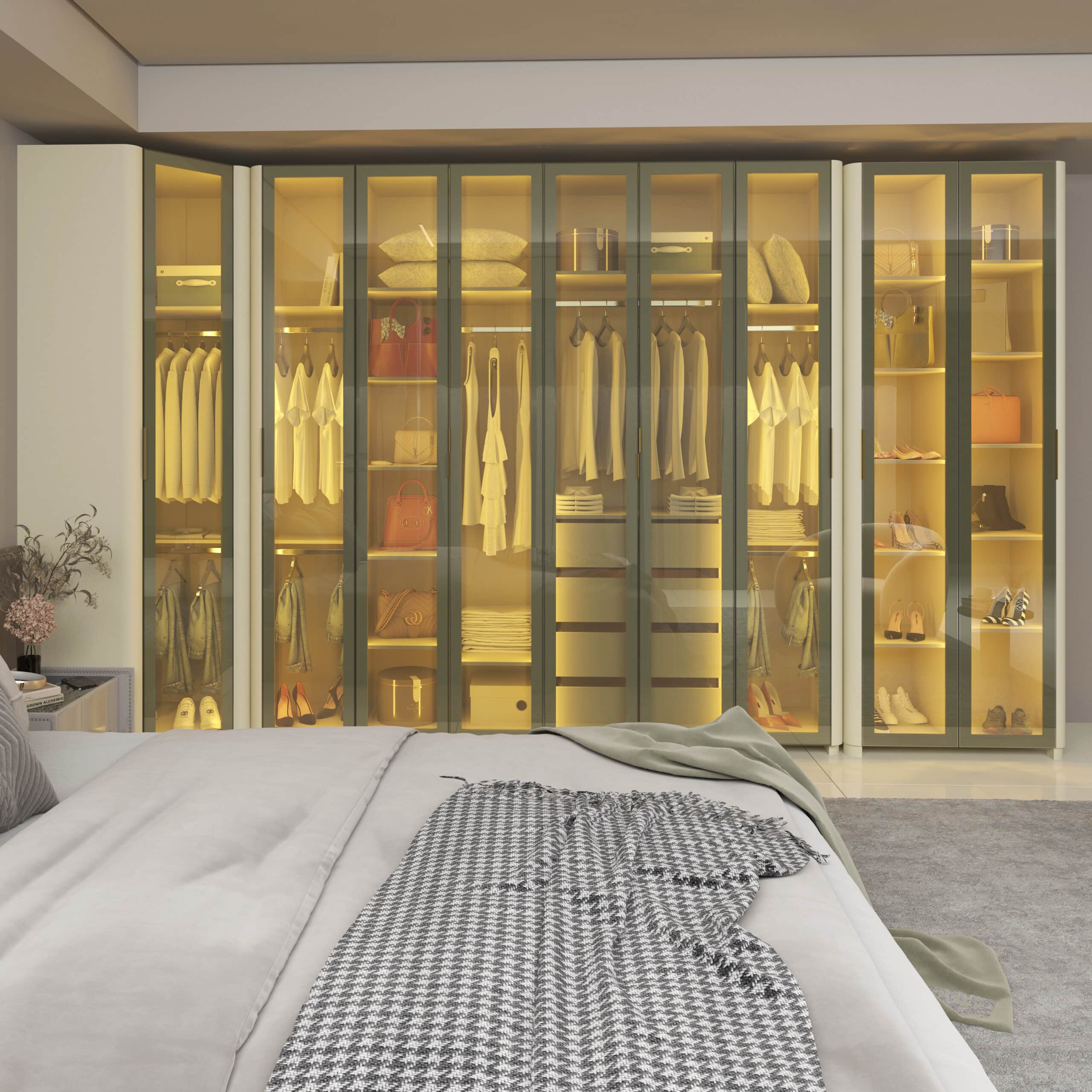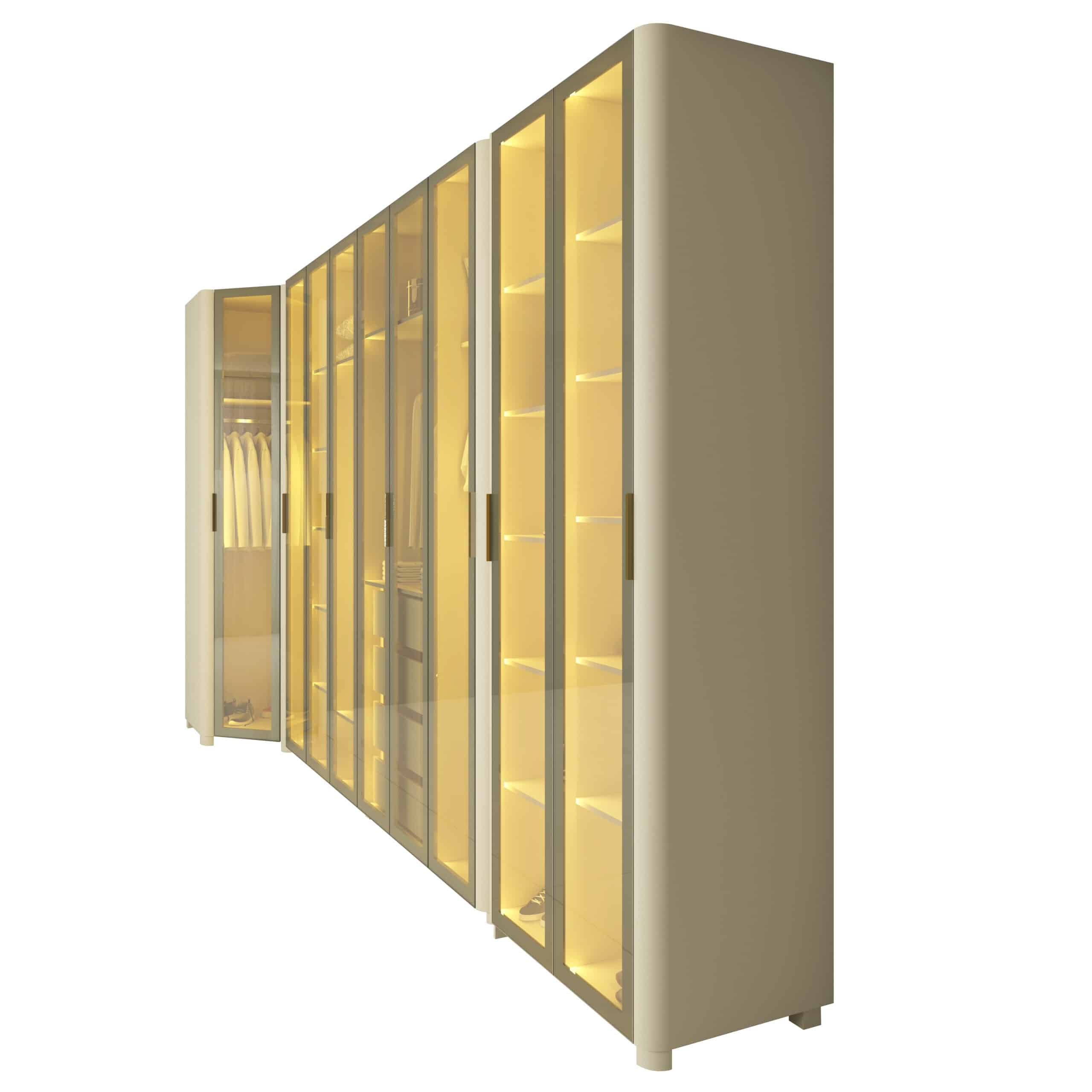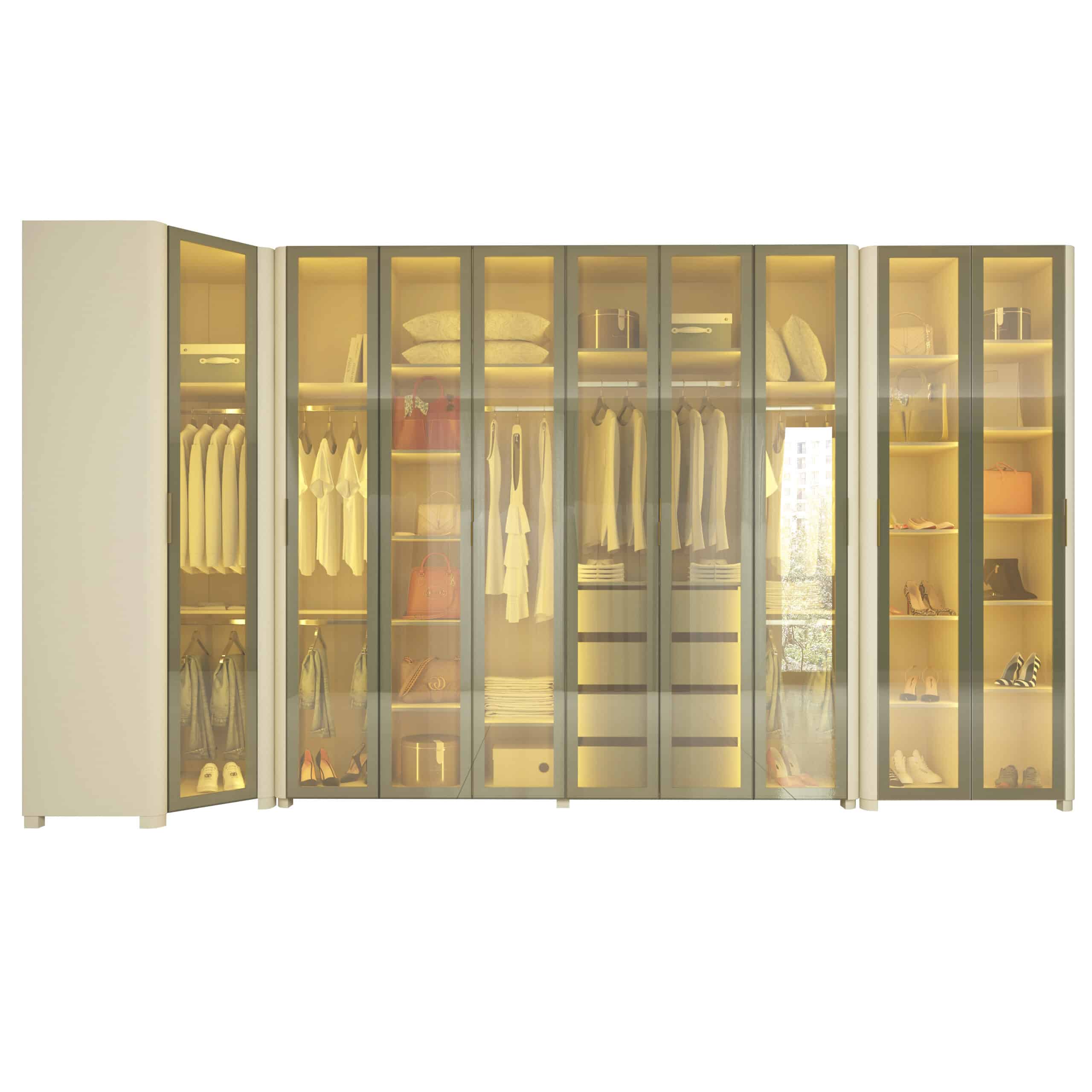 As portas em vidro reflecta com moldura em alumínio e a iluminação LED quente embutida criam um visual moderno e acolhedor, destacando o interior e realçando o acabamento premium do MDF.