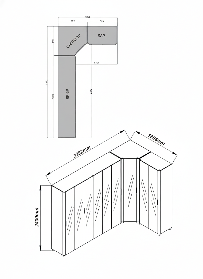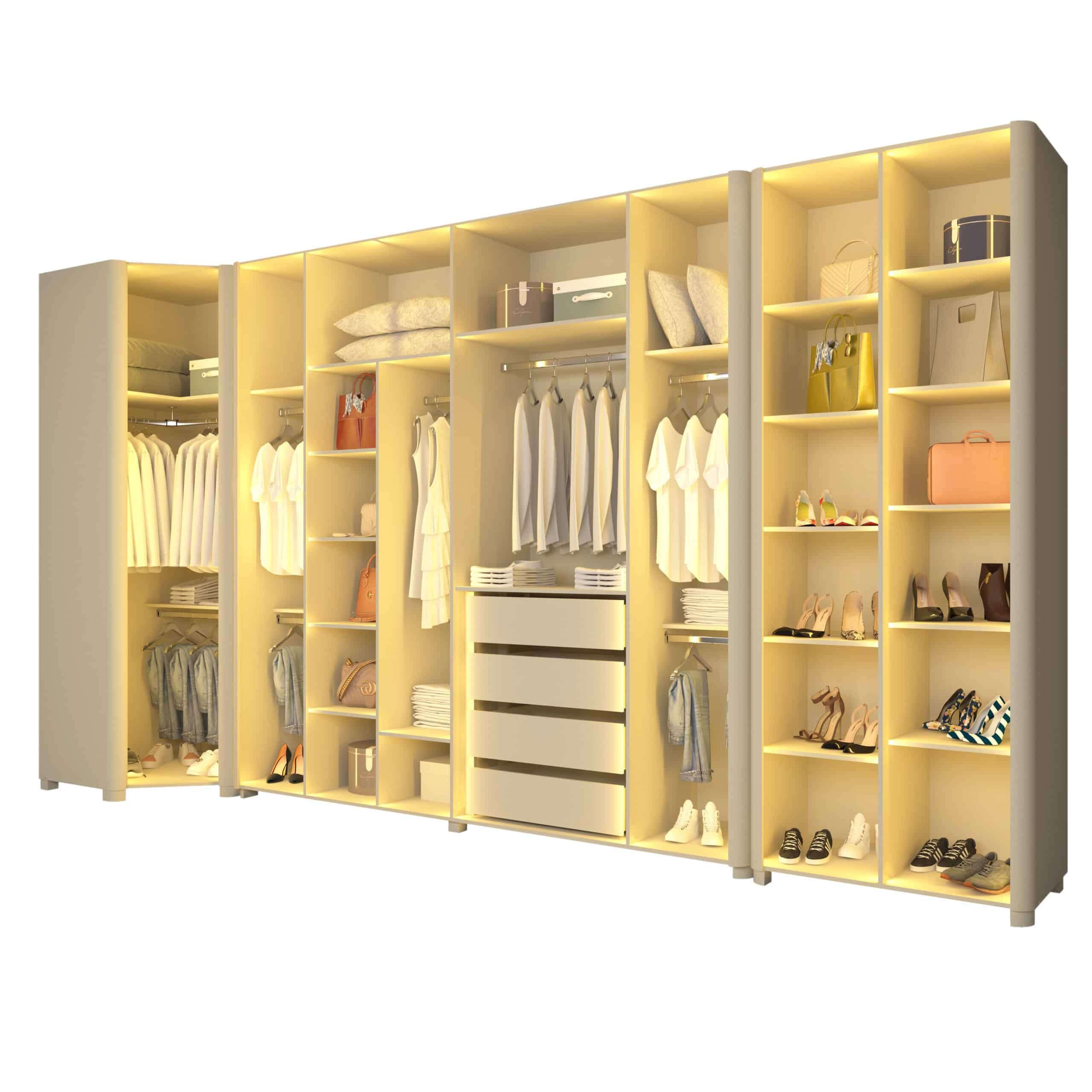 Composto por Roupeiro INNOVA 6 portas, Canto INNOVA e Sapateira INNOVA 2 portas, este modulado foi pensado para oferecer amplitude, organização e requinte, valorizando cada detalhe do quarto.