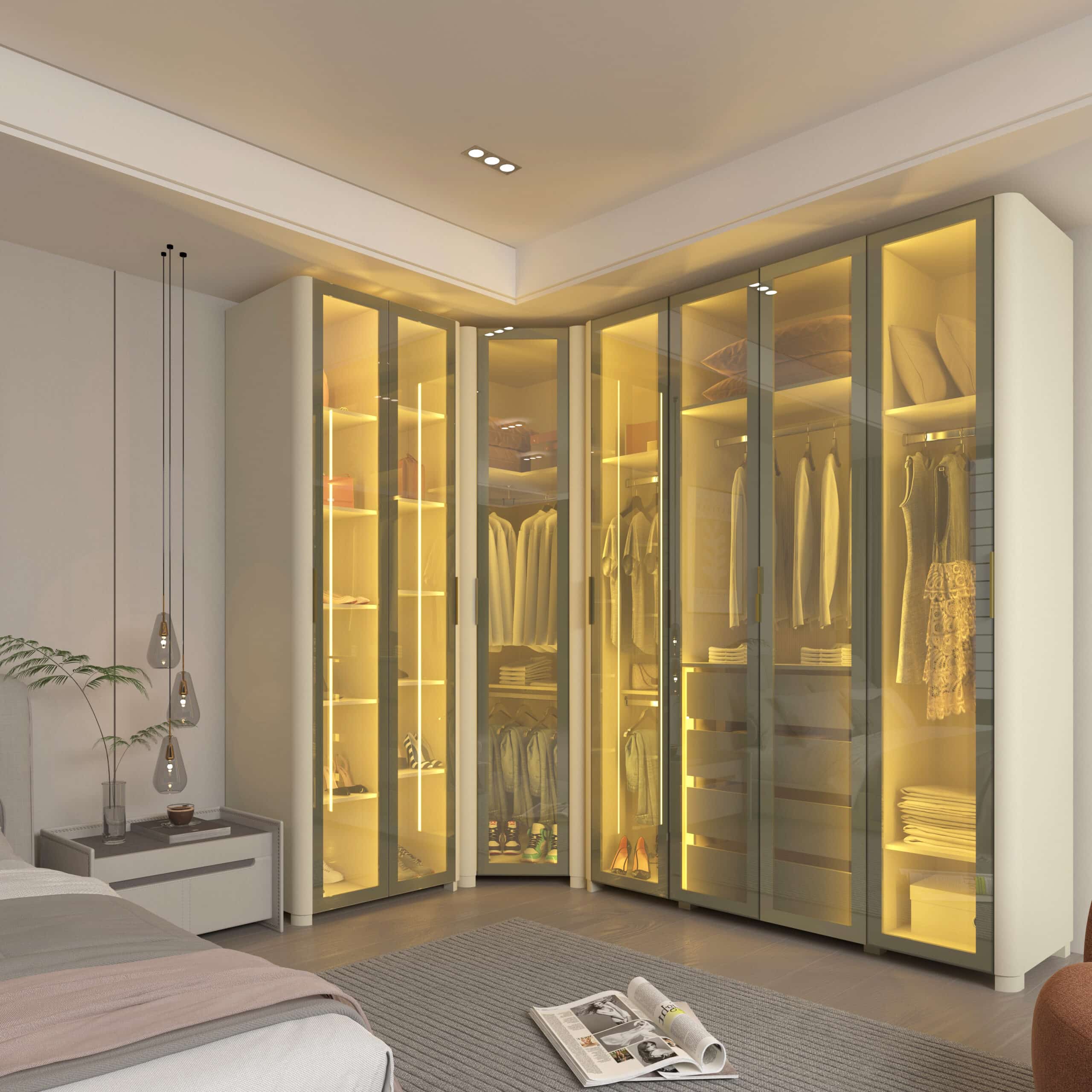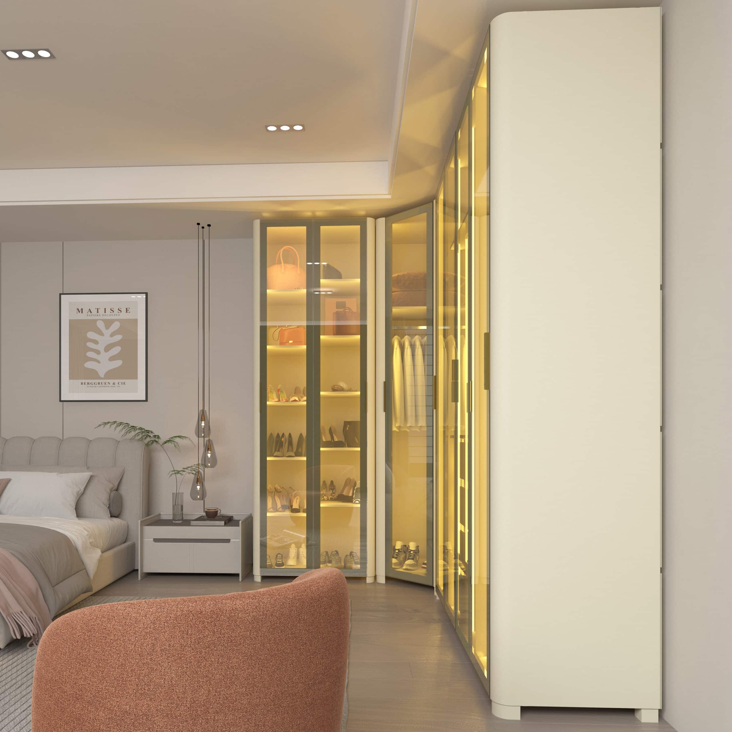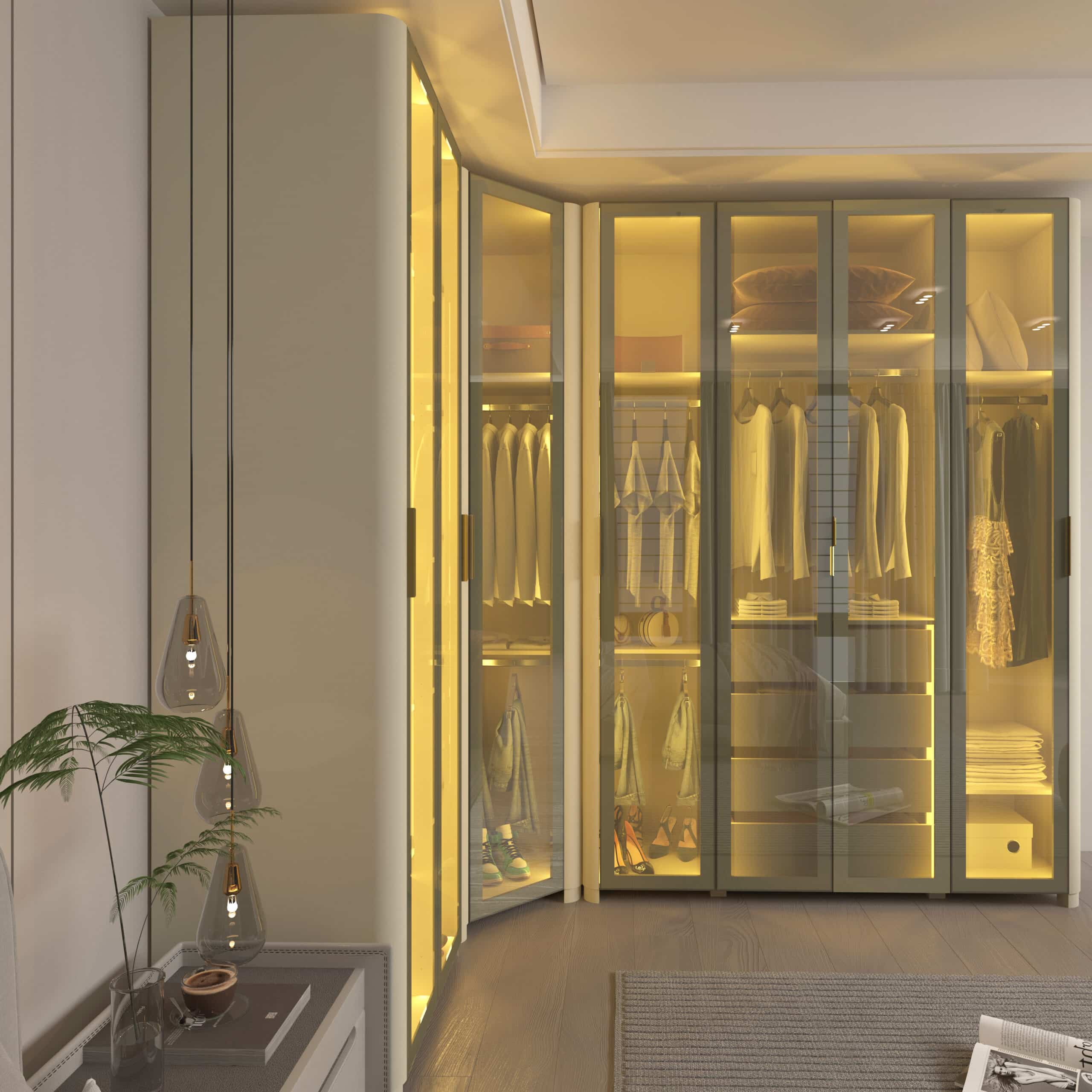 As portas em vidro reflecta e a iluminação LED quente embutida valorizam o interior do móvel, criando uma atmosfera aconchegante e moderna.