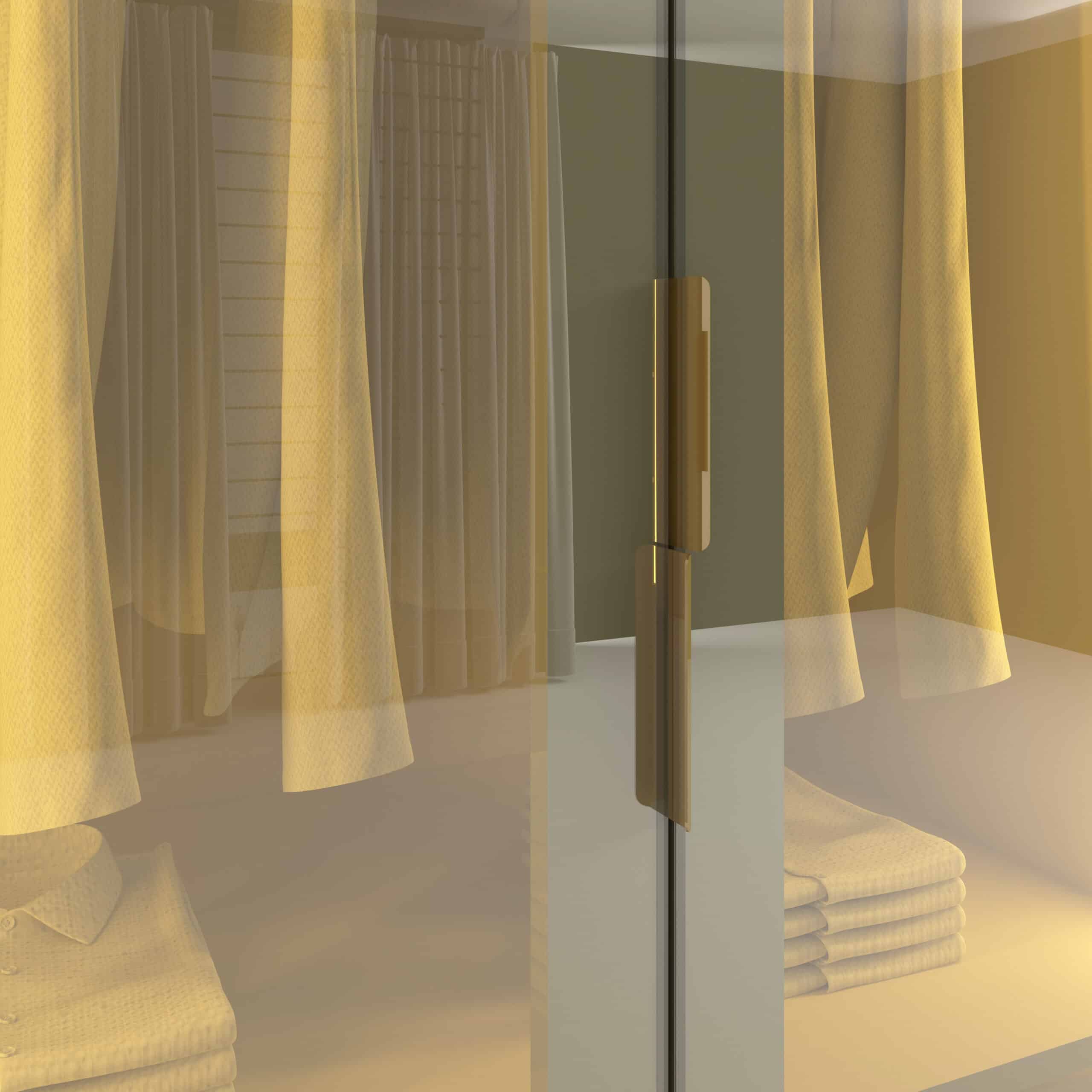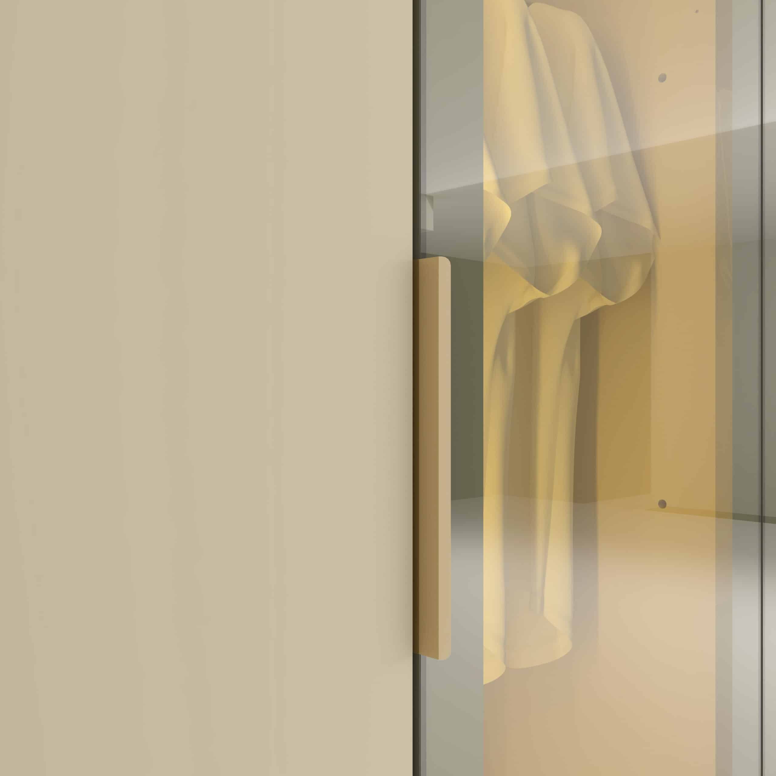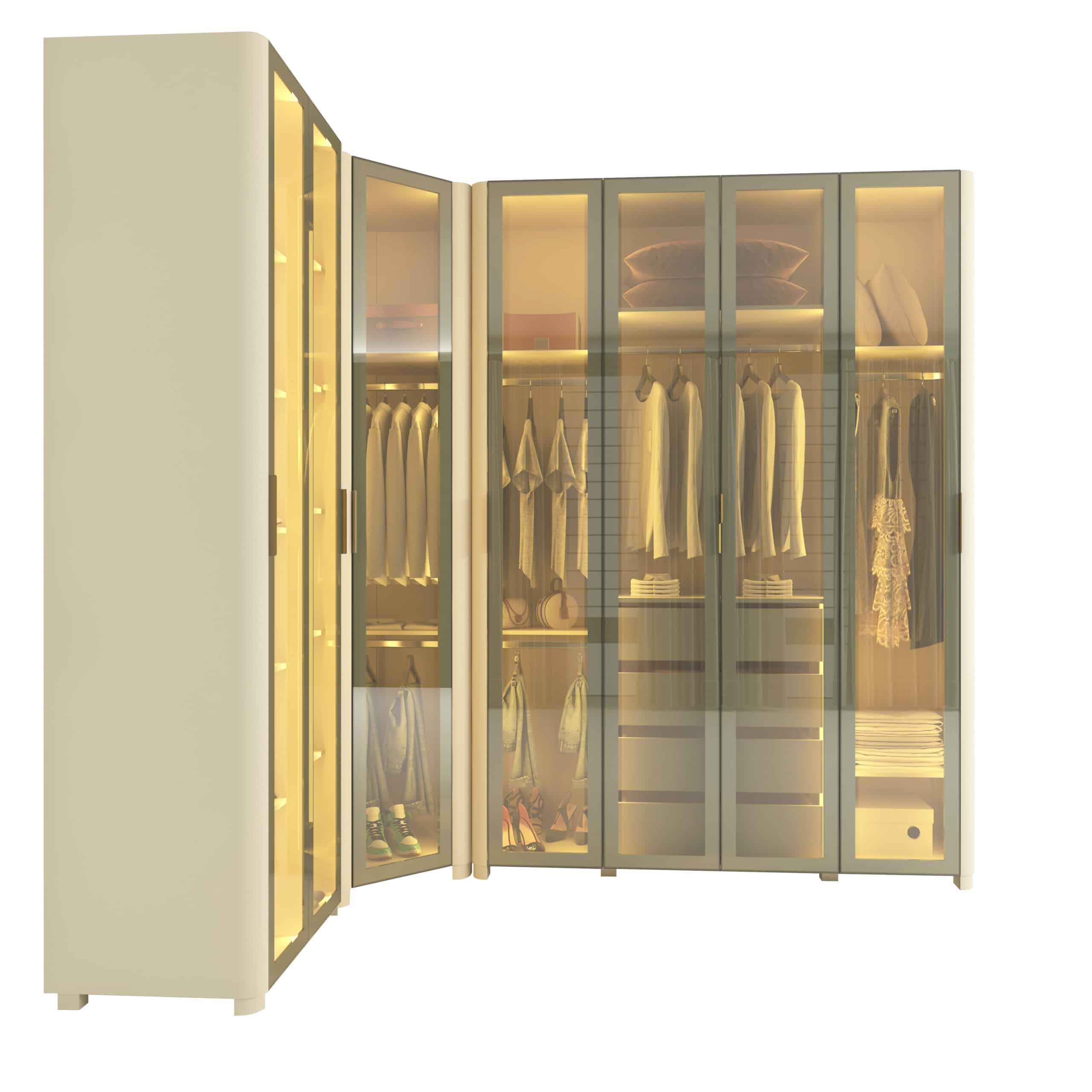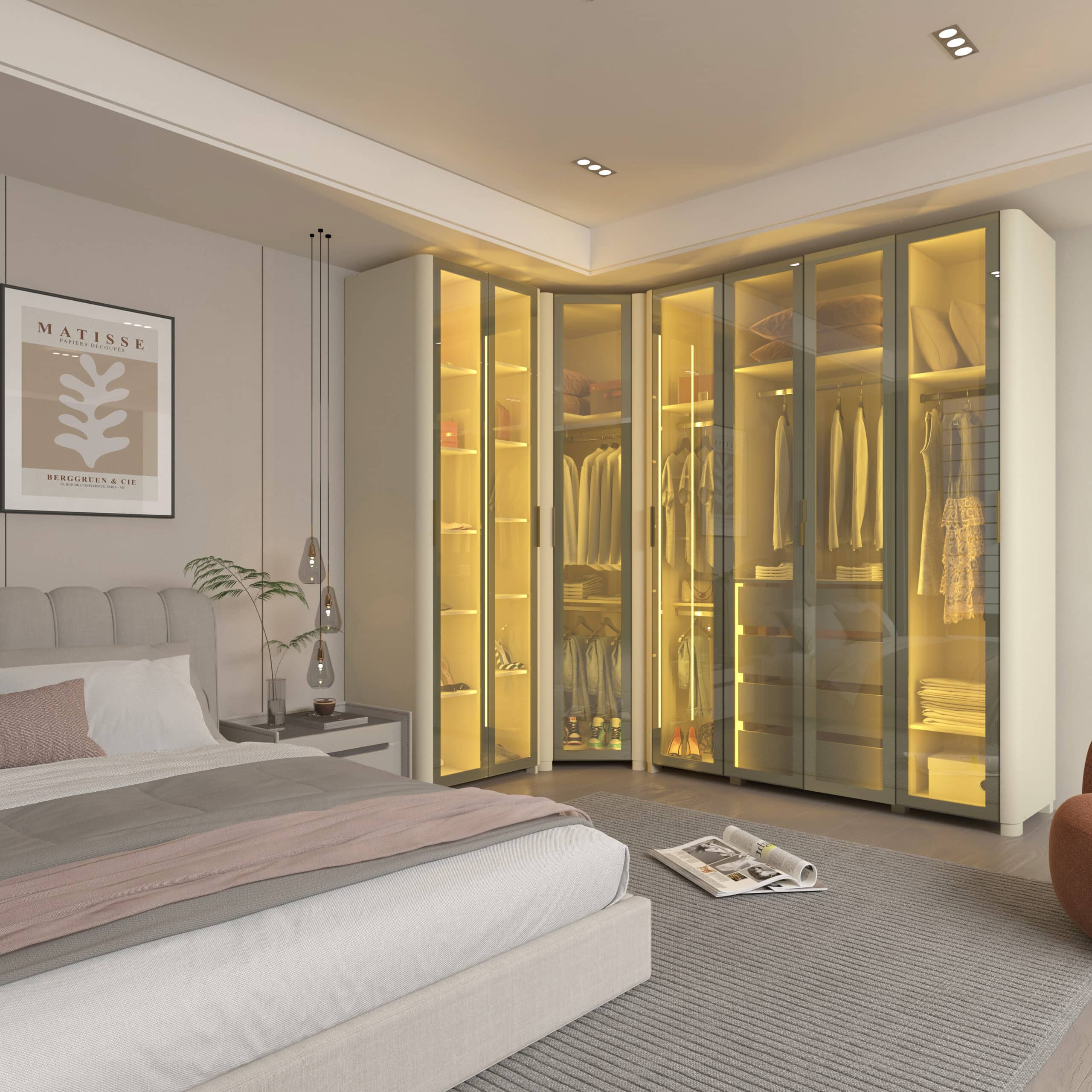 As portas em vidro reflecta e a iluminação LED quente embutida valorizam o interior do móvel, criando uma atmosfera aconchegante e moderna.