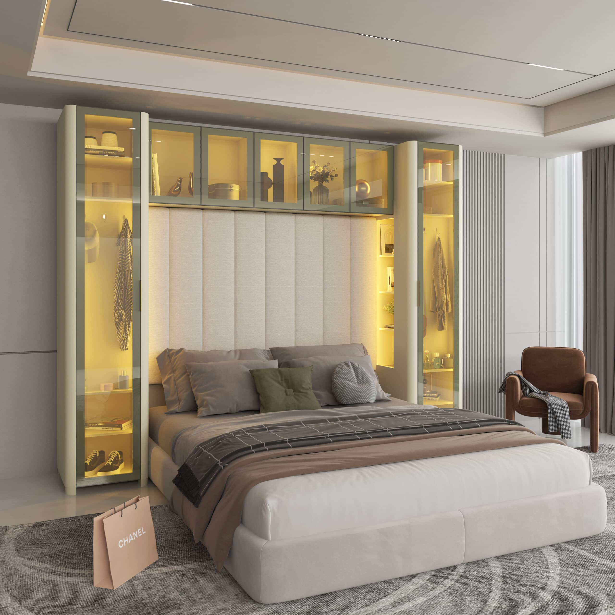 O design com cantos curvos e volumes integrados proporciona harmonia e fluidez visual, transformando o dormitório em um espaço de bem-estar e sofisticação.