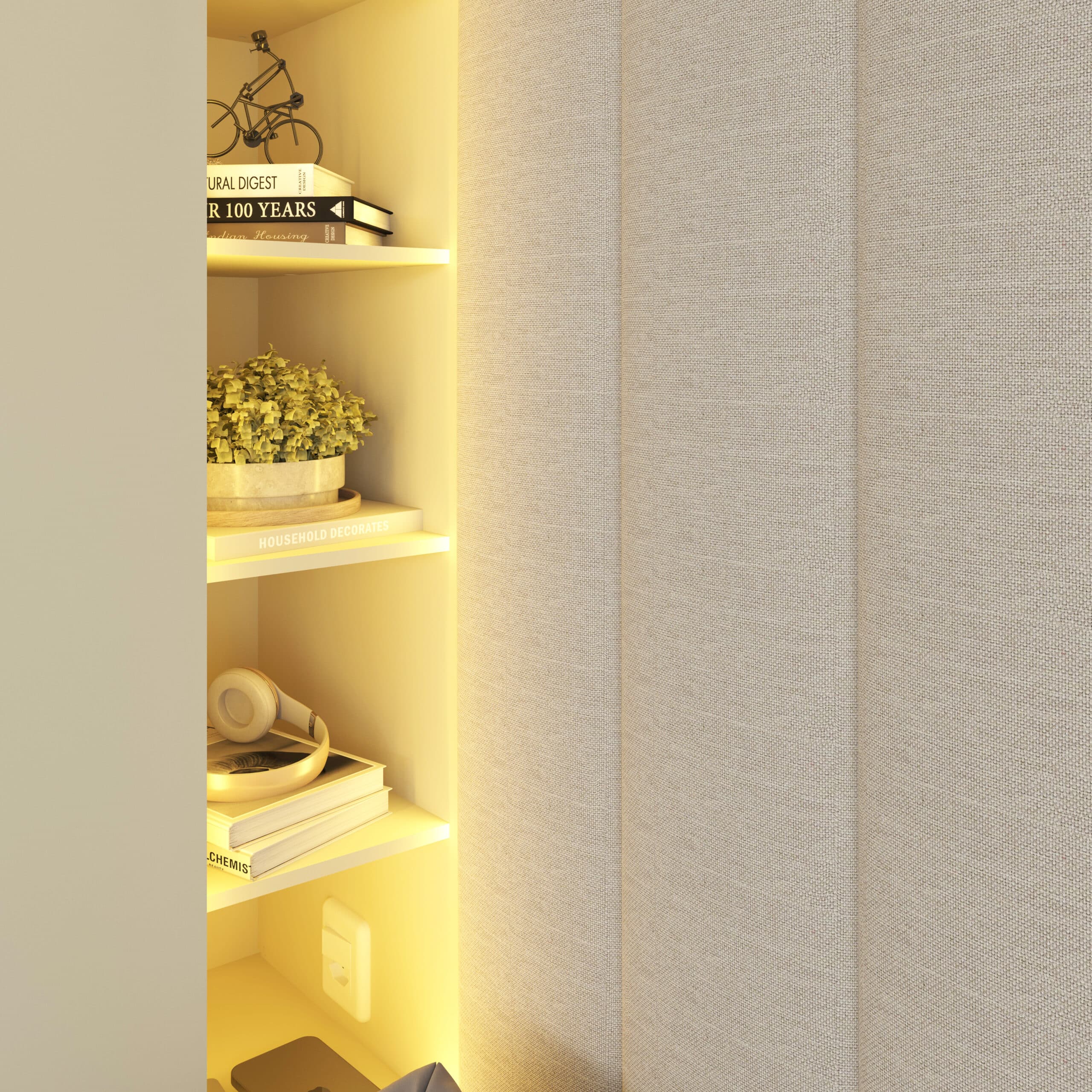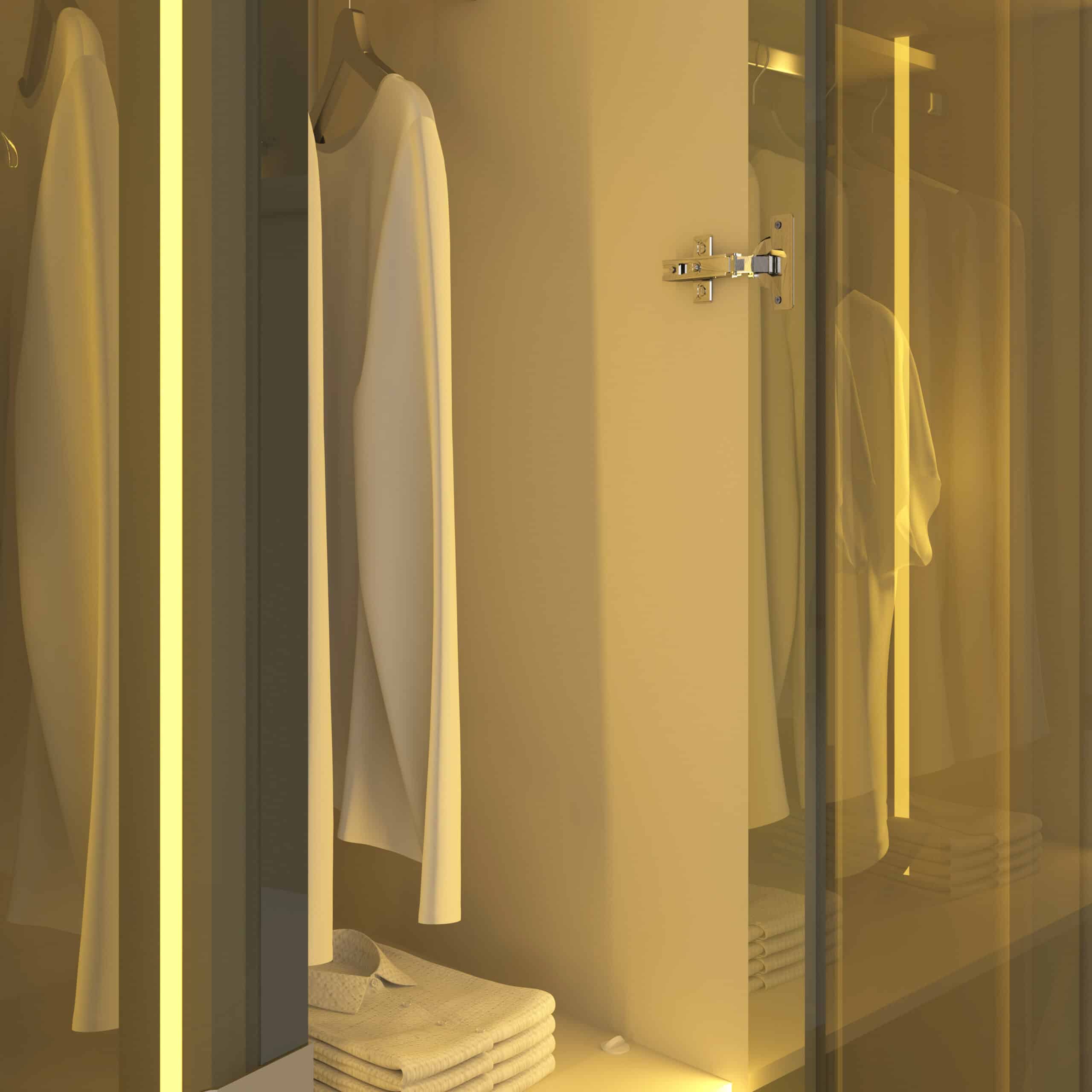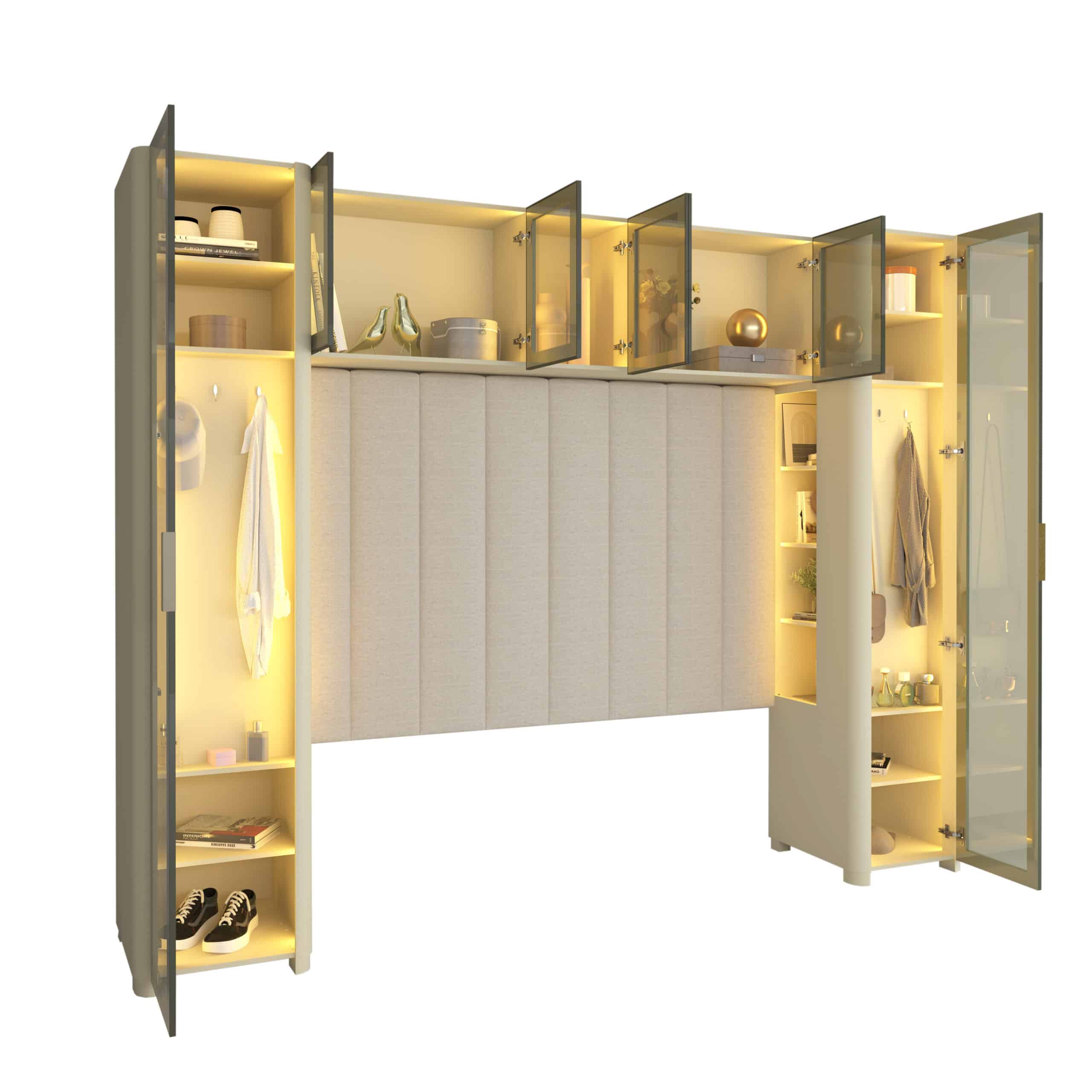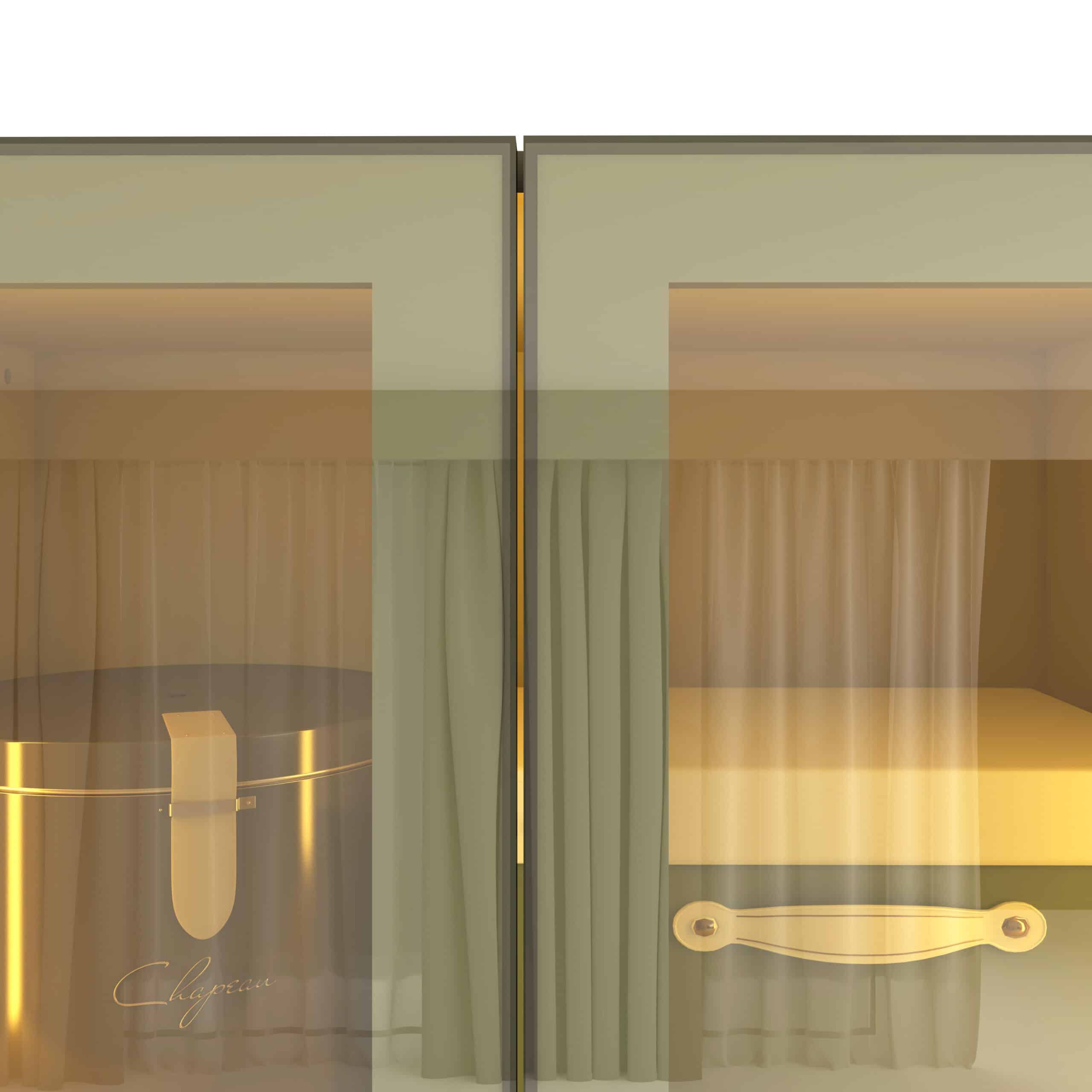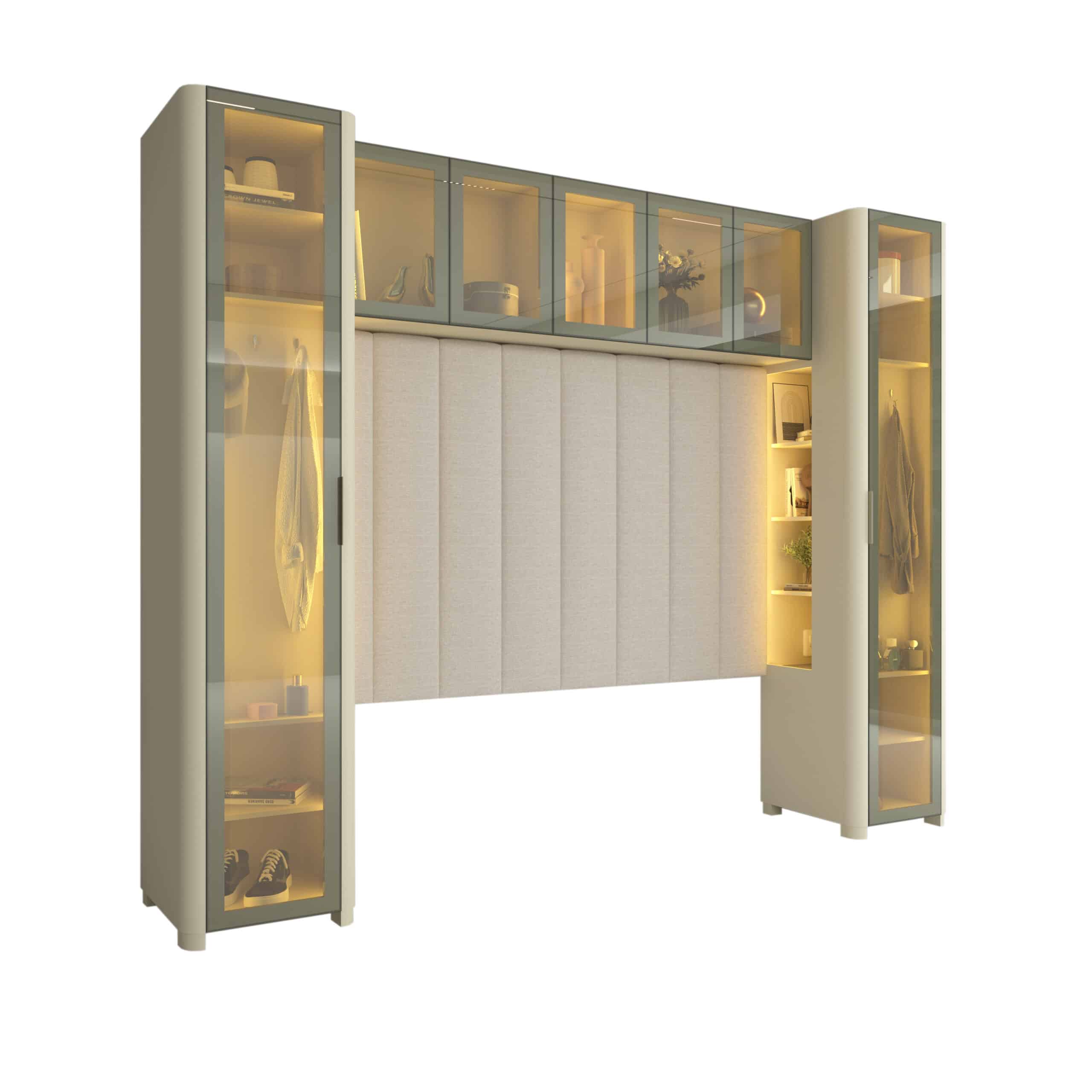 As portas em vidro reflecta e a iluminação LED quente destacam os objetos decorativos e valorizam o interior do mobiliário, criando uma atmosfera charmosa e convidativa.