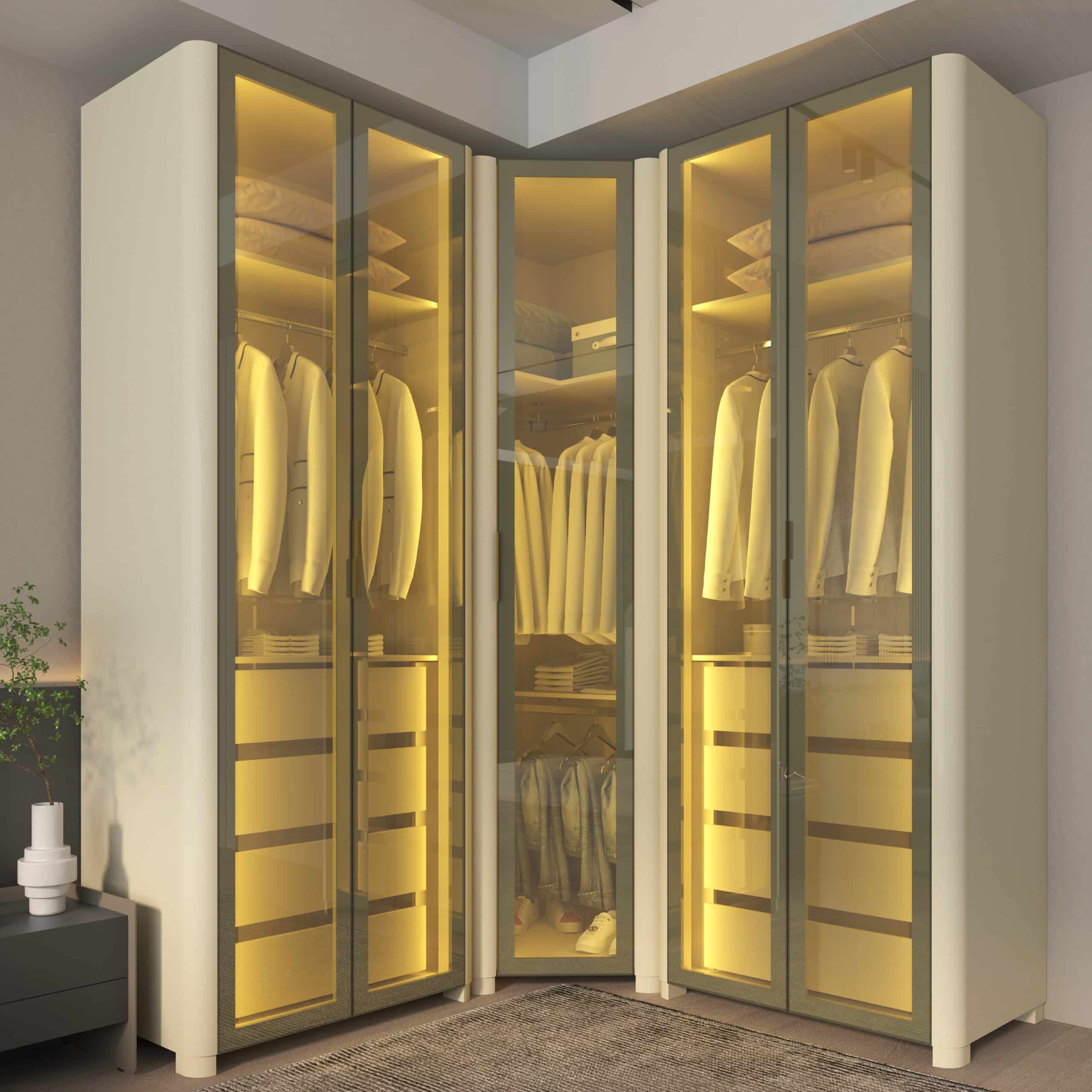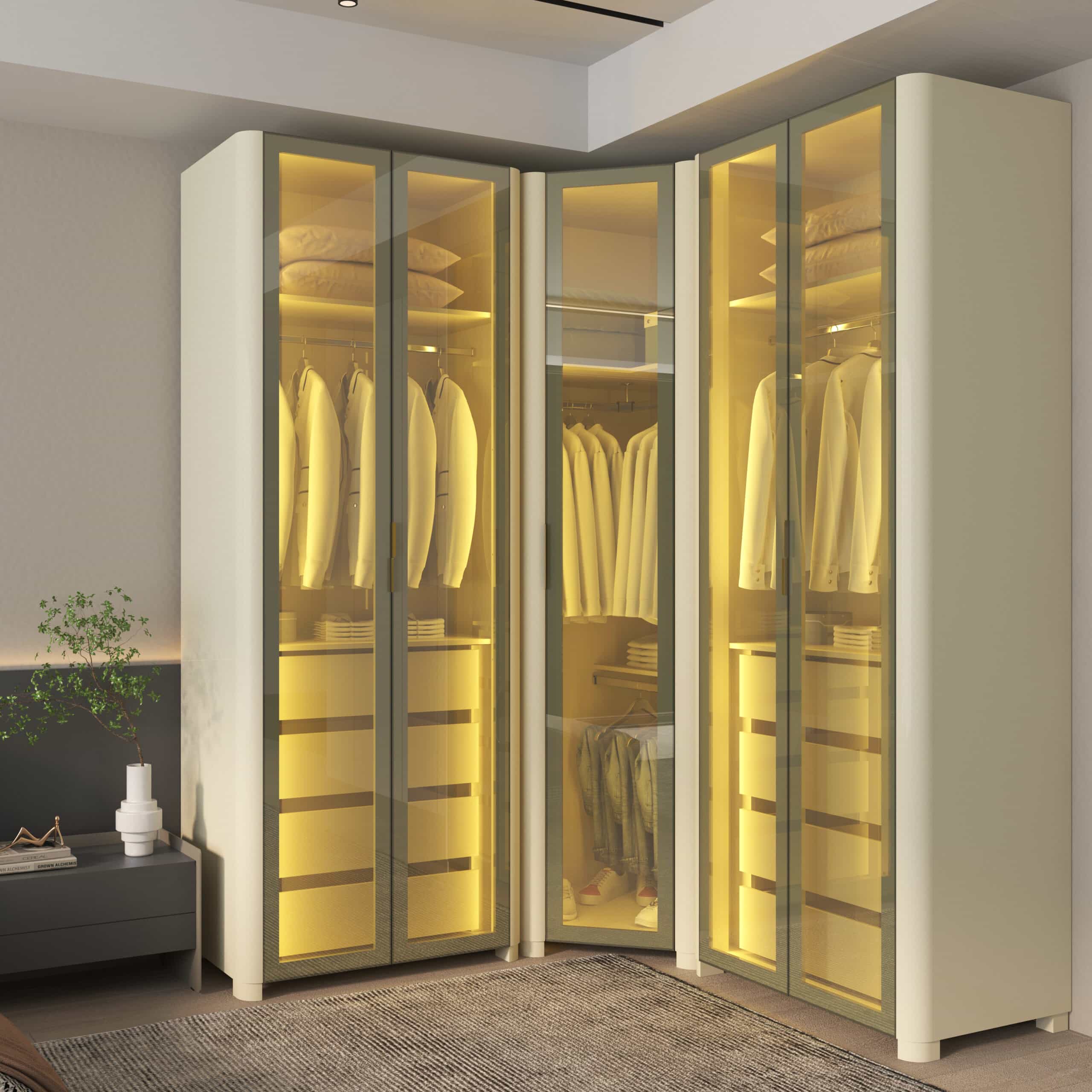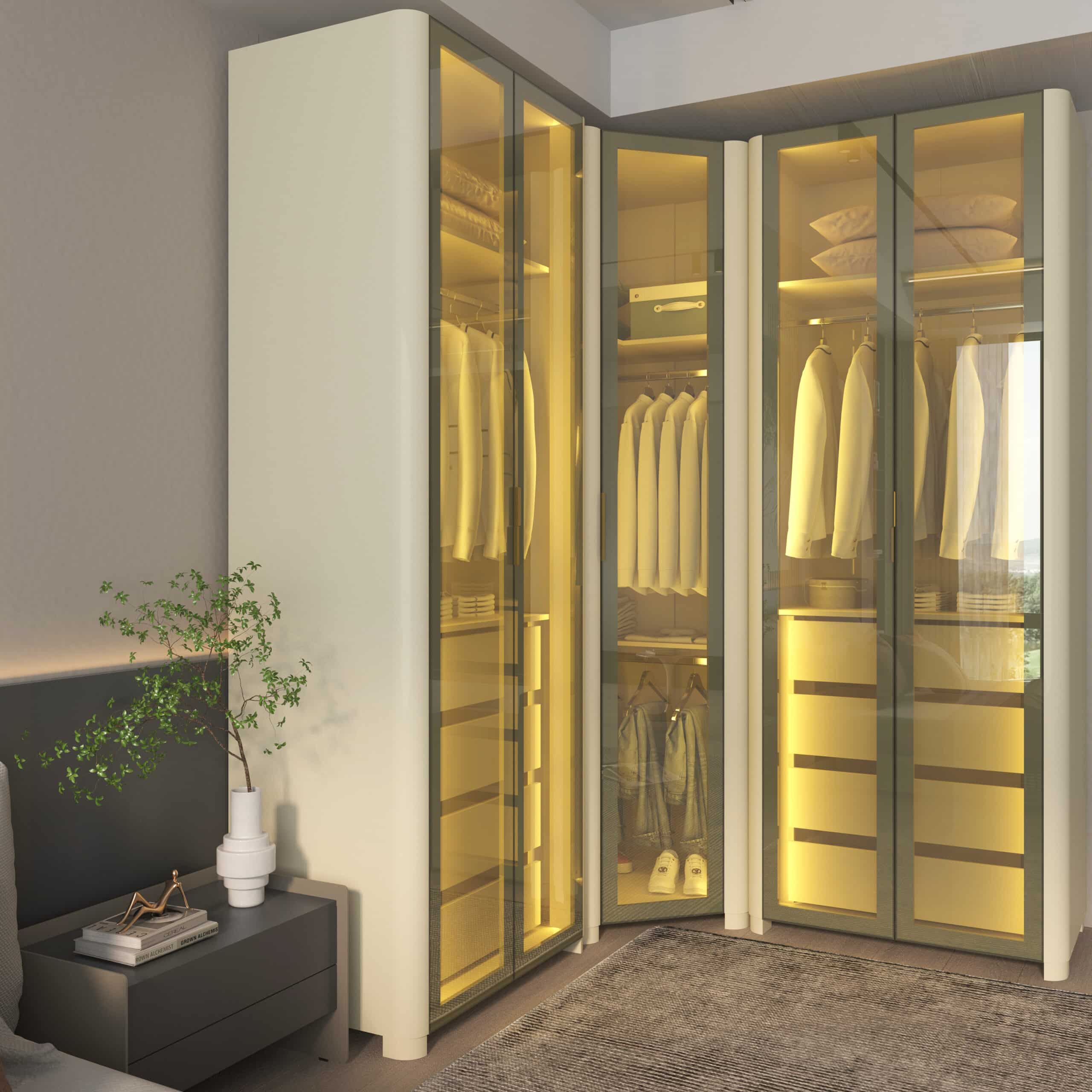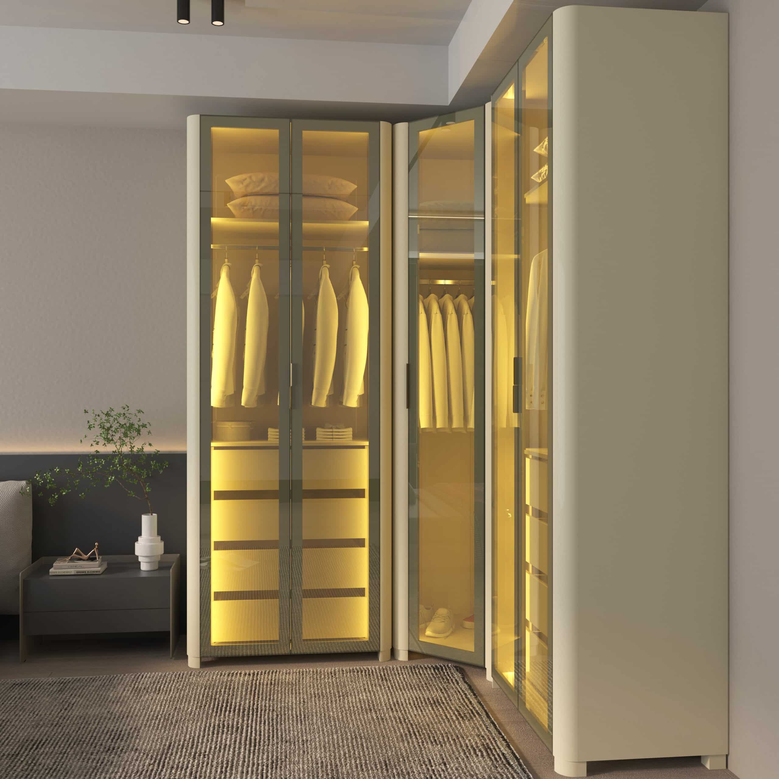 As portas em vidro reflecta e a iluminação LED quente embutida criam uma atmosfera aconchegante e sofisticada, destacando o interior e o acabamento refinado do MDF.