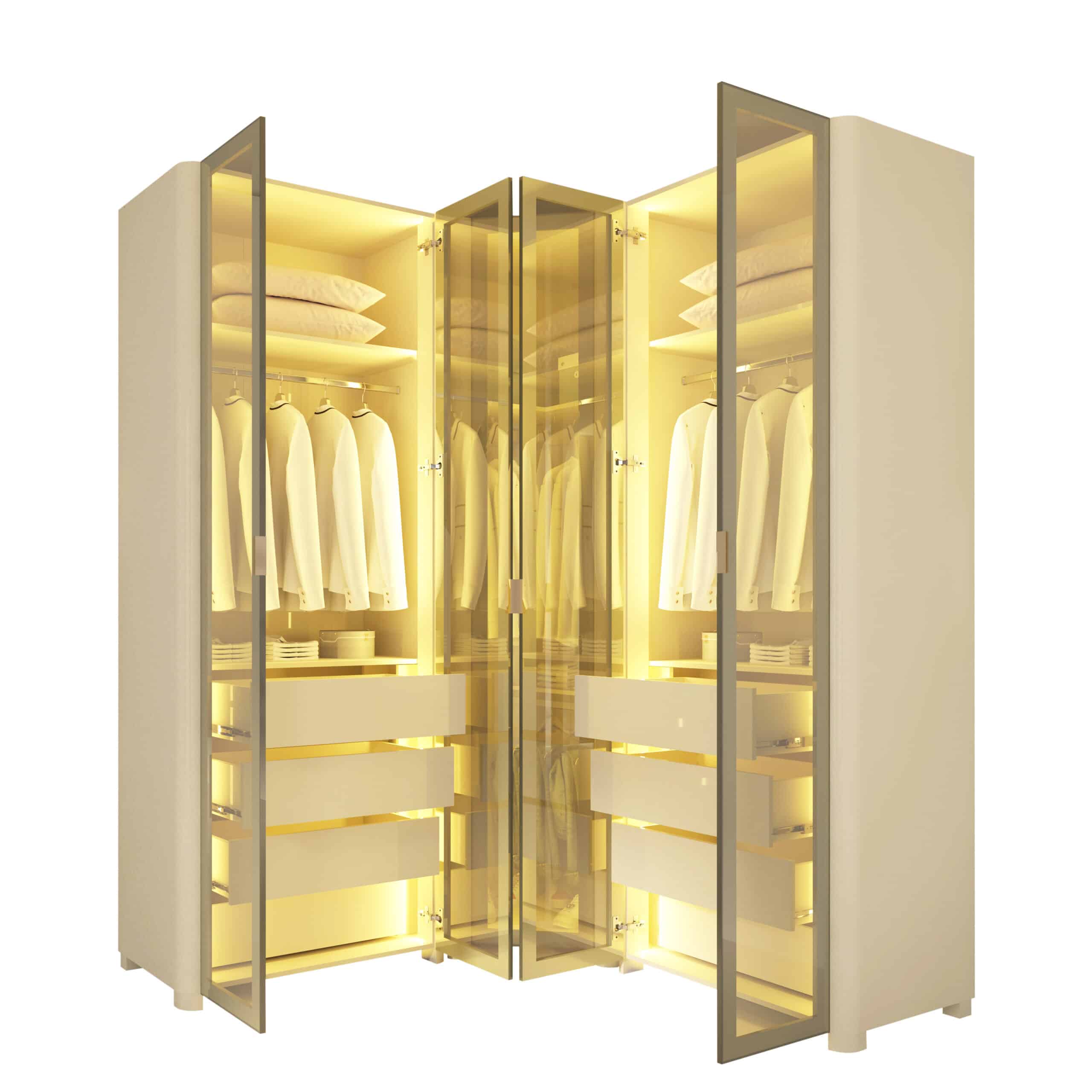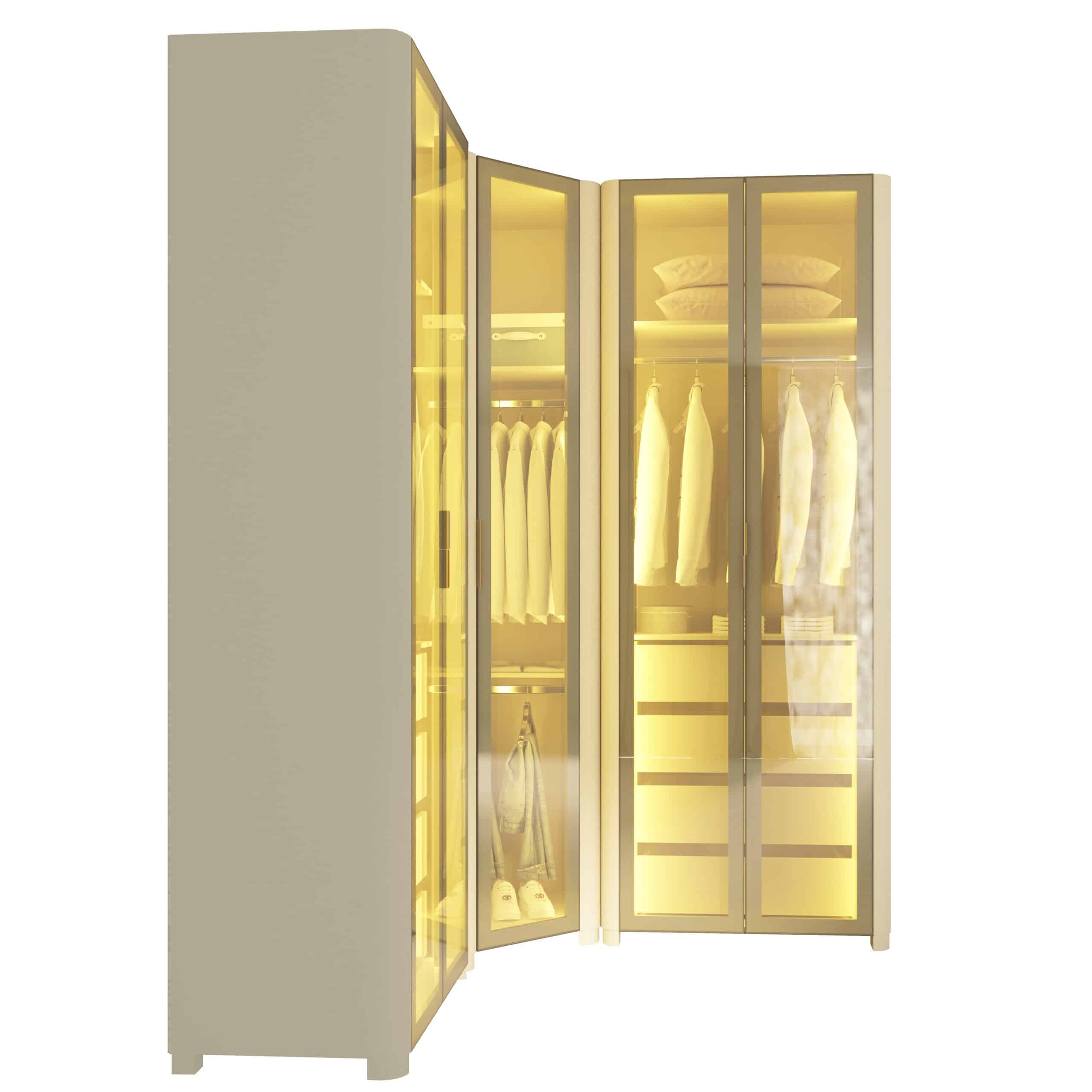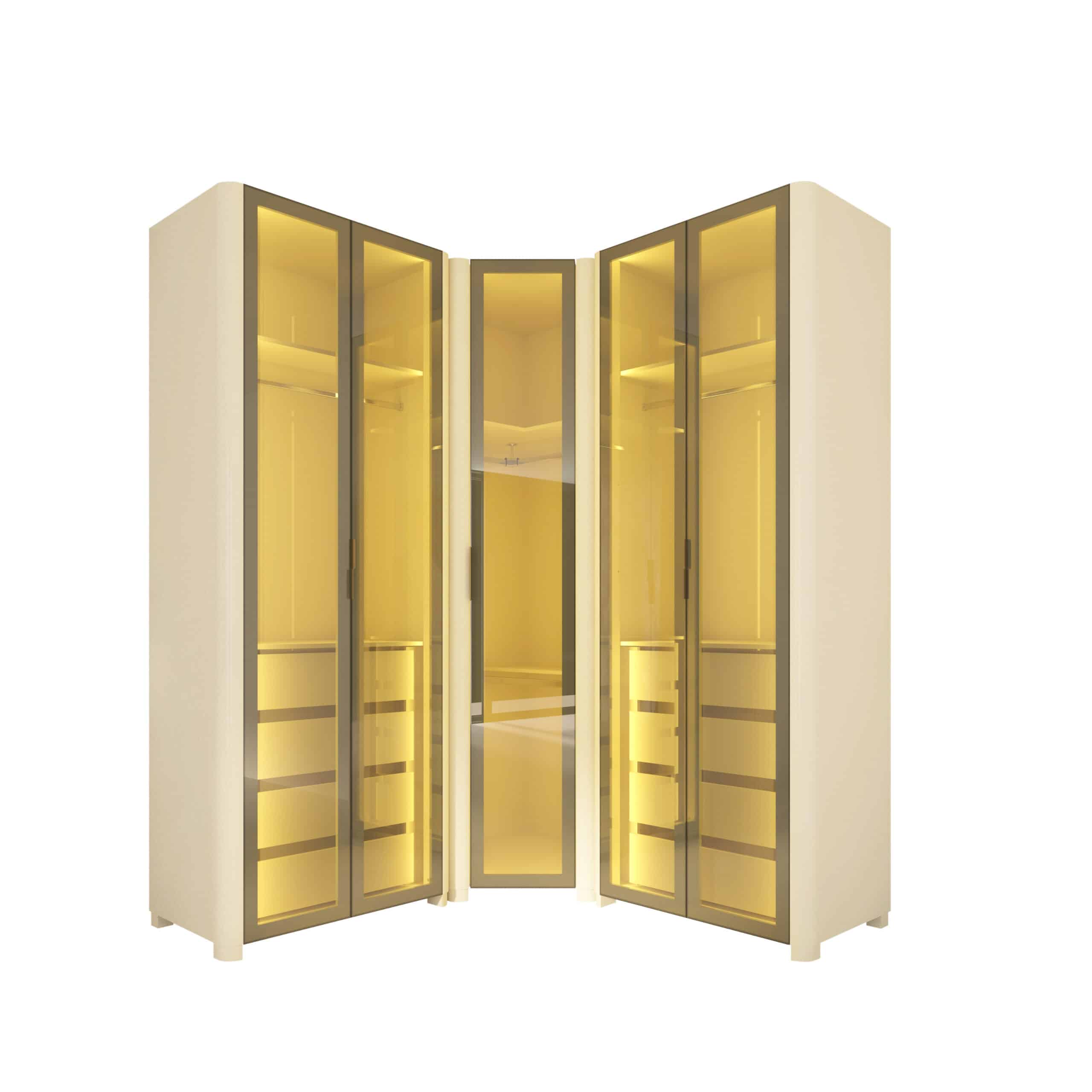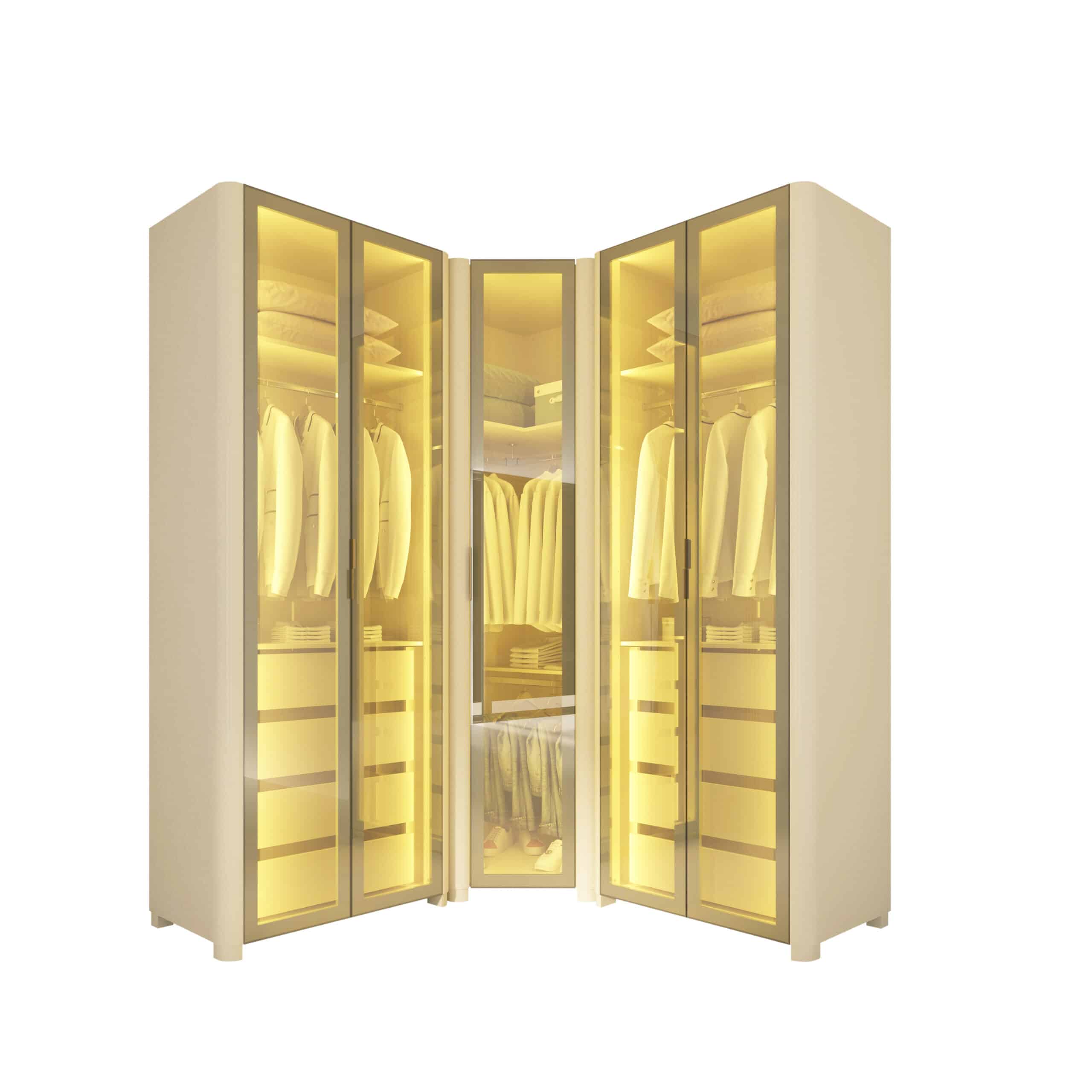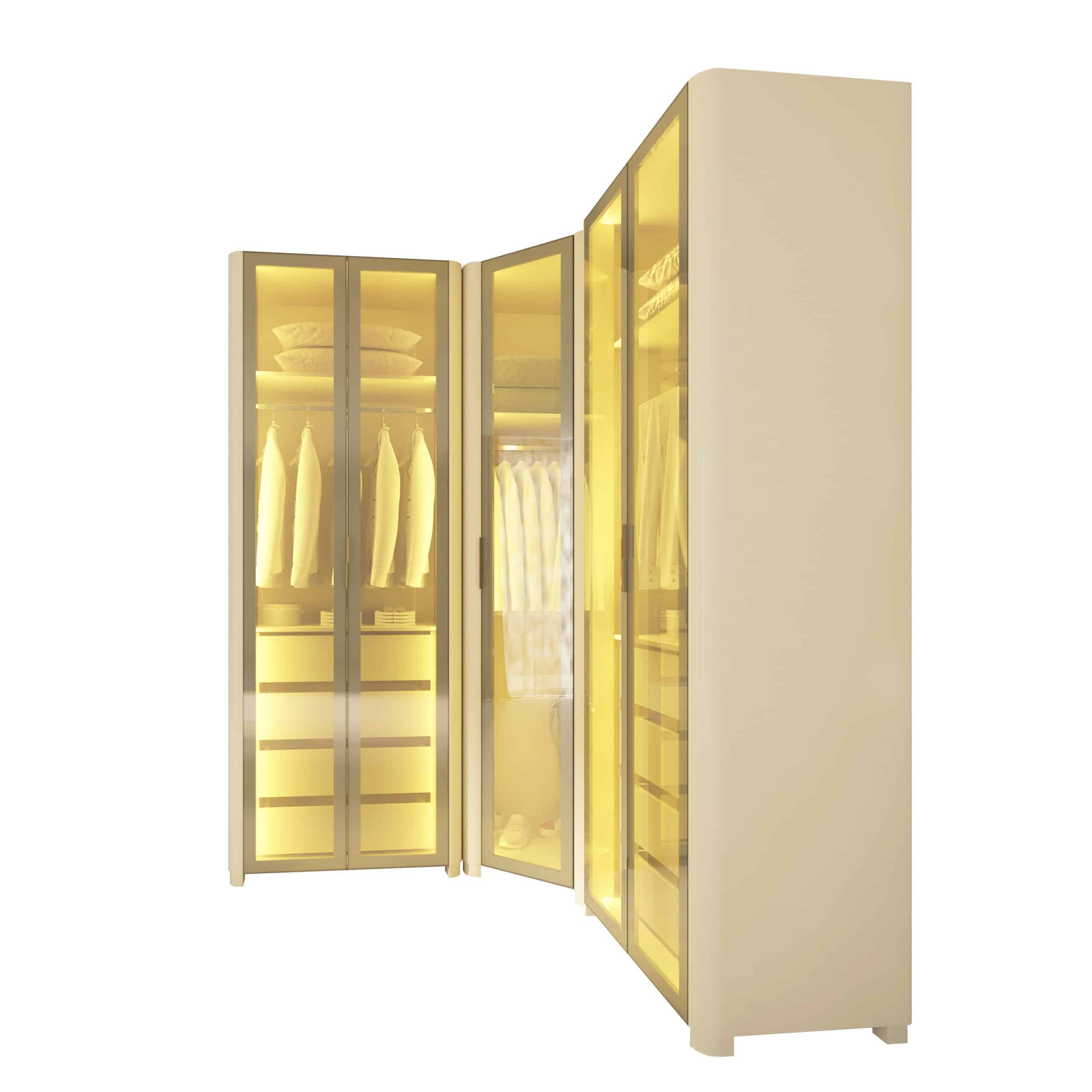 As portas em vidro reflecta e a iluminação LED quente embutida criam uma atmosfera aconchegante e sofisticada, destacando o interior e o acabamento refinado do MDF.