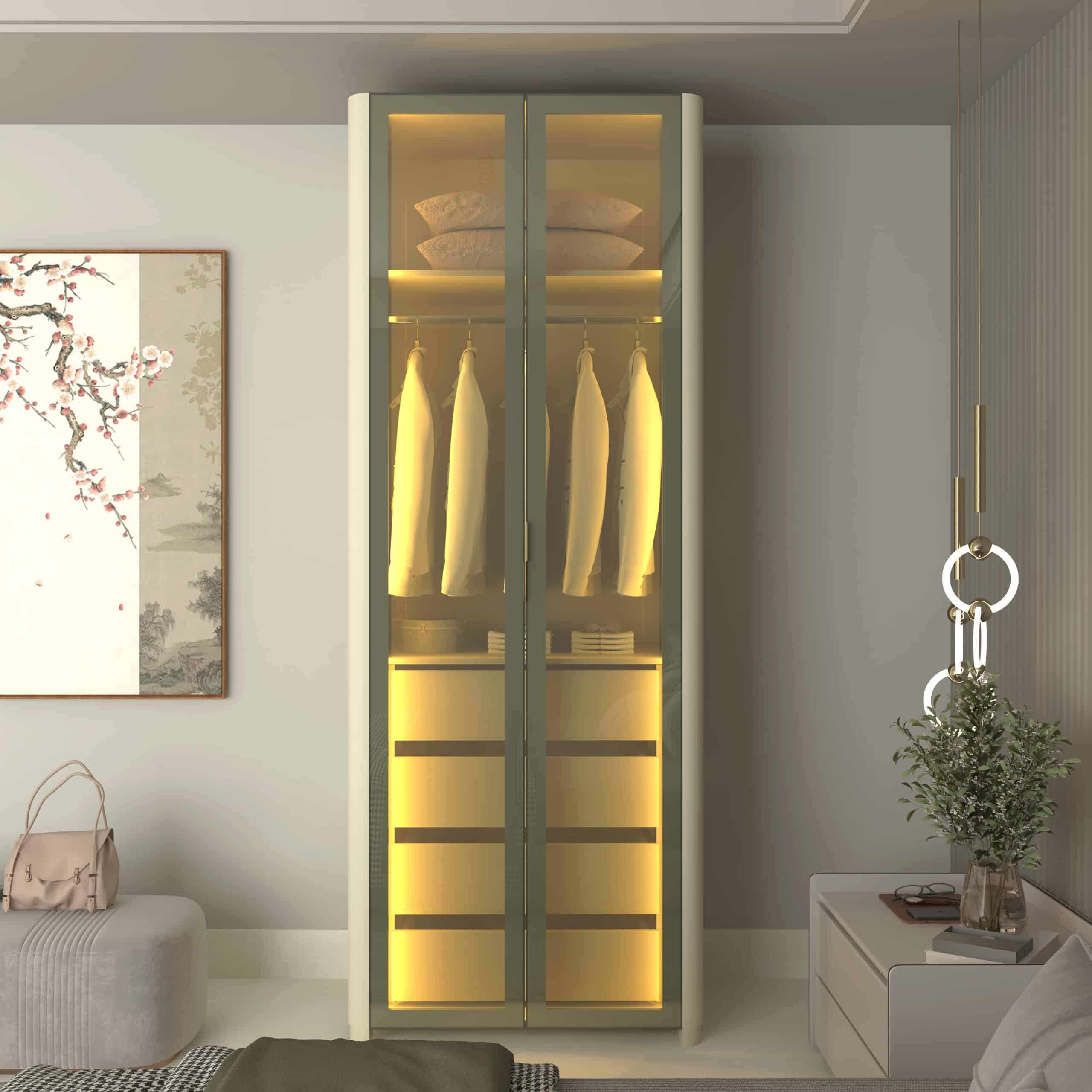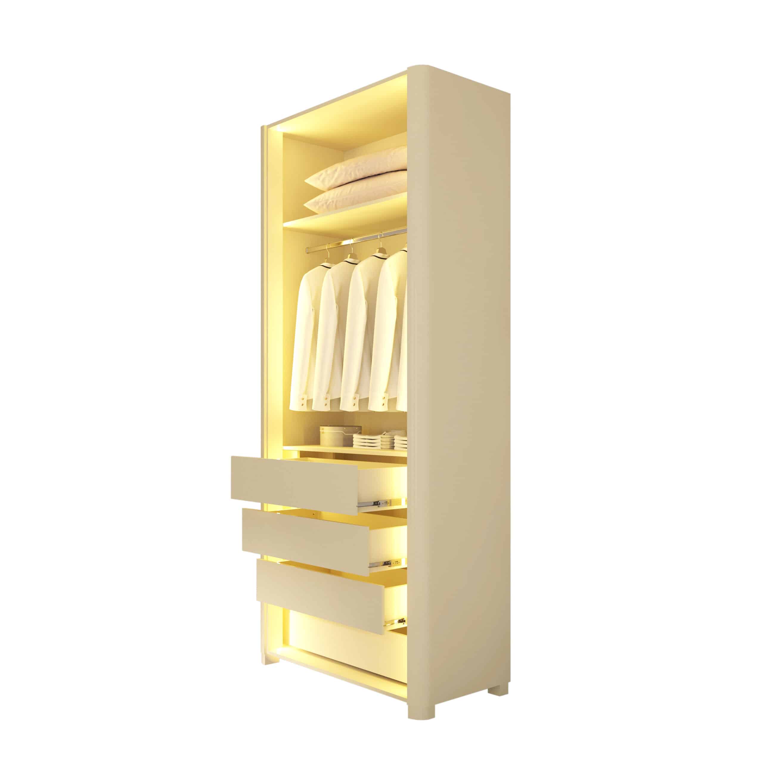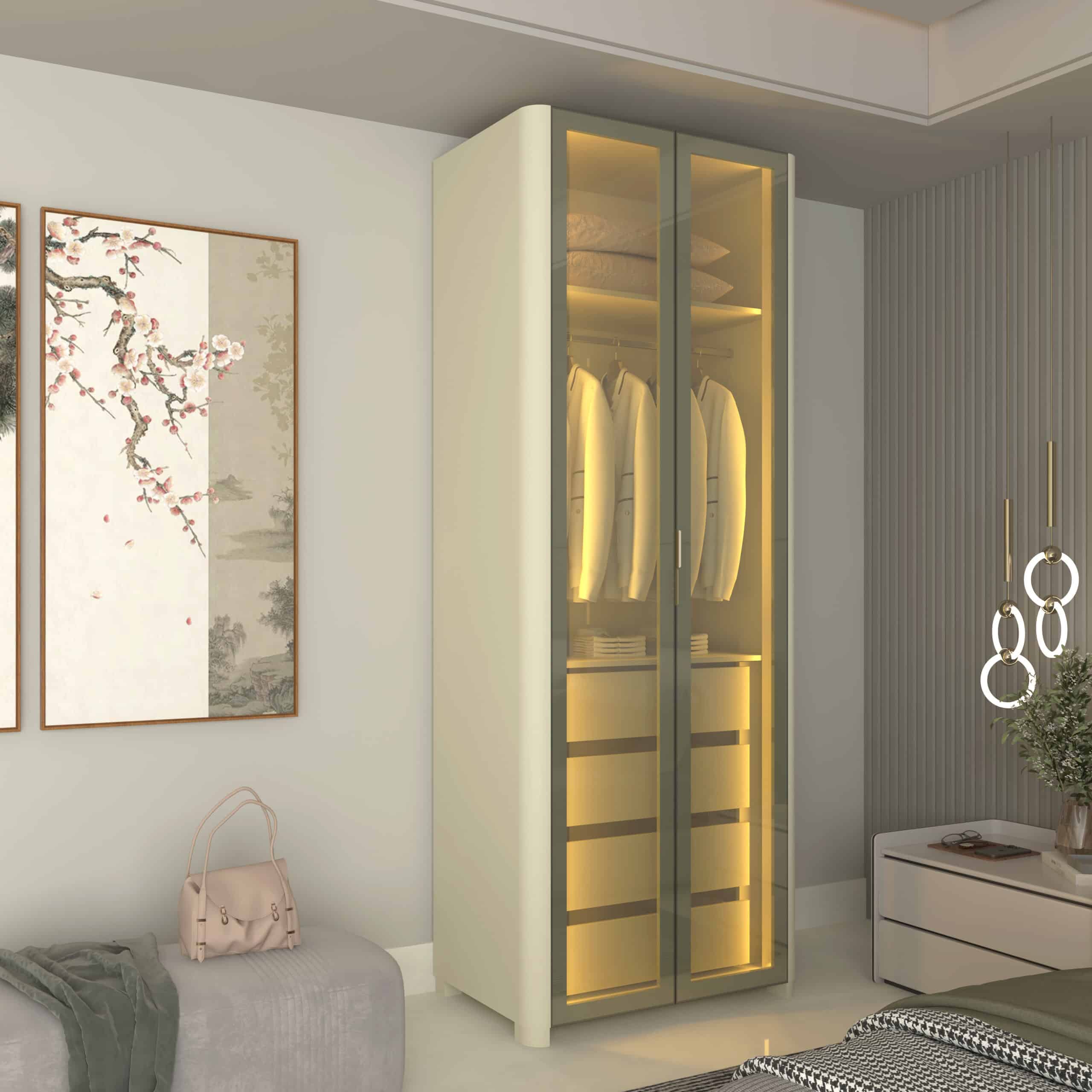 Com cantos curvos e acabamento premium, o modelo oferece gavetas espaçosas com corrediças telescópicas, amplo espaço interno e cabideiro metálico para melhor organização de roupas e acessórios.