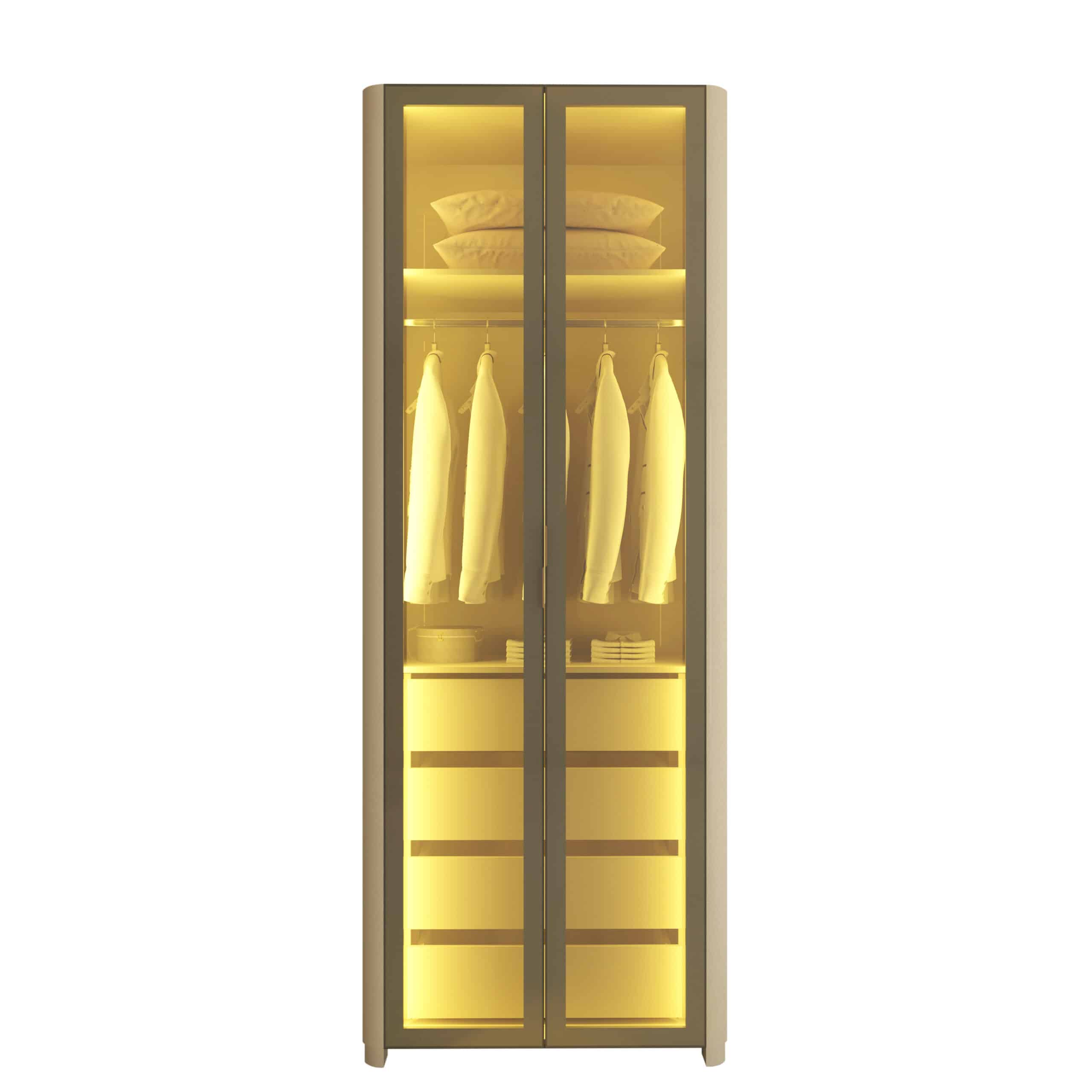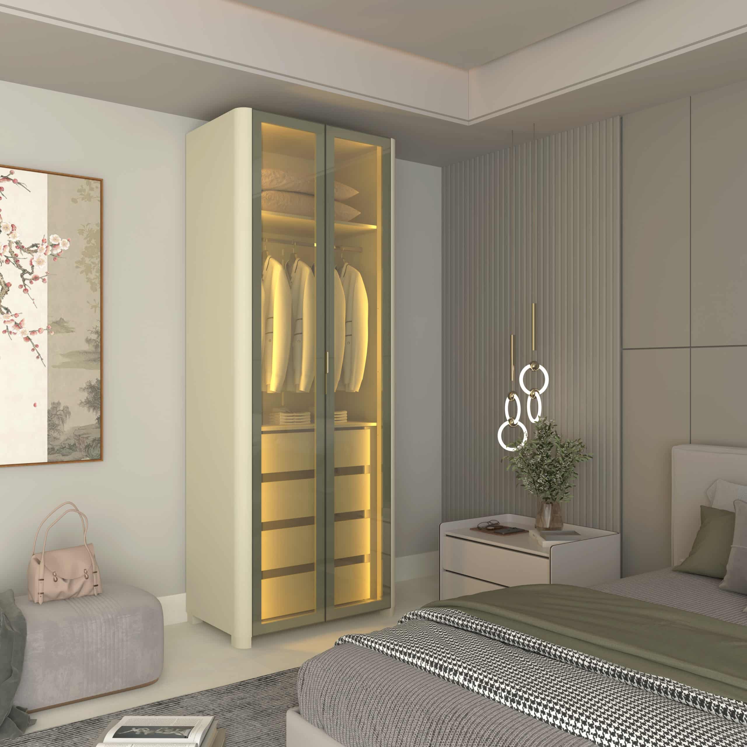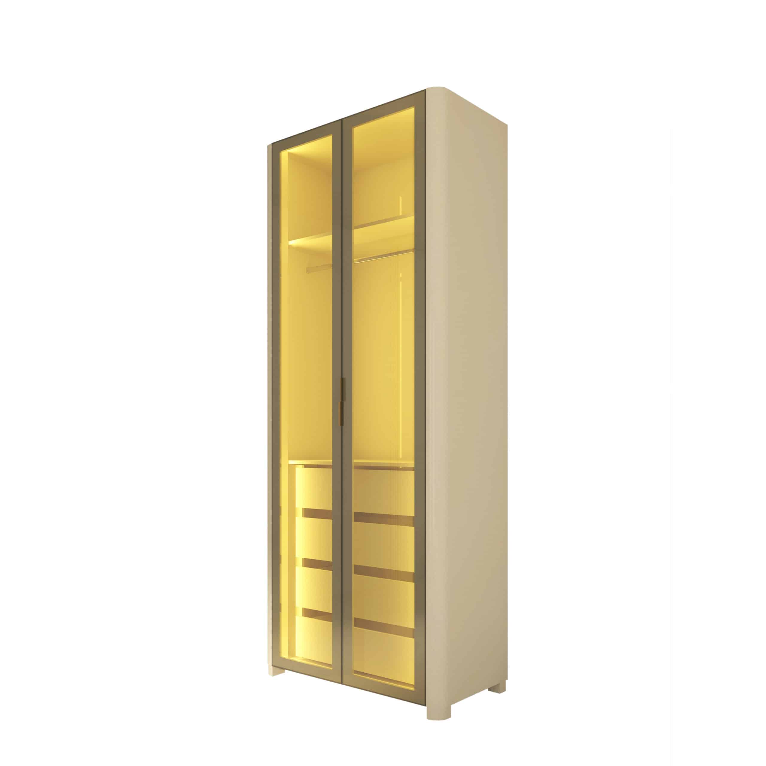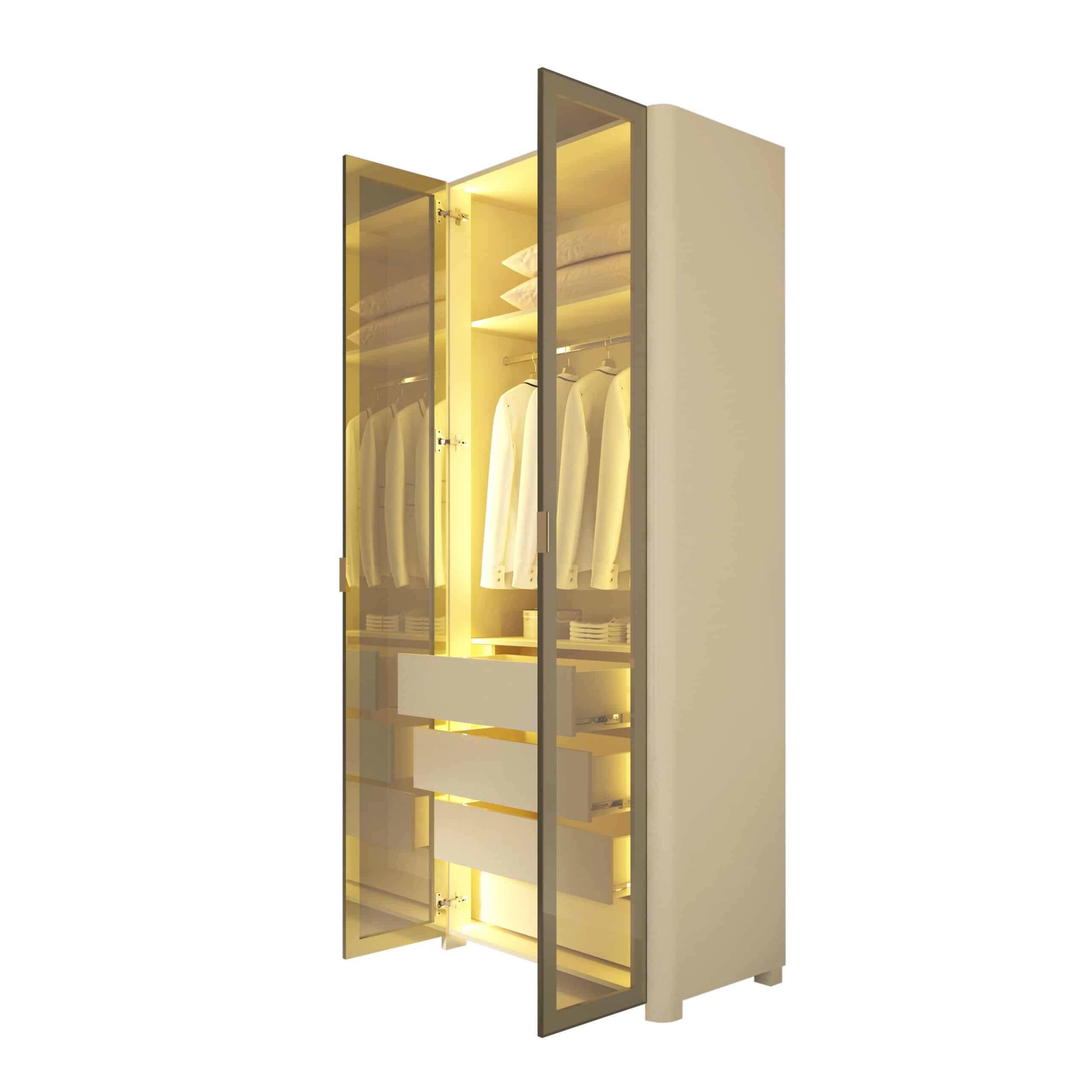 O Roupeiro Innova 2 Portas Reflecta combina design sofisticado e funcionalidade em um móvel compacto e elegante. Suas portas em vidro Reflecta proporcionam um visual moderno e refinado, destacando o interior iluminado por luz LED em tom quente, que traz aconchego e requinte ao ambiente.
